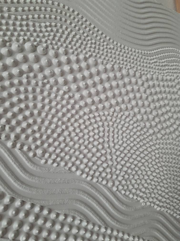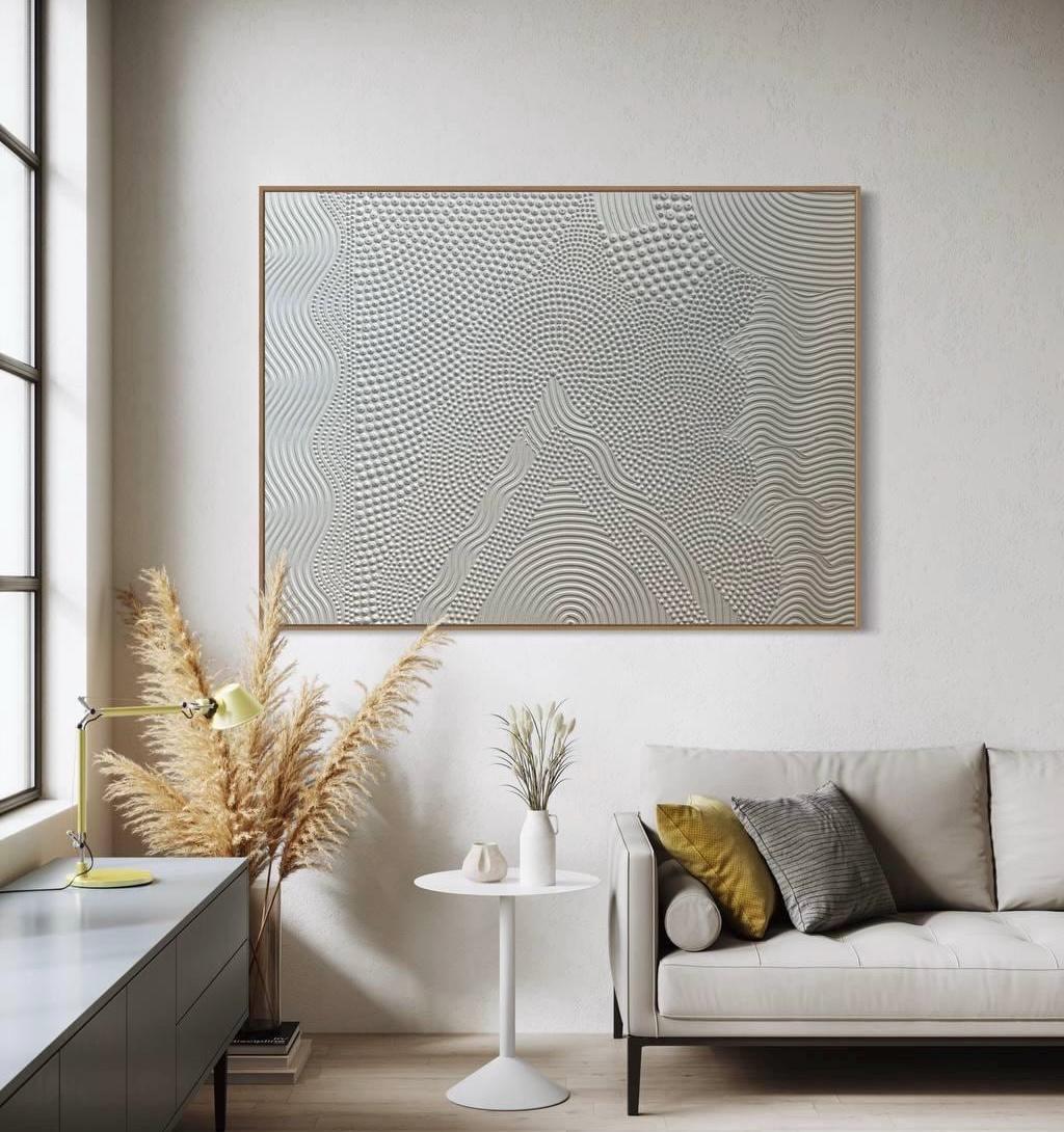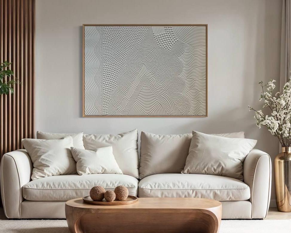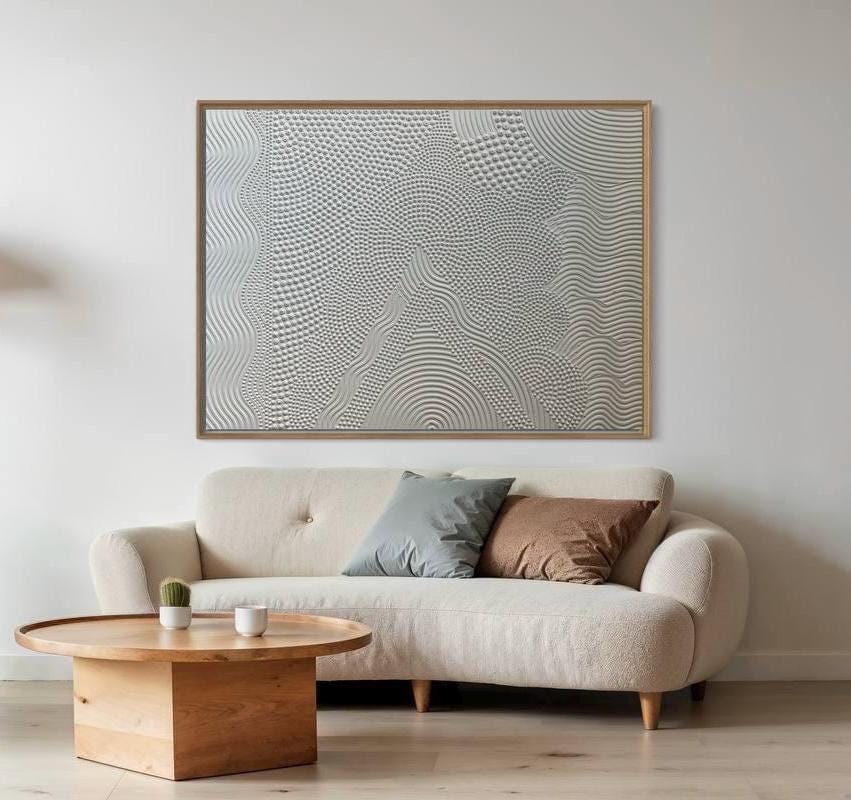 Transform your space with this hand-sculpted, neutral 3D textured wall art, created in calming organic waves and dotted geometric rhythm. Each raised dot and curved relief line is made fully by hand — no prints, no molds — resulting in a tactile, sculptural surface that feels both architectural and soft.