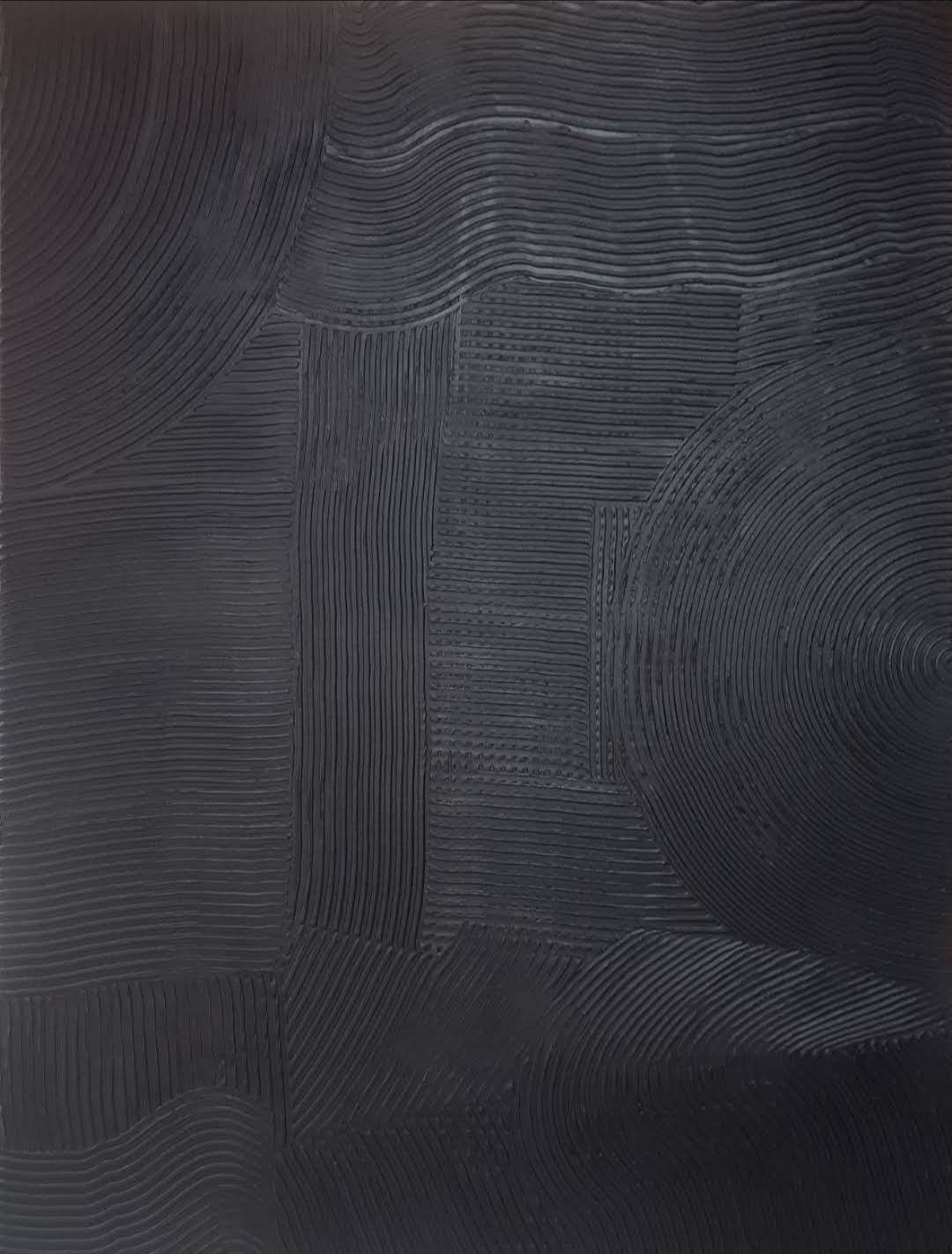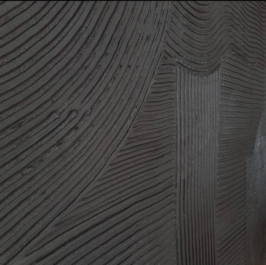This large black textured abstract painting is a bold, sculptural statement piece, entirely handmade using layered texture techniques to create a deep 3D relief surface.