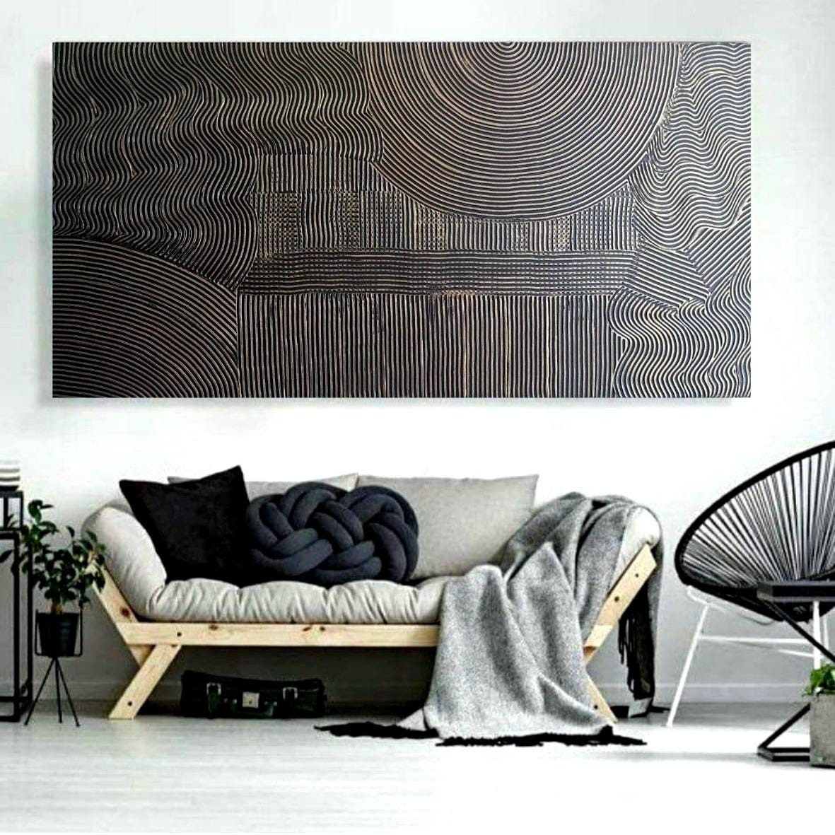 Oversized 3D Textured Abstract Painting: Black Bronze Lines, Modern Wall Art
