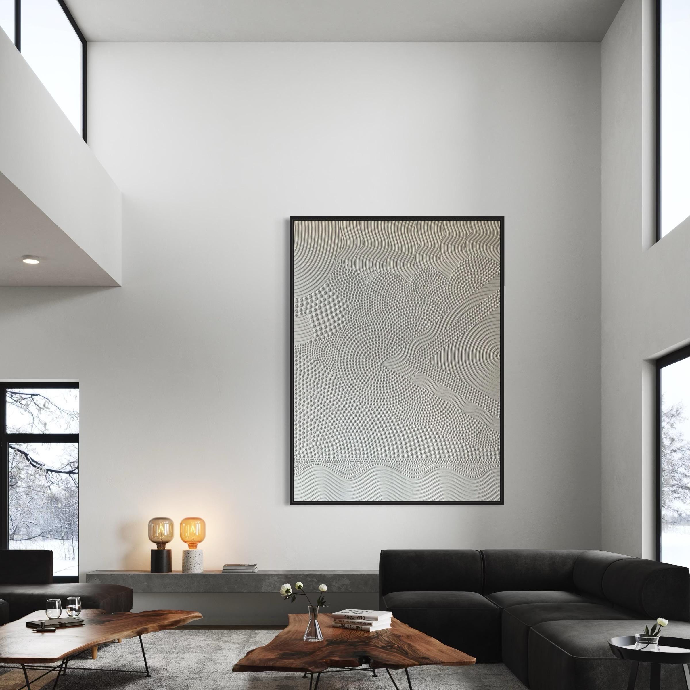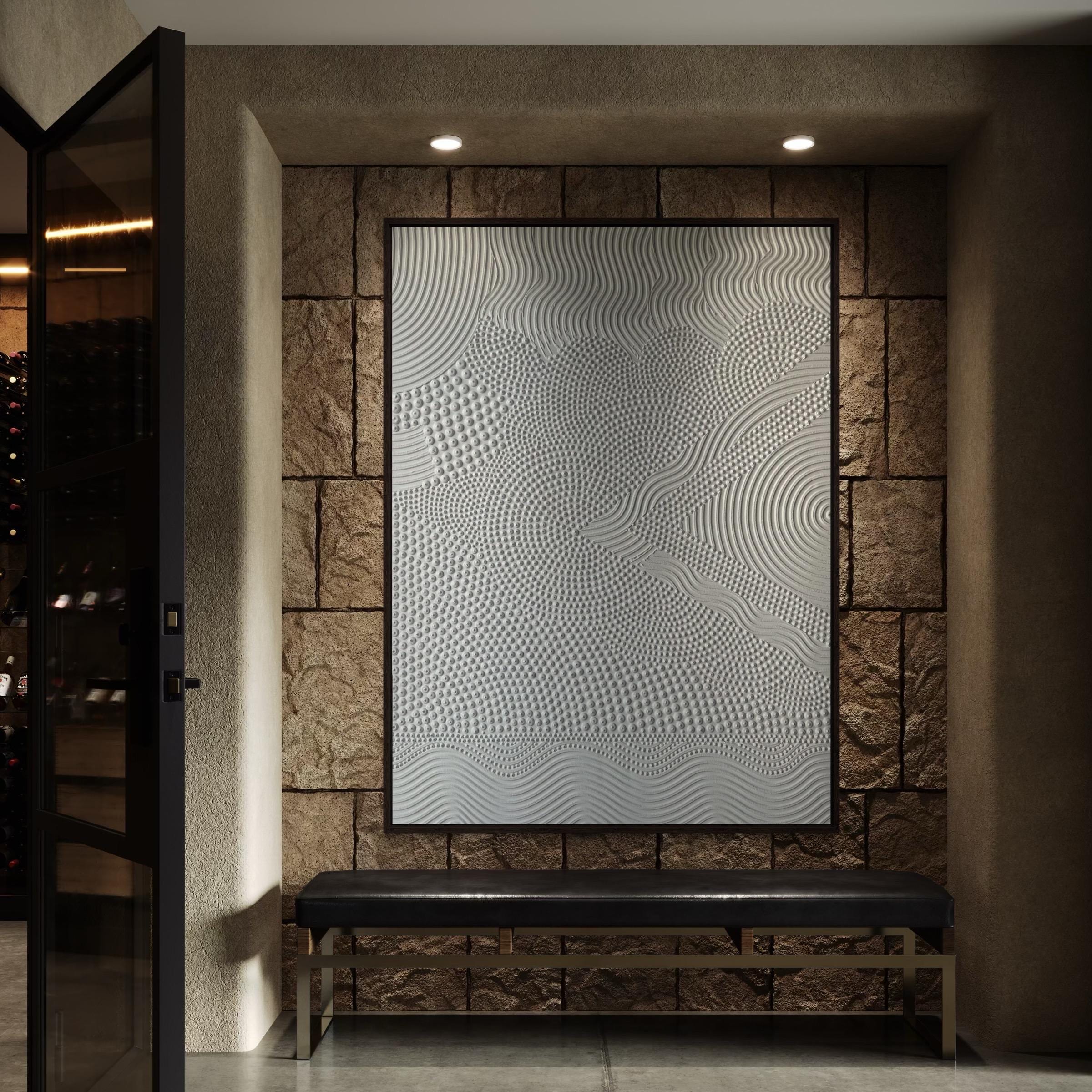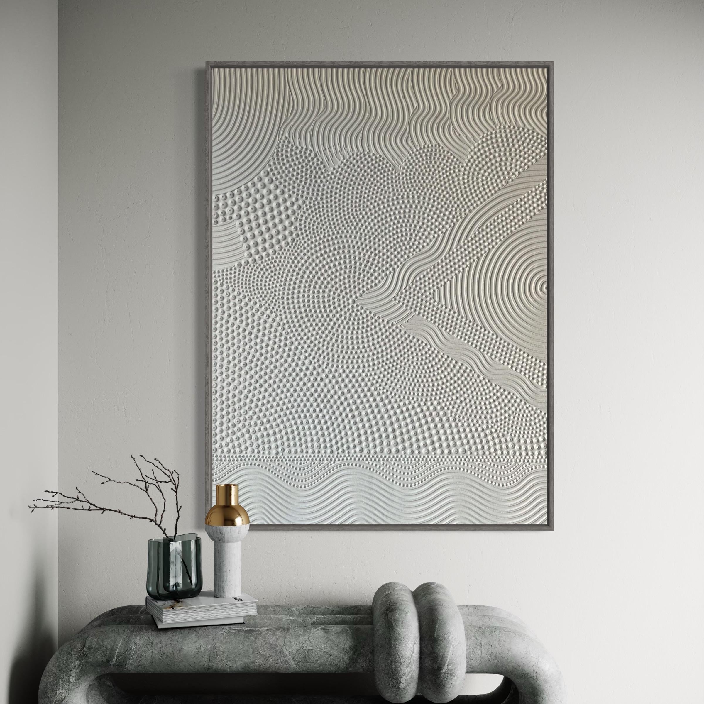 The matte white-neutral palette brings serenity, balance and minimalist clarity, making this artwork ideal for interiors where texture speaks louder than color. The flowing lines evoke sand patterns, ocean movement, zen gardens and organic landscapes, bringing a soothing grounding presence into any room.