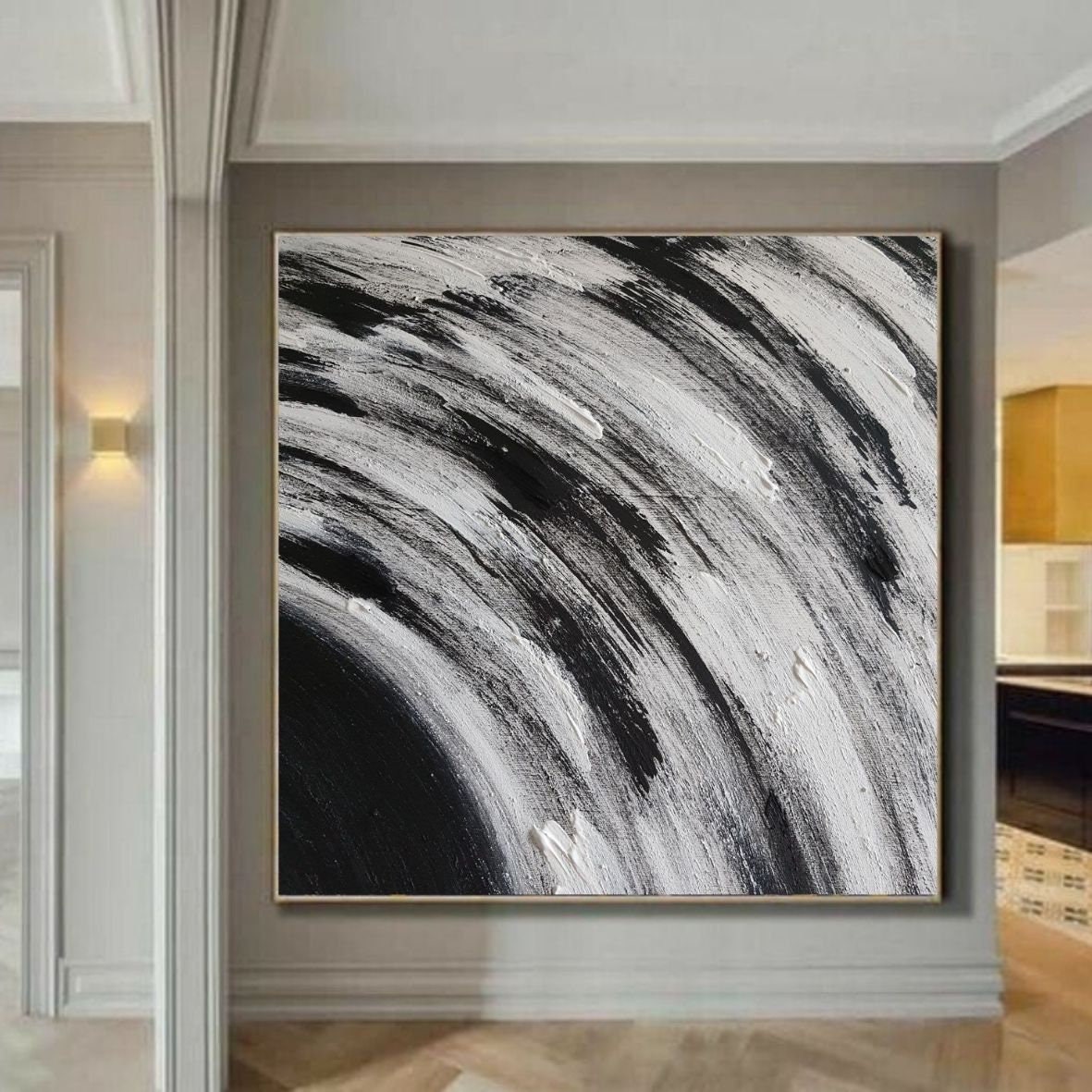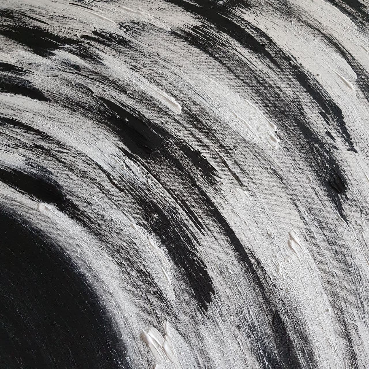 This large black and white abstract textured painting is a bold, modern statement artwork, created entirely by hand using textured techniques to achieve a rich 3D surface.