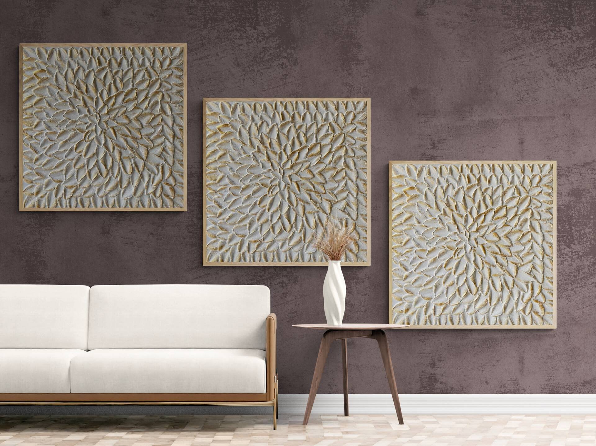 Oversize white gold set of 3 wall art, heavy rich texture abstract wall art, extra large modern original canvas, handmade panel wall decor