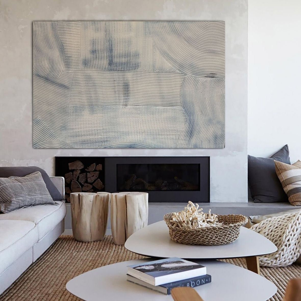 Its white and blue palette makes it incredibly versatile — blending effortlessly into modern, minimalist, Japandi, wabi-sabi, Scandinavian, and contemporary interiors. Light interacts beautifully with the textured surface, changing the artwork’s character throughout the day.