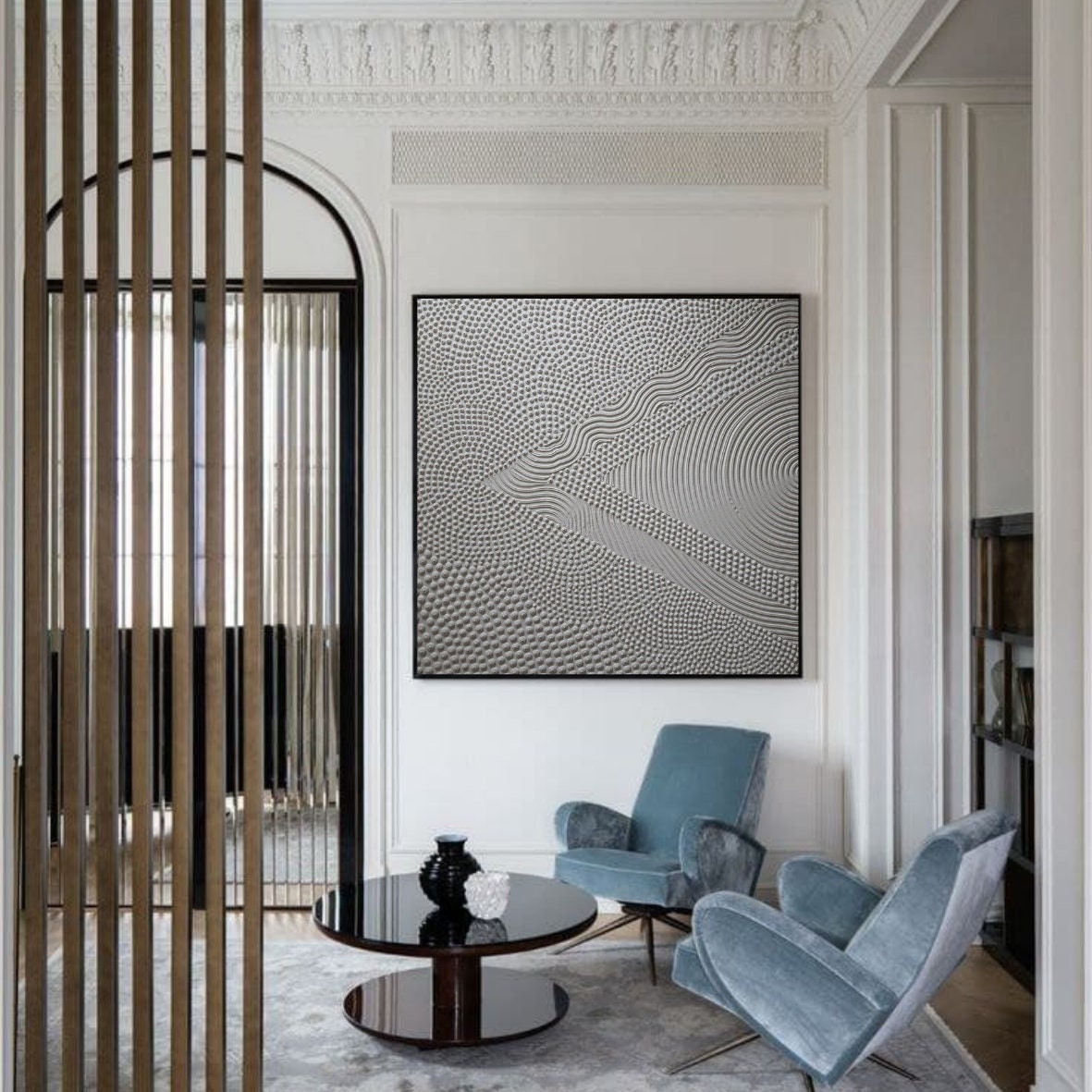 The matte white-neutral palette brings serenity, balance and minimalist clarity, making this artwork ideal for interiors where texture speaks louder than color. The flowing lines evoke sand patterns, ocean movement, zen gardens and organic landscapes, bringing a soothing grounding presence into any room.