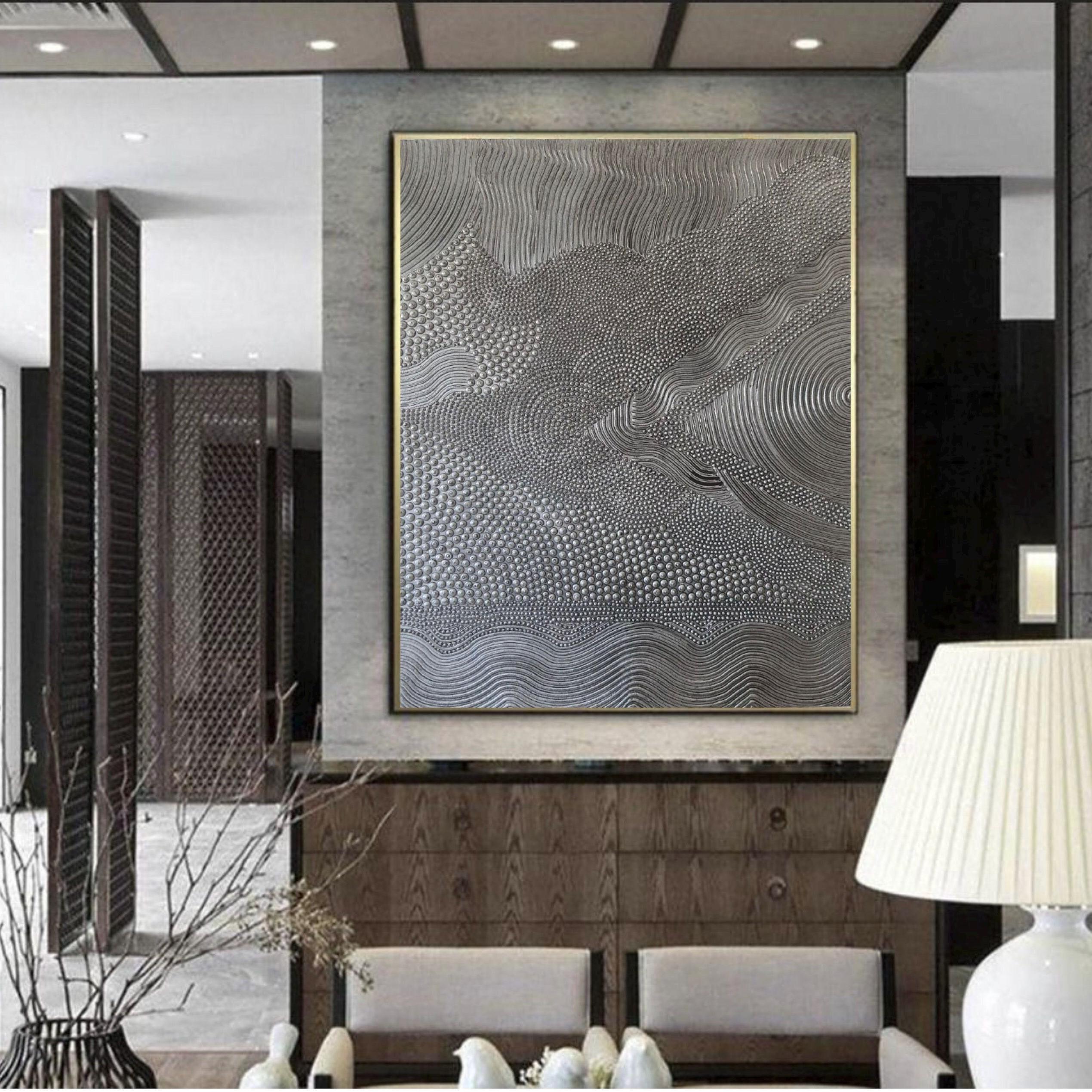 Large Silver Textured Abstract Wall Art, 3D Dot Painting, Handmade Patina Metallic Canvas Art
