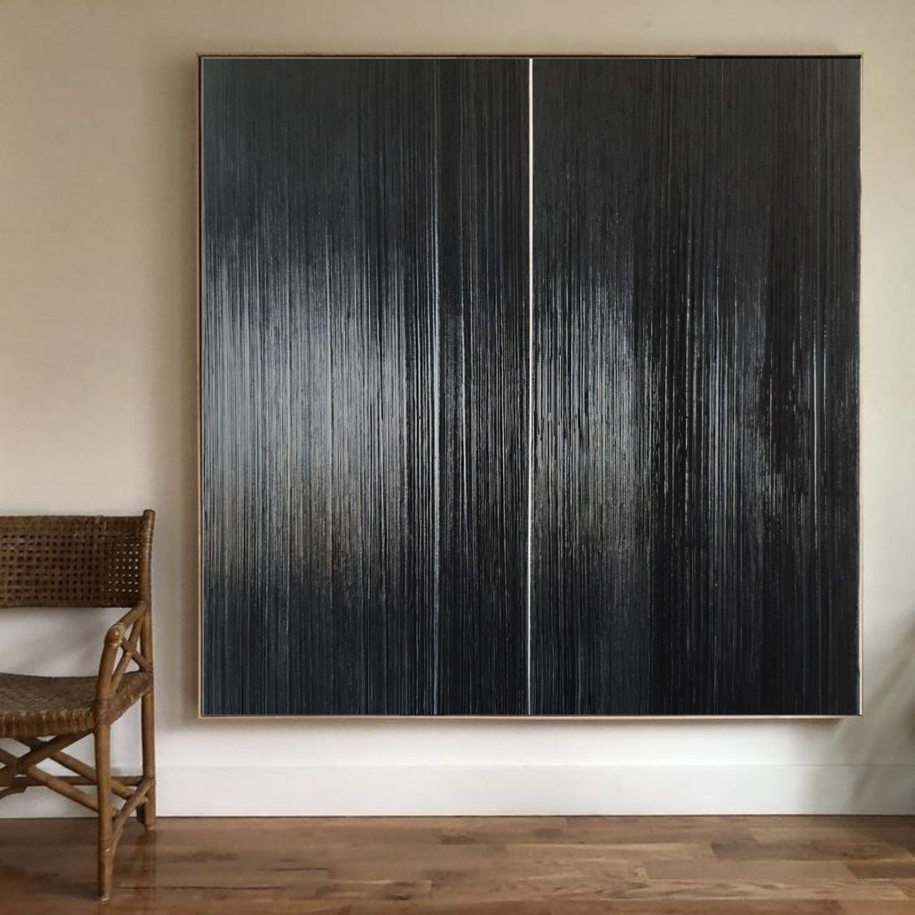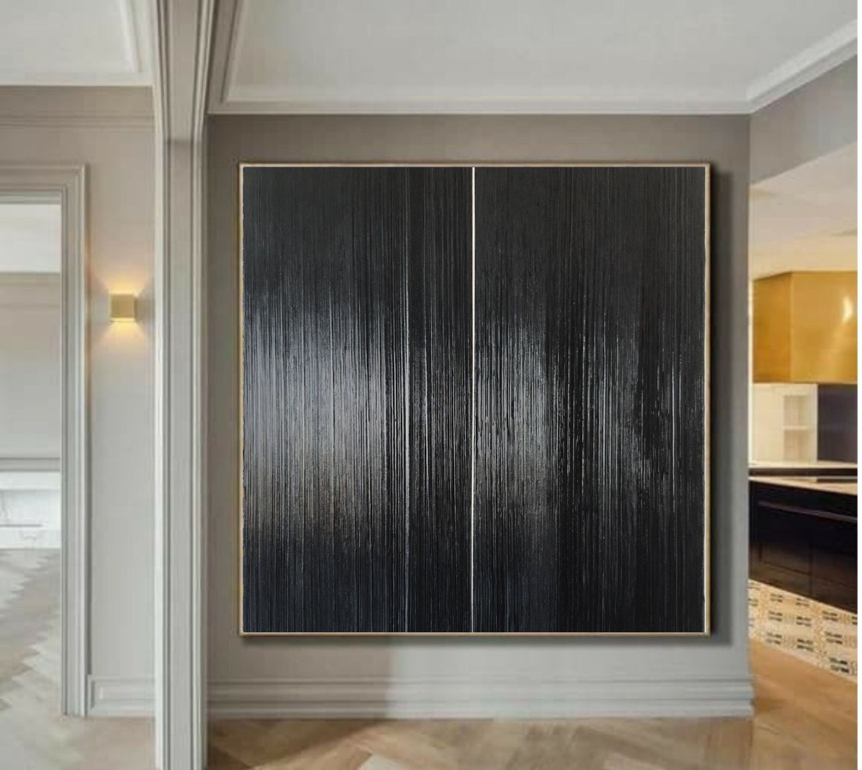 This large black textured abstract painting is a bold, sculptural statement piece, entirely handmade using layered texture techniques to create a deep 3D relief surface.
