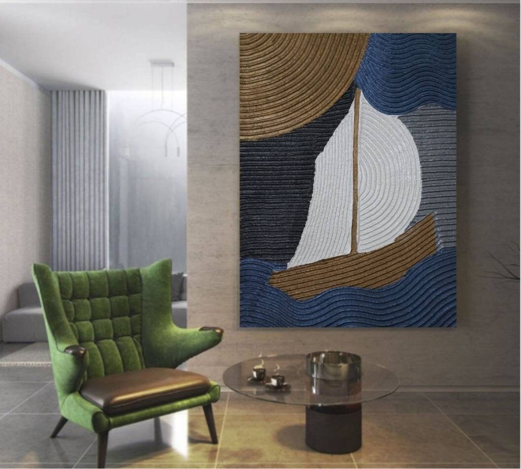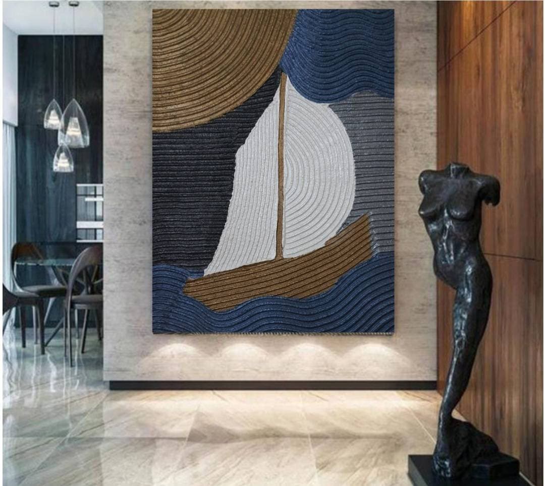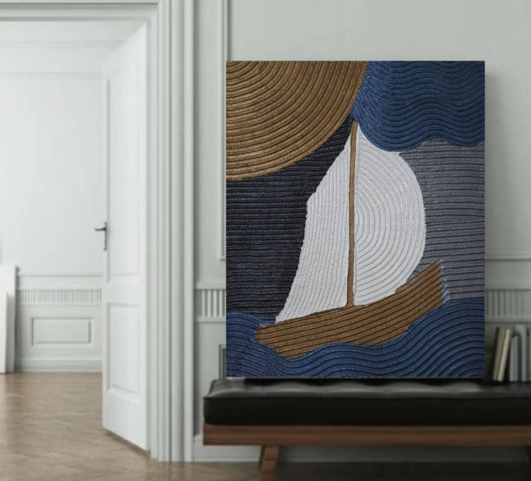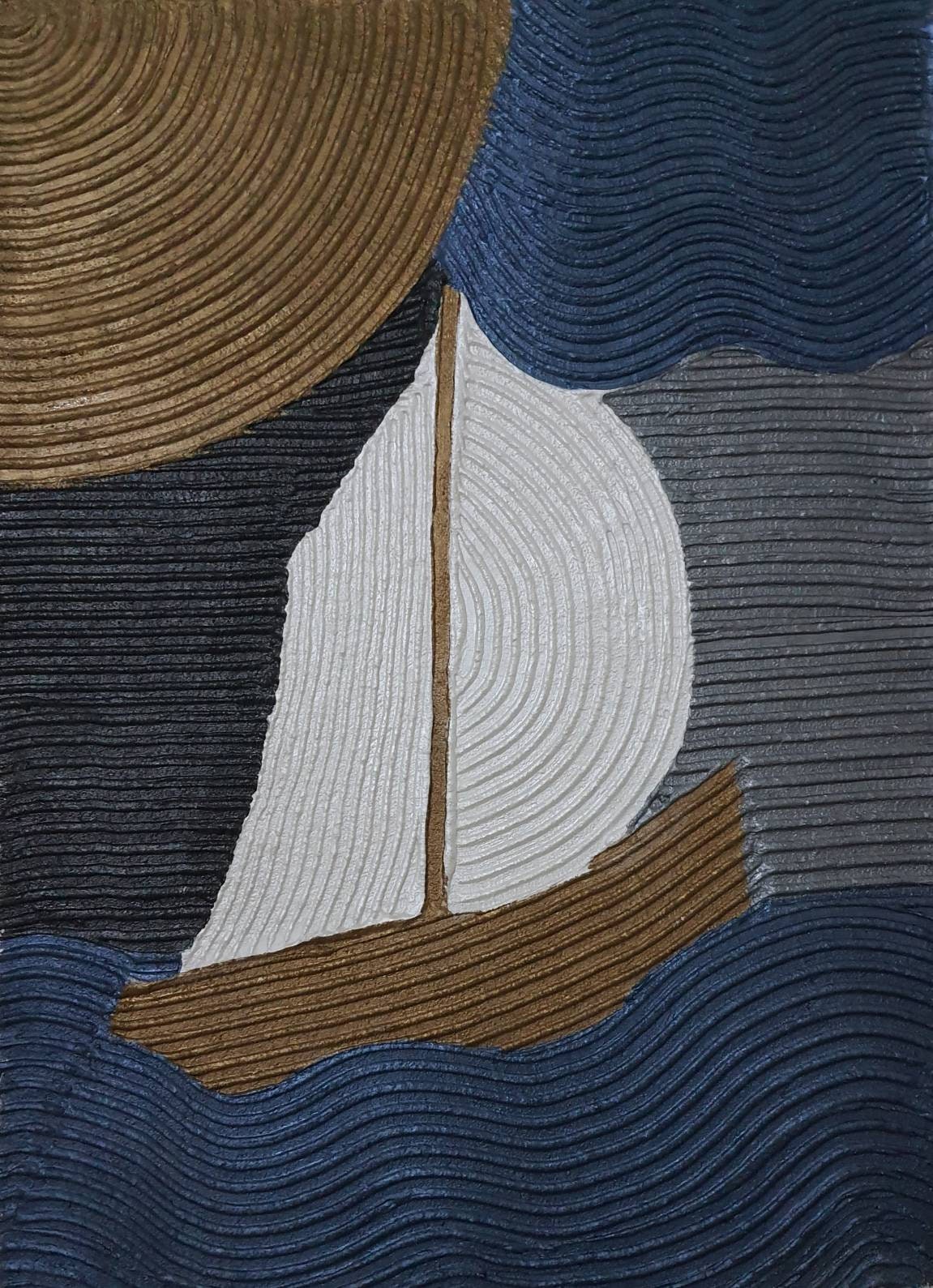 Handmade textured abstract sailboat painting created with sculptural plaster technique.