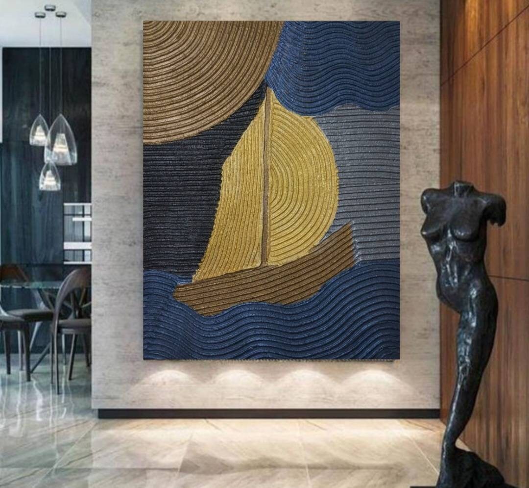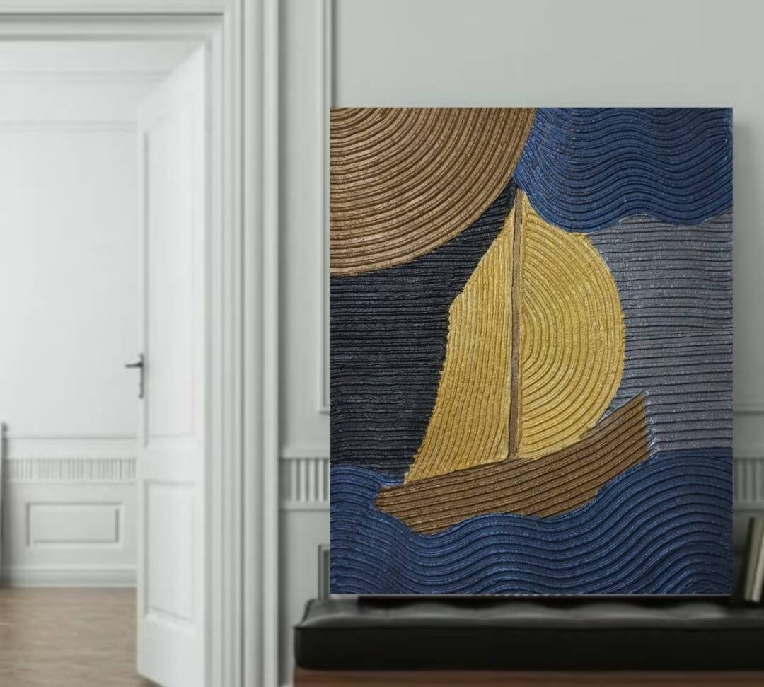 The artwork features deep blue waves and metallic gold accents, forming a modern minimalist sailboat composition with strong 3D texture.