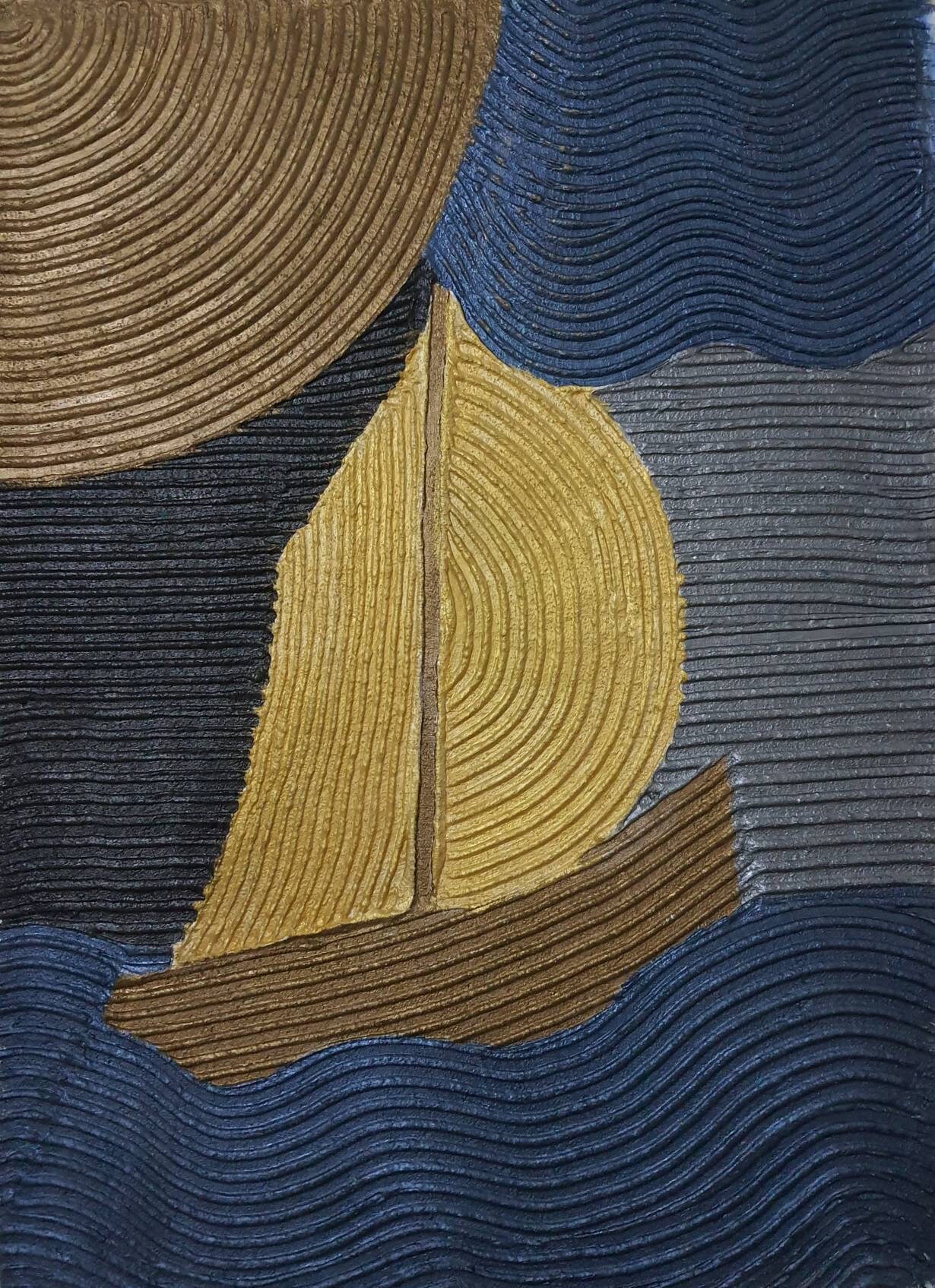 Handmade textured abstract sailboat painting created with sculptural plaster technique.