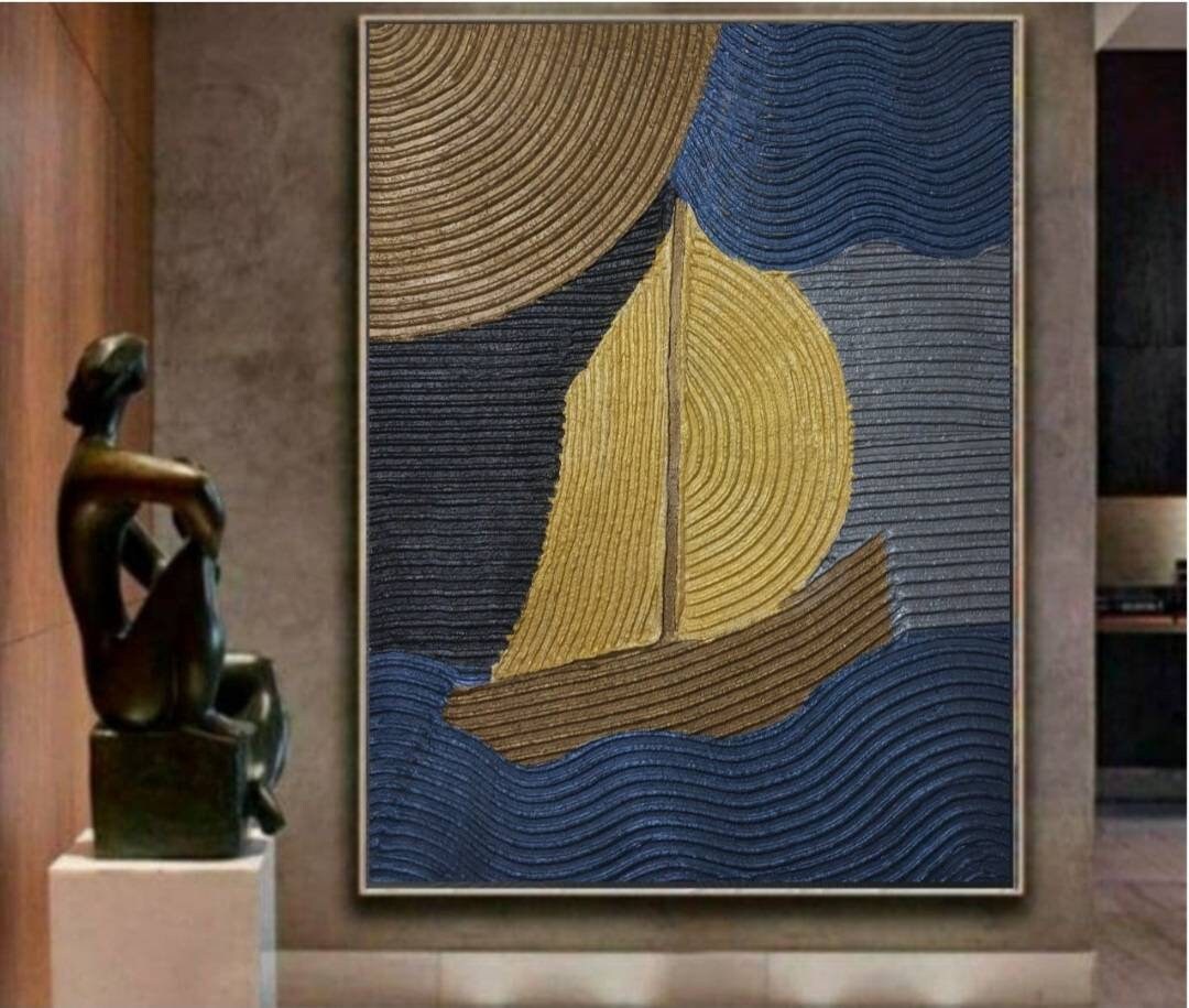 Textured Sailboat Painting, Blue Gold Plaster Art, Modern Coastal Wall Decor