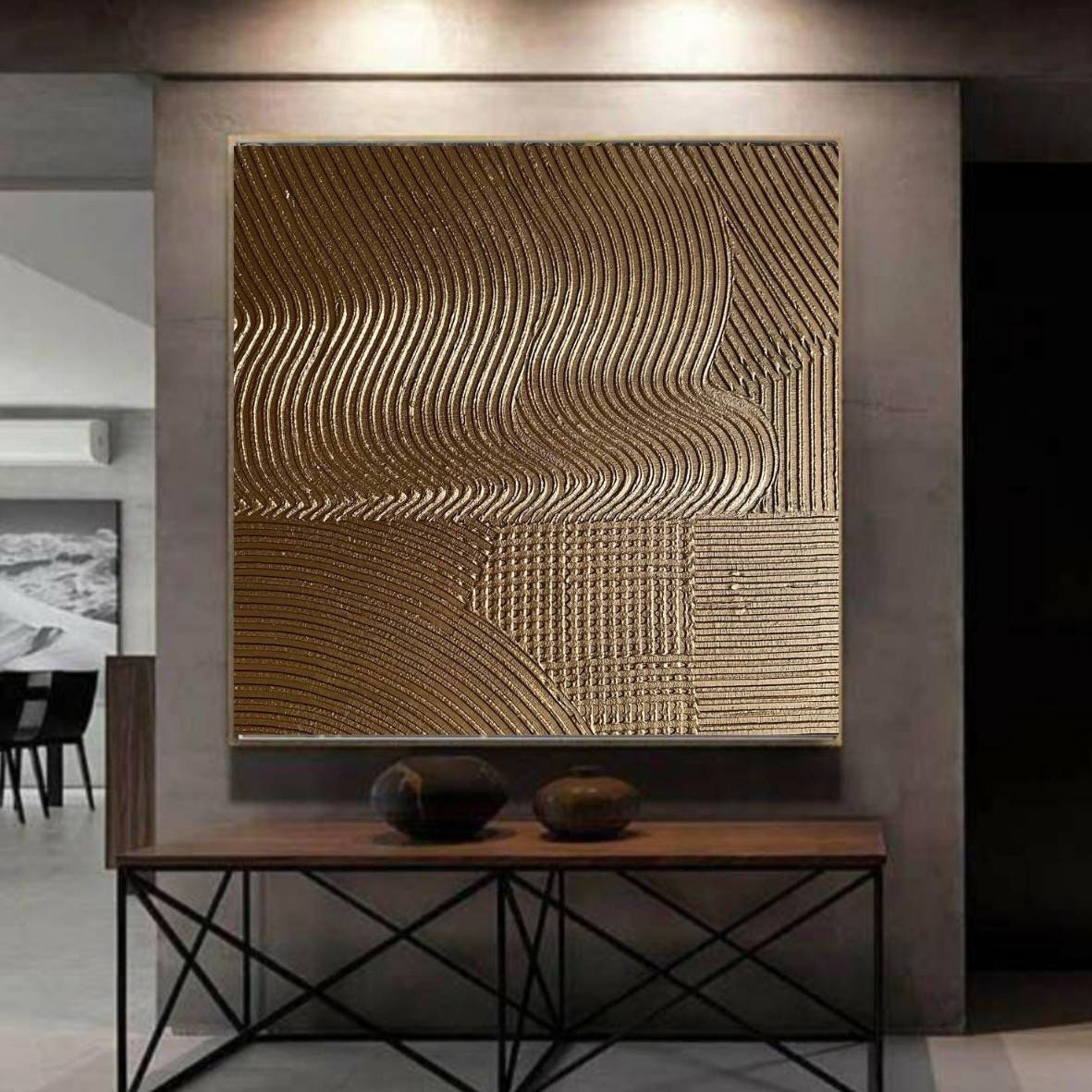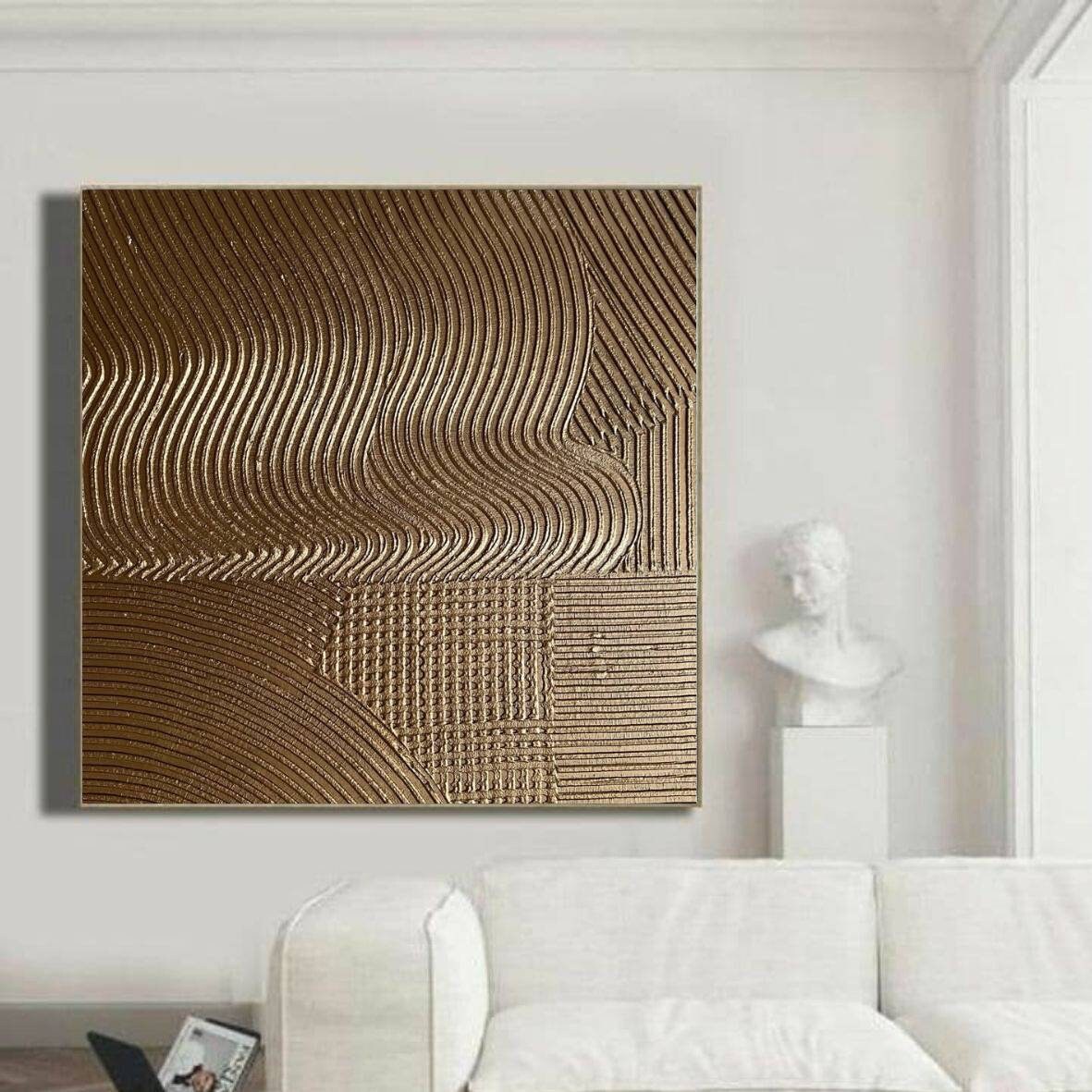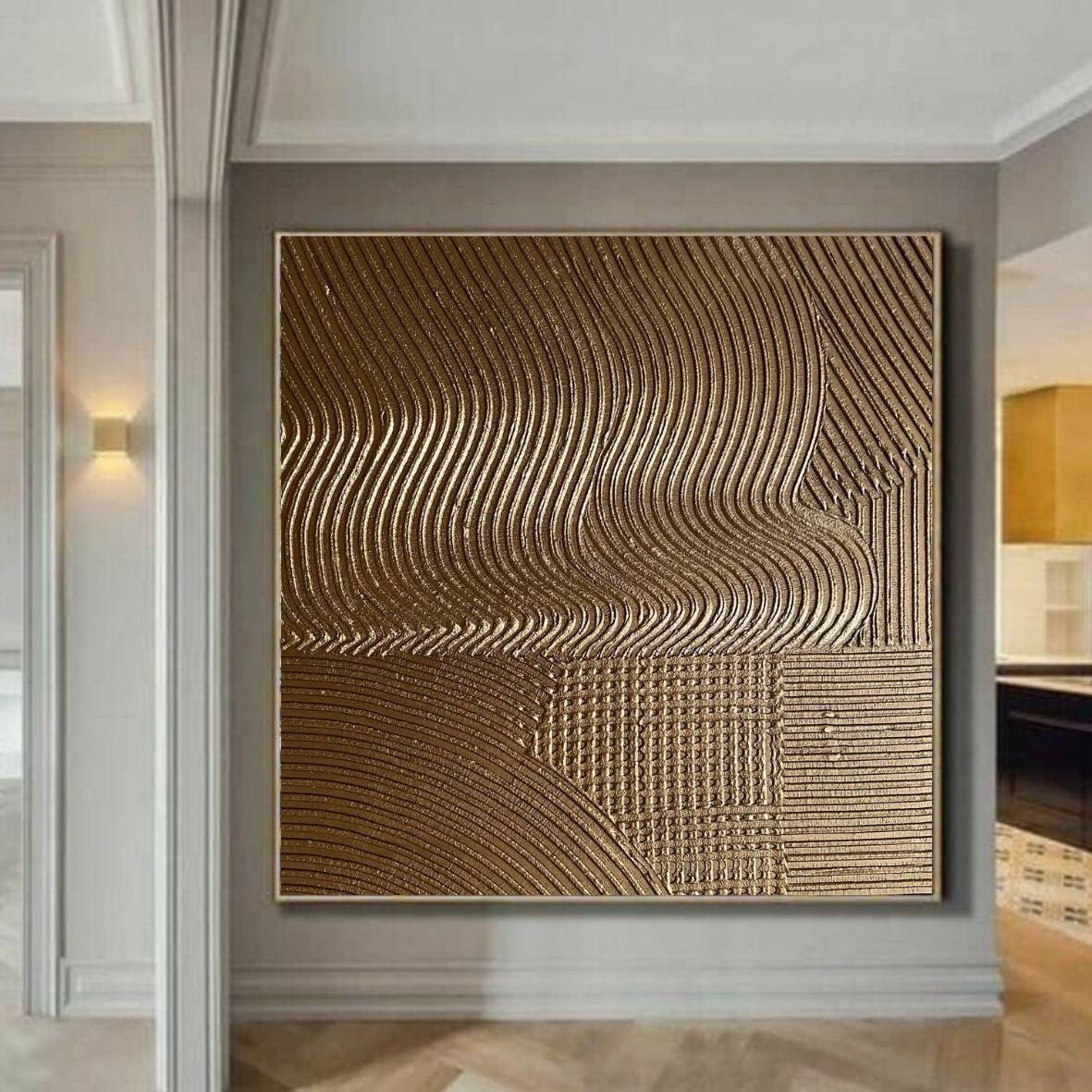 The painting’s warm metallic tones and minimal geometric texture make it a perfect fit for modern, luxury, or neutral interiors — ideal for your living room, bedroom, hallway, or office.