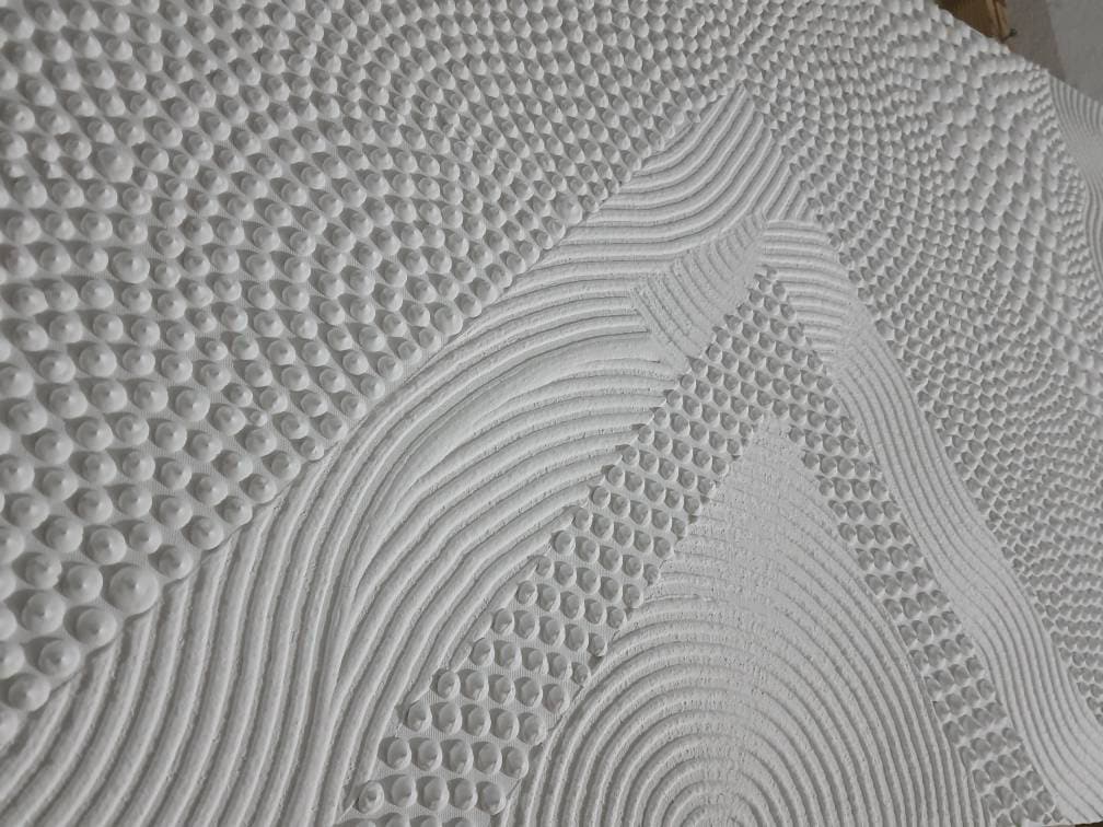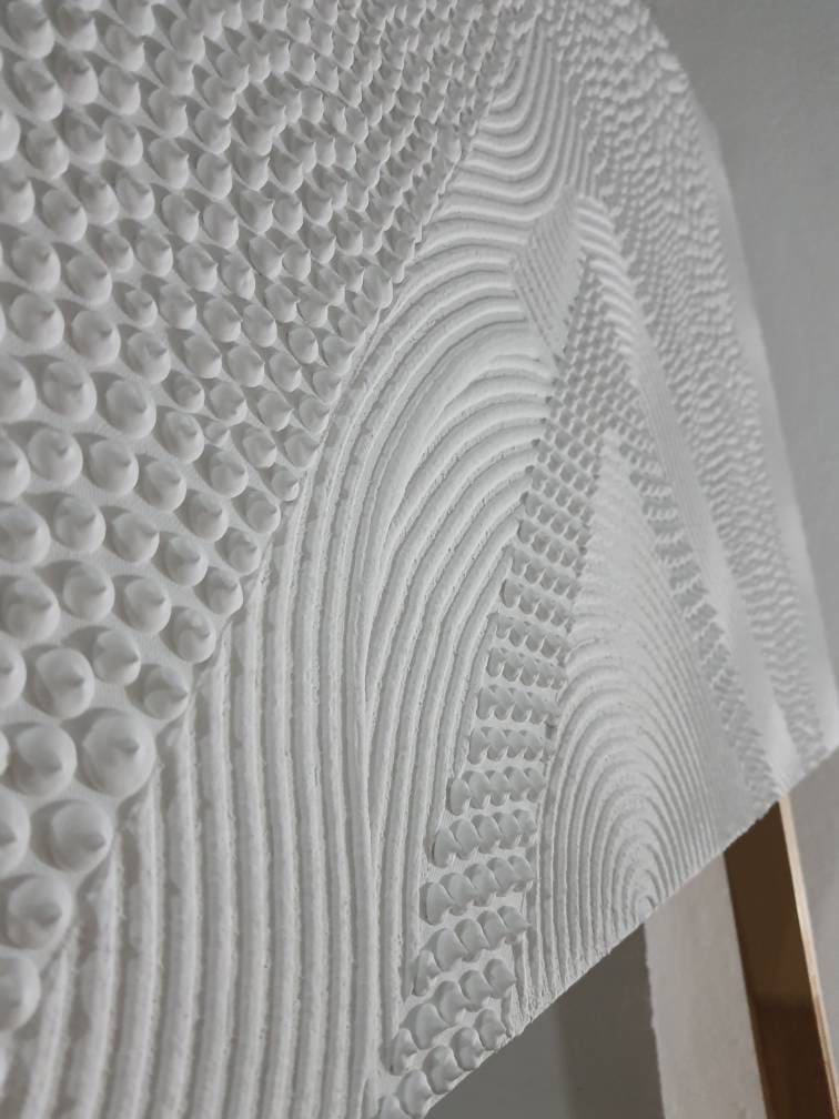 Transform your space with this hand-sculpted, neutral 3D textured wall art, created in calming organic waves and dotted geometric rhythm. Each raised dot and curved relief line is made fully by hand — no prints, no molds — resulting in a tactile, sculptural surface that feels both architectural and soft.