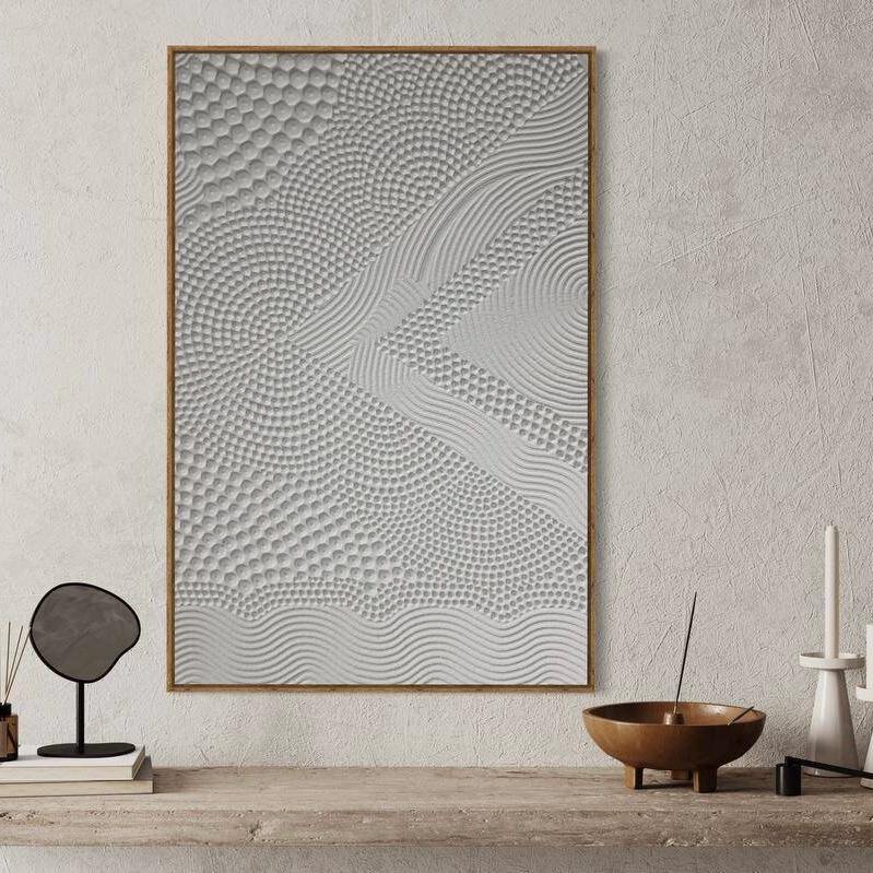 The matte white-neutral palette brings serenity, balance and minimalist clarity, making this artwork ideal for interiors where texture speaks louder than color. The flowing lines evoke sand patterns, ocean movement, zen gardens and organic landscapes, bringing a soothing grounding presence into any room.
