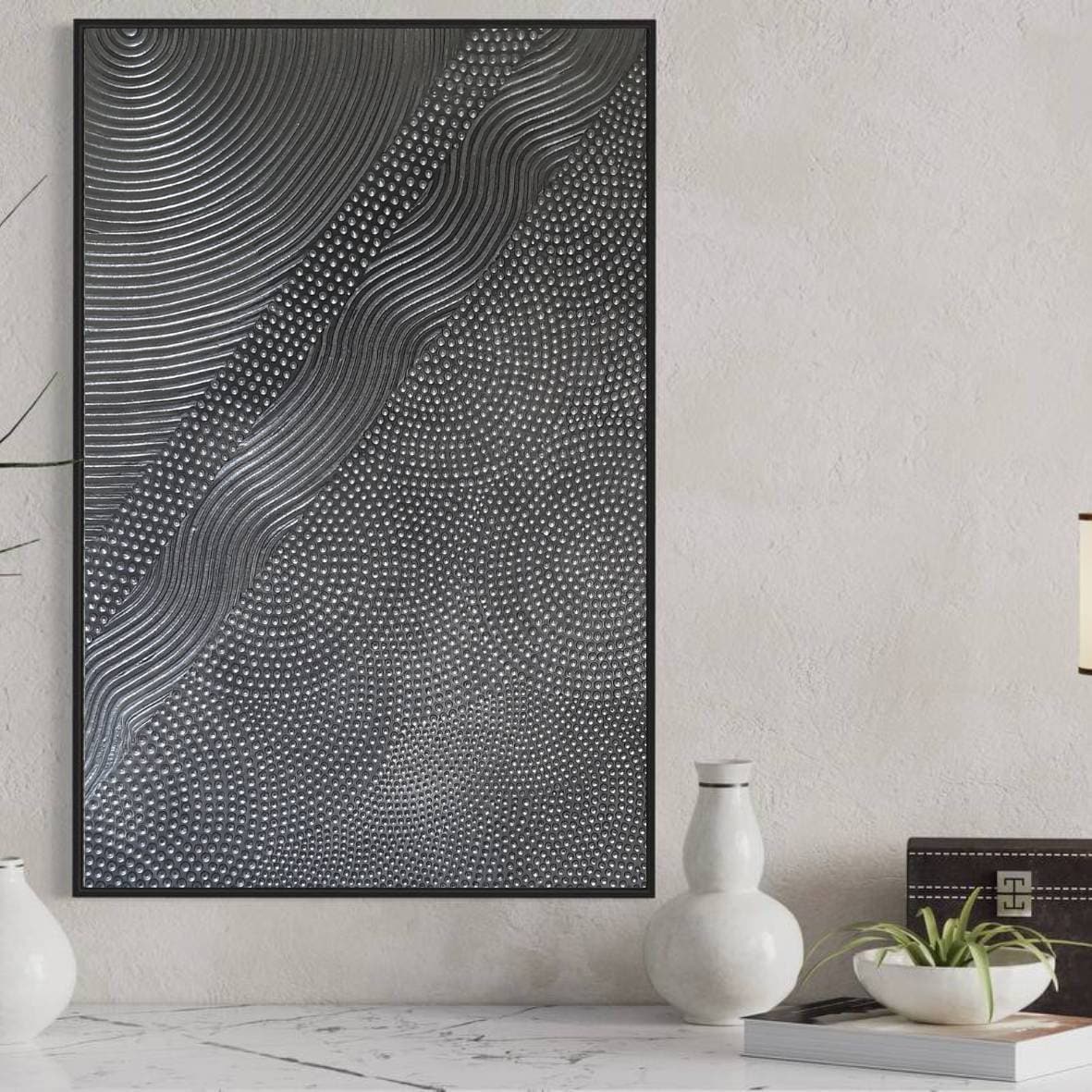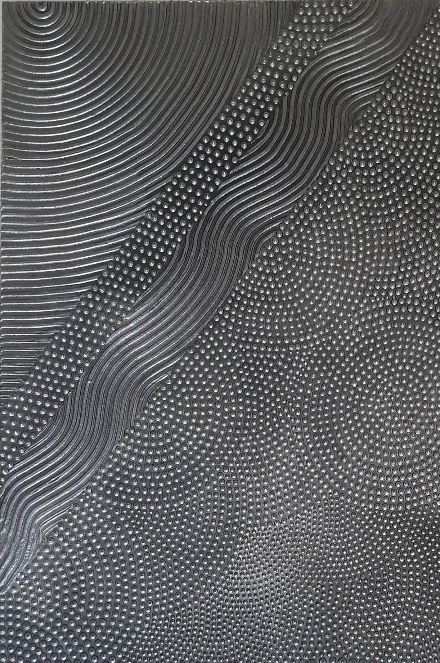 The surface is created with raised 3D dot texture and flowing relief lines, giving the artwork depth, movement, and a refined modern character.