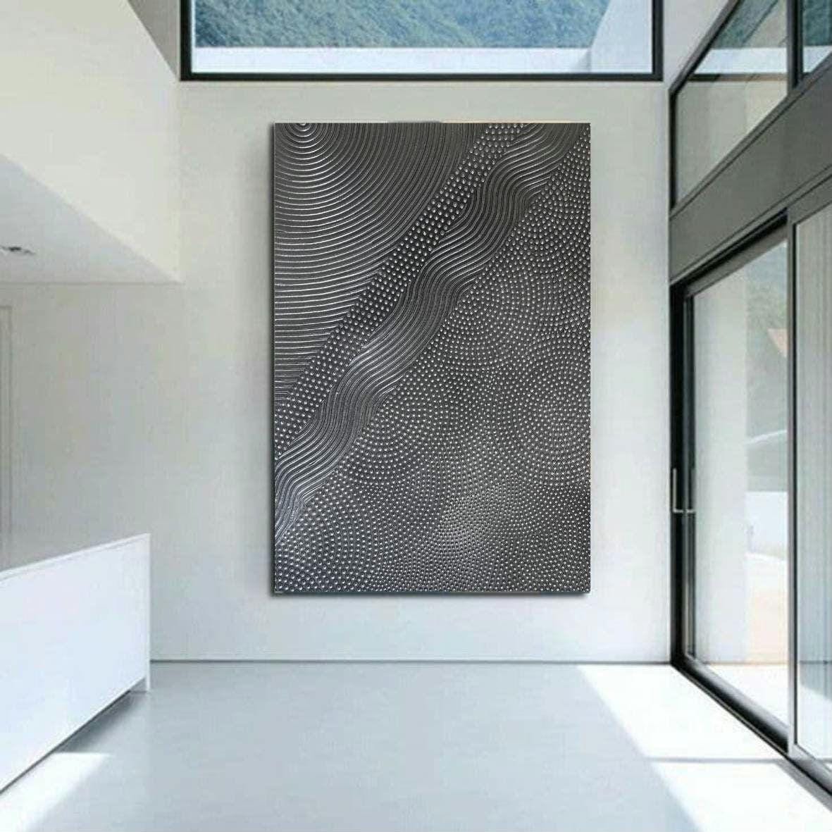 LargeTextured Wall Art Silver &Patina Handmade 3D Dot Painting Oversized Abstract Canvas Home Decor