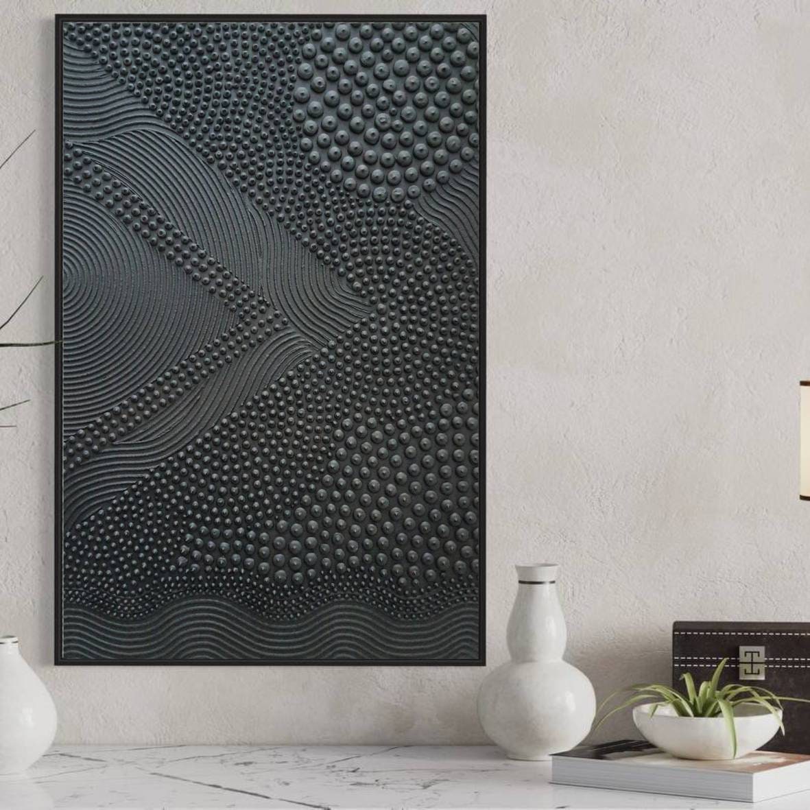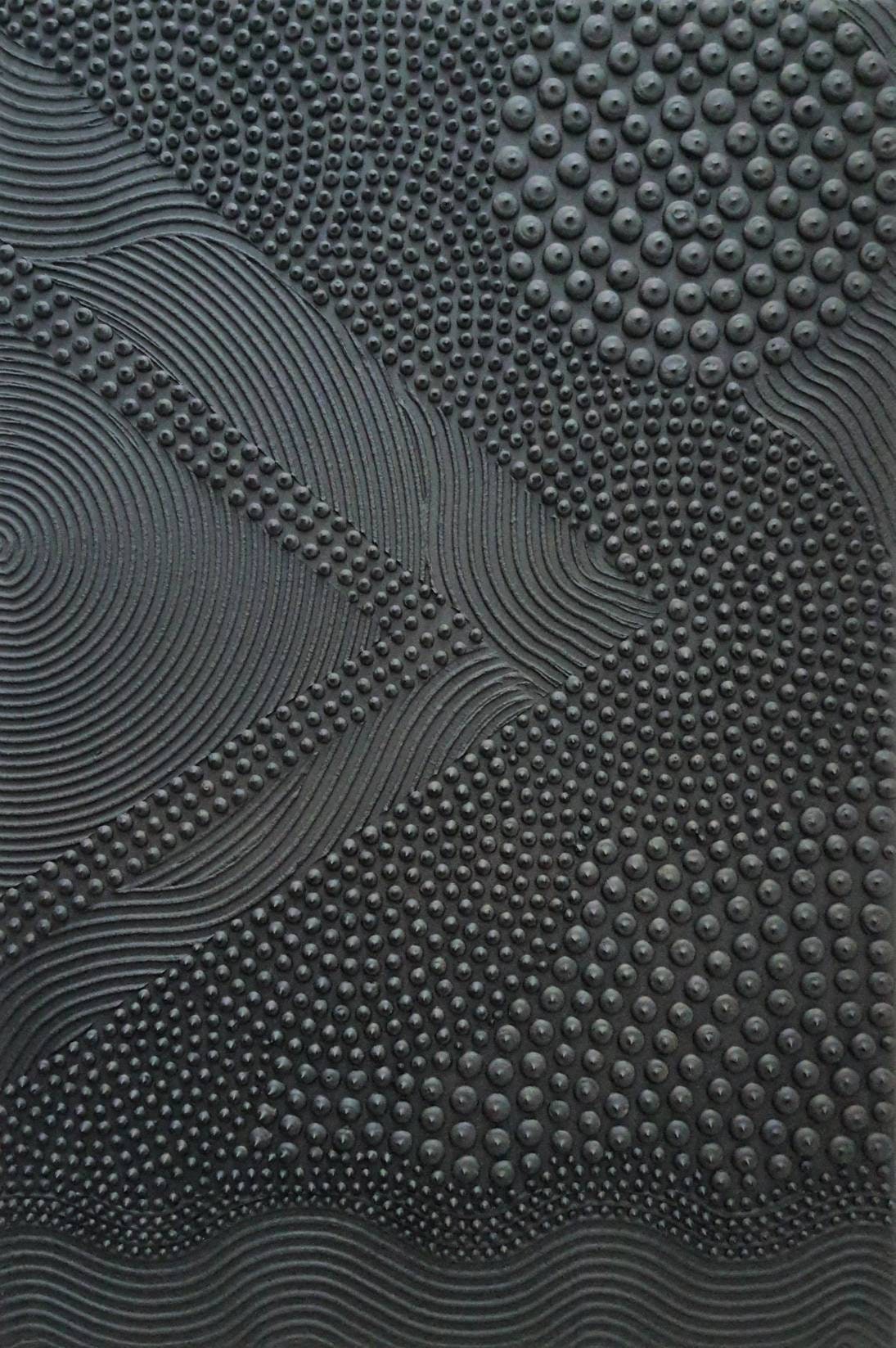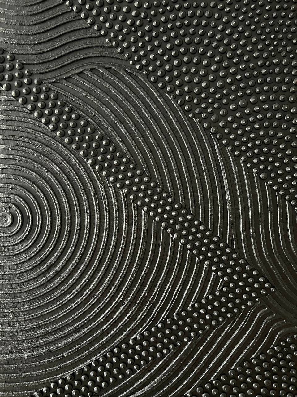 This original handmade artwork is a sculptural plaster painting featuring layered textures, rhythmic curves, and tactile dot patterns. The black color brings balance, making the piece timeless and easy to integrate into refined interiors.