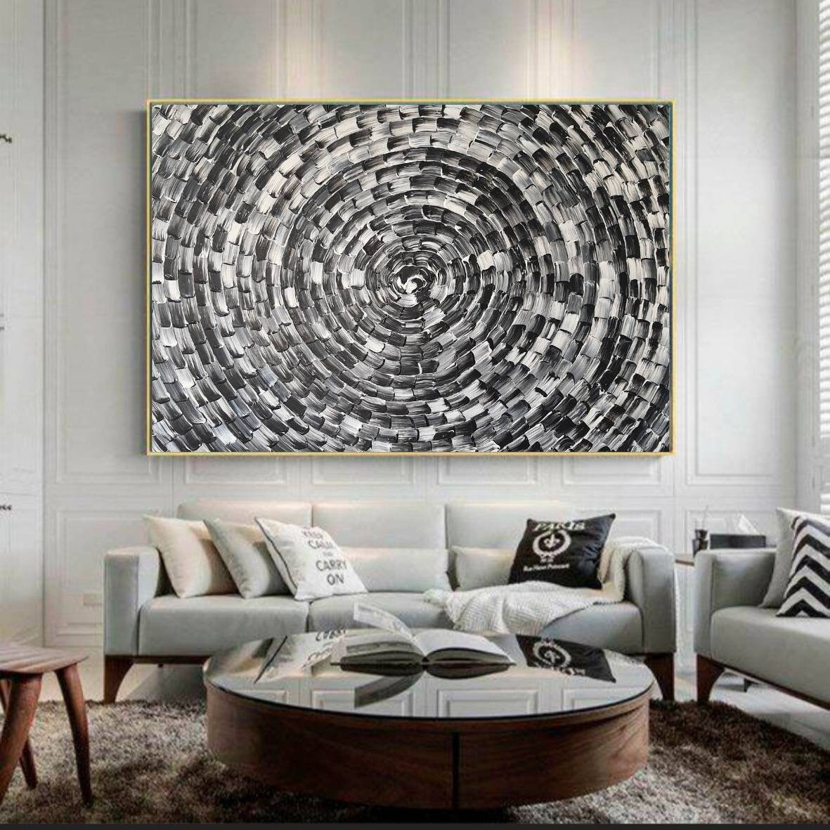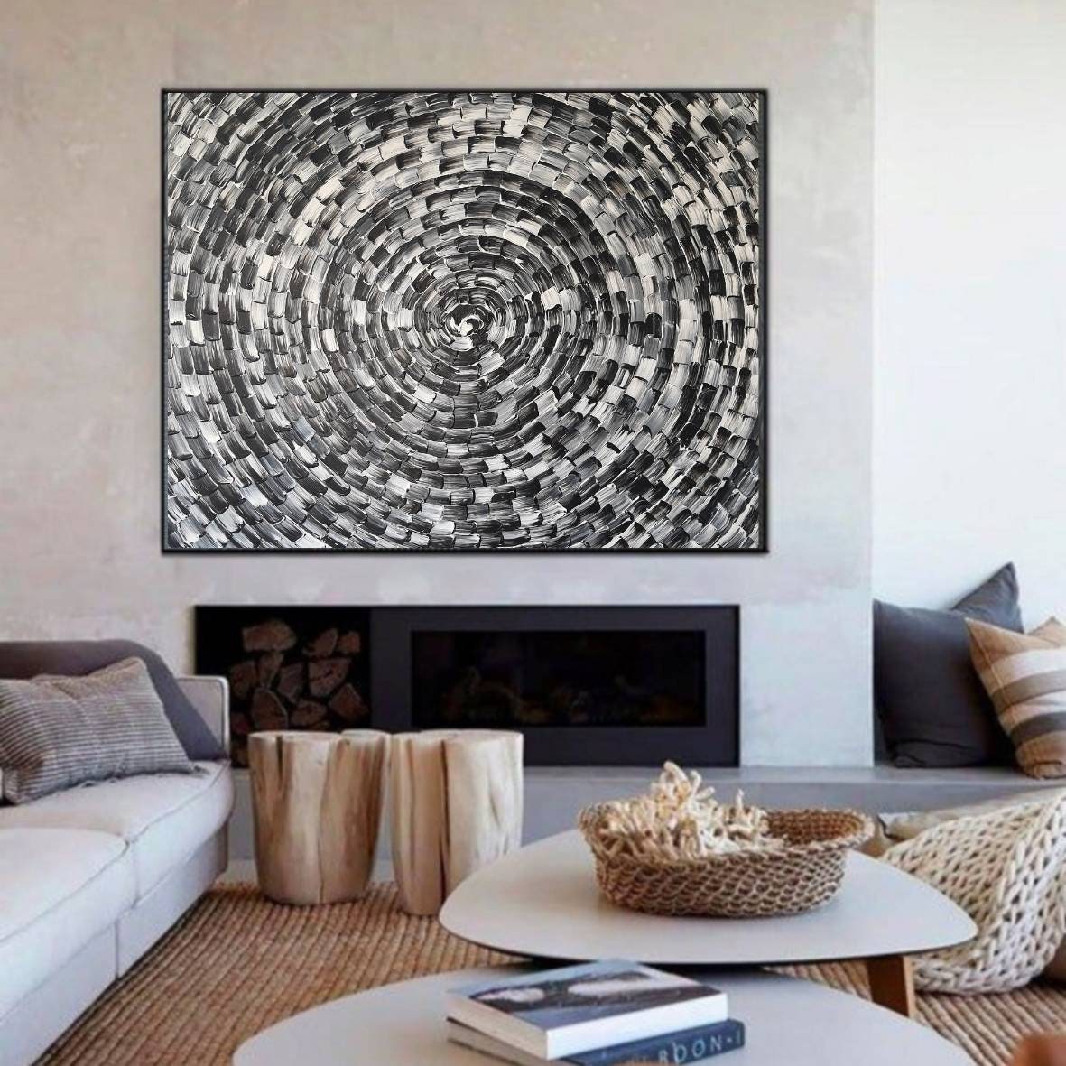 Oversize Black and White Abstract Painting: Original Modern Circle Canvas Art