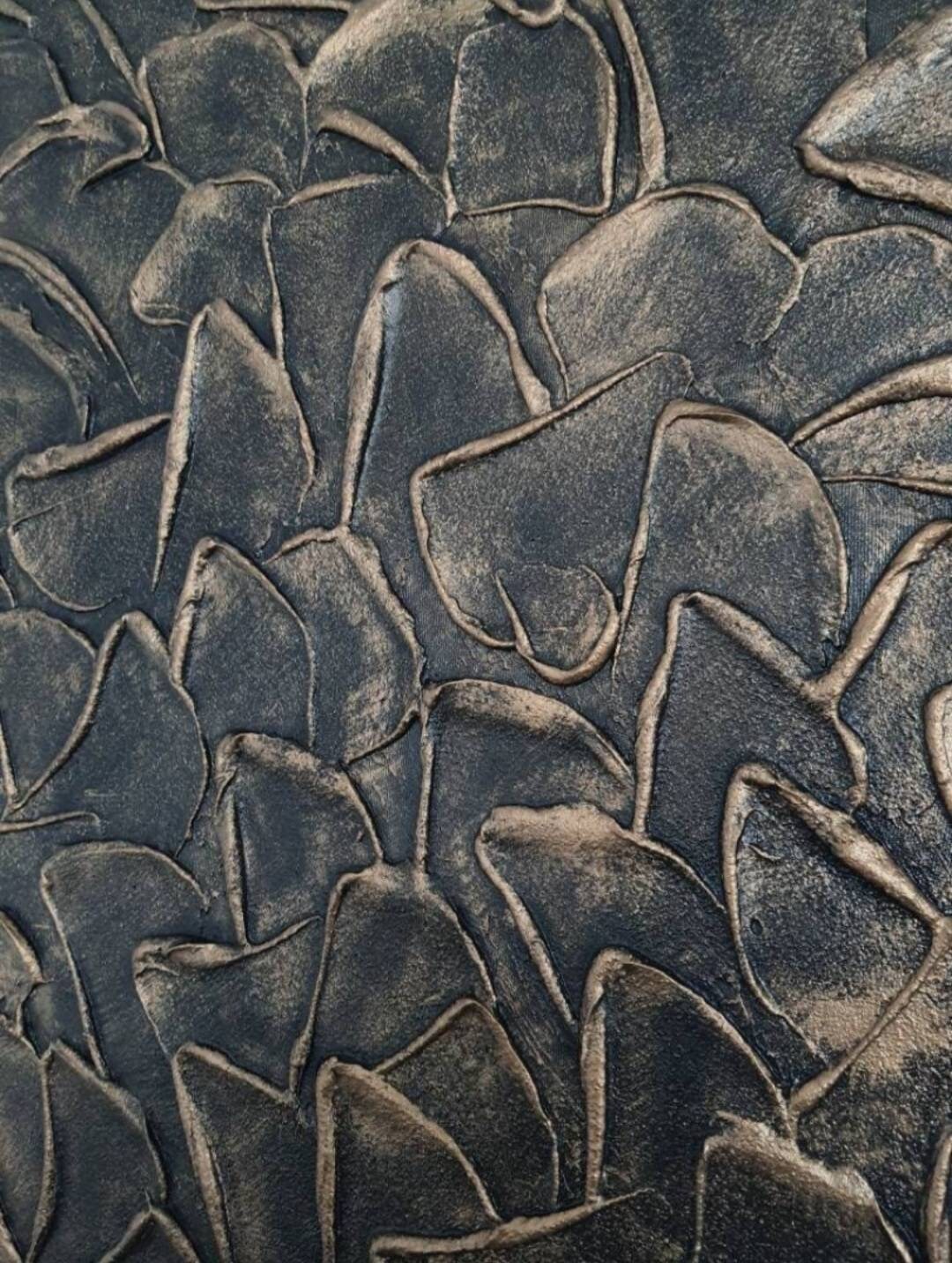 The surface features layered organic patterns black with brass metallic effect, creating depth and a soft reflective sheen depending on the light.