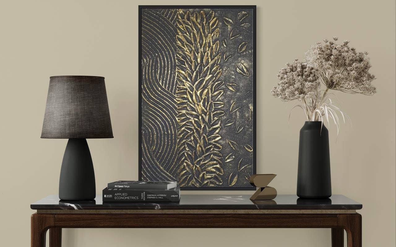 The painting’s warm metallic tones and minimal geometric texture make it a perfect fit for modern, luxury, or neutral interiors — ideal for your living room, bedroom, hallway, or office.
