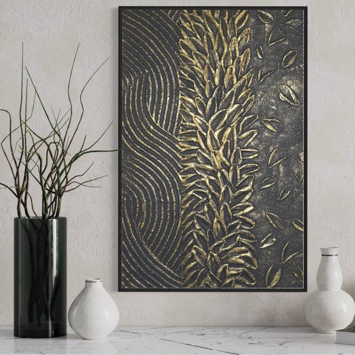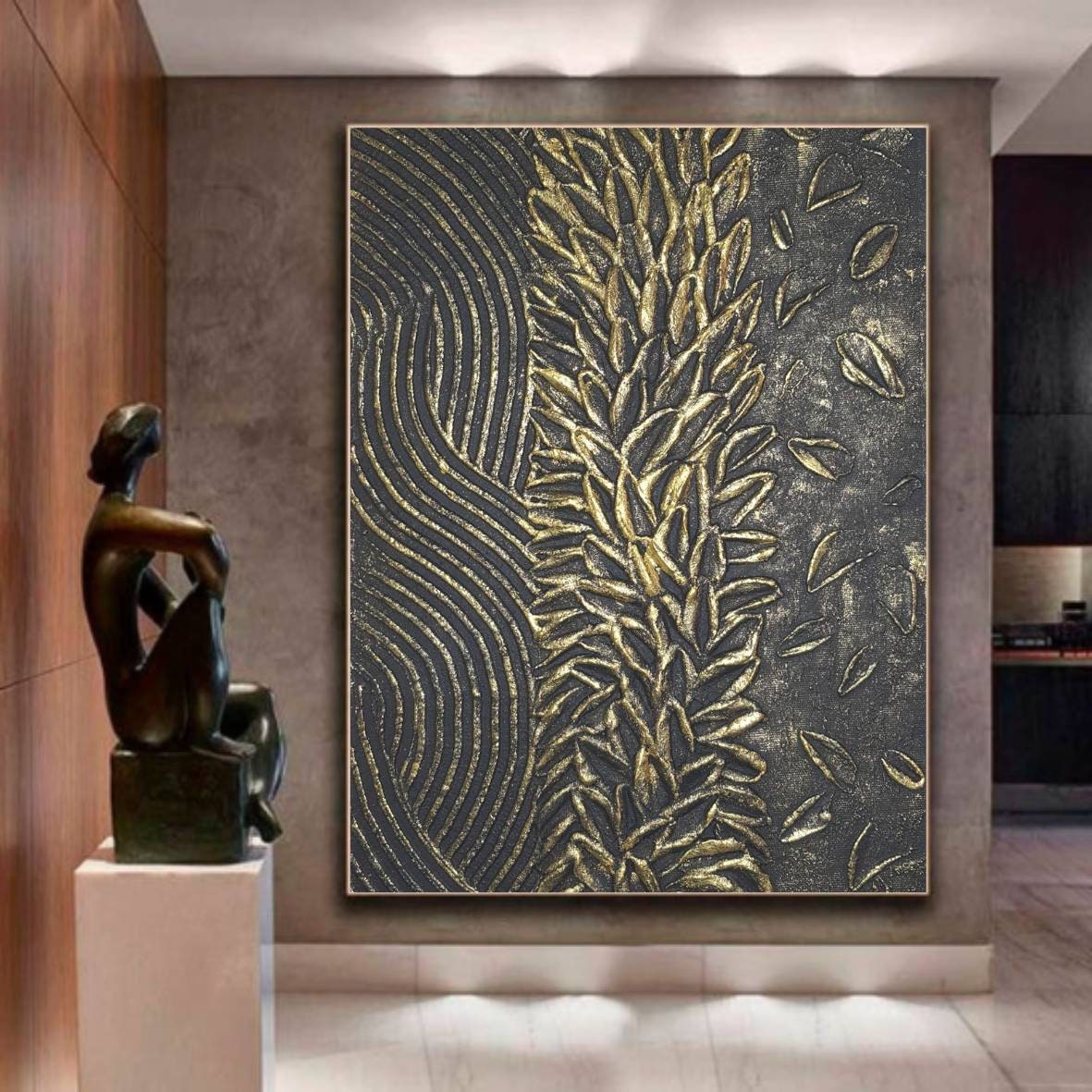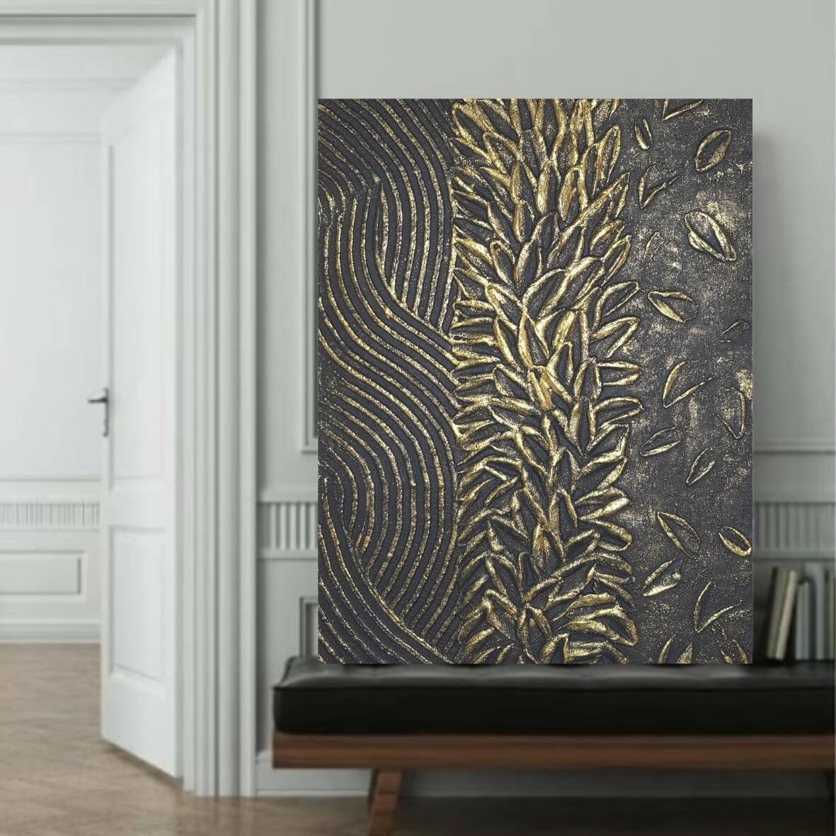 Large 3D Textured Abstract Painting Black & Gold Canvas Plaster Wall Art