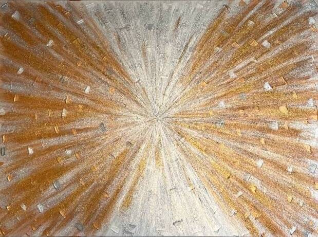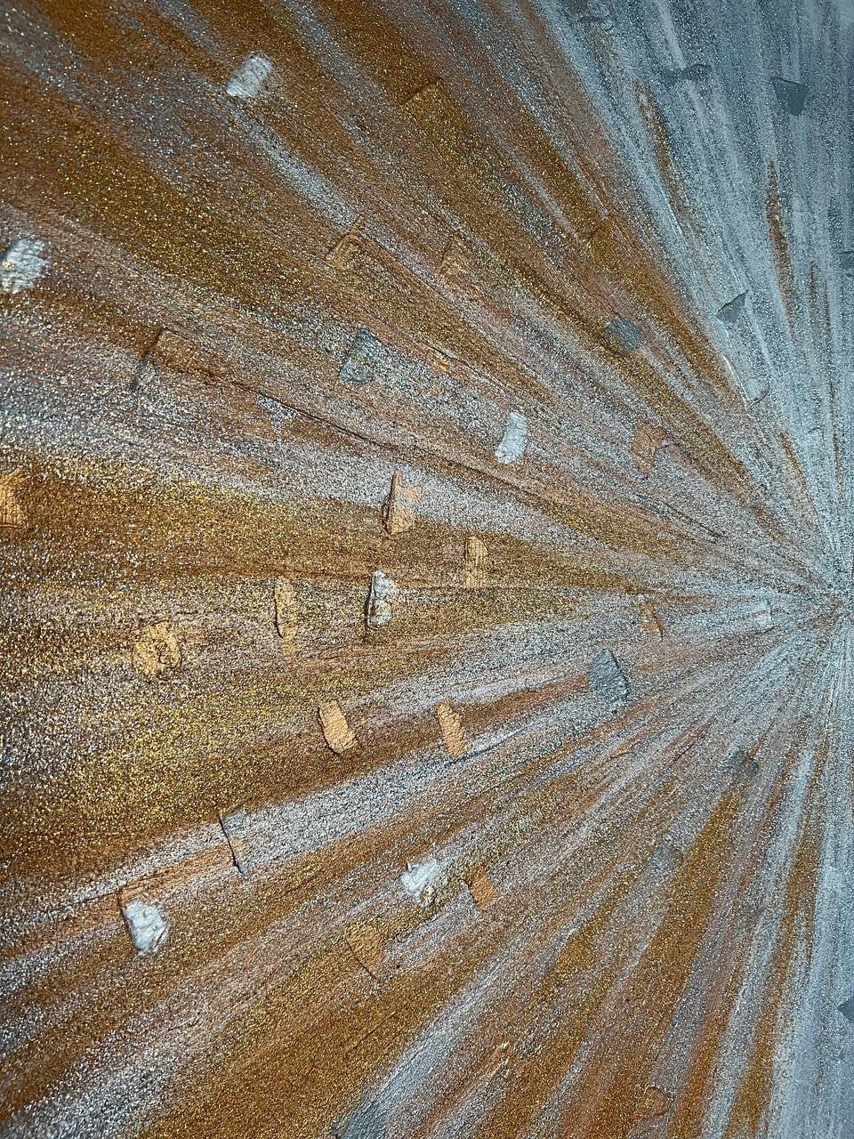 When creating this painting, I used acrylic paints of metallic shades of silver and bronze colors, and the whole painting is covered with glitter of these shades.