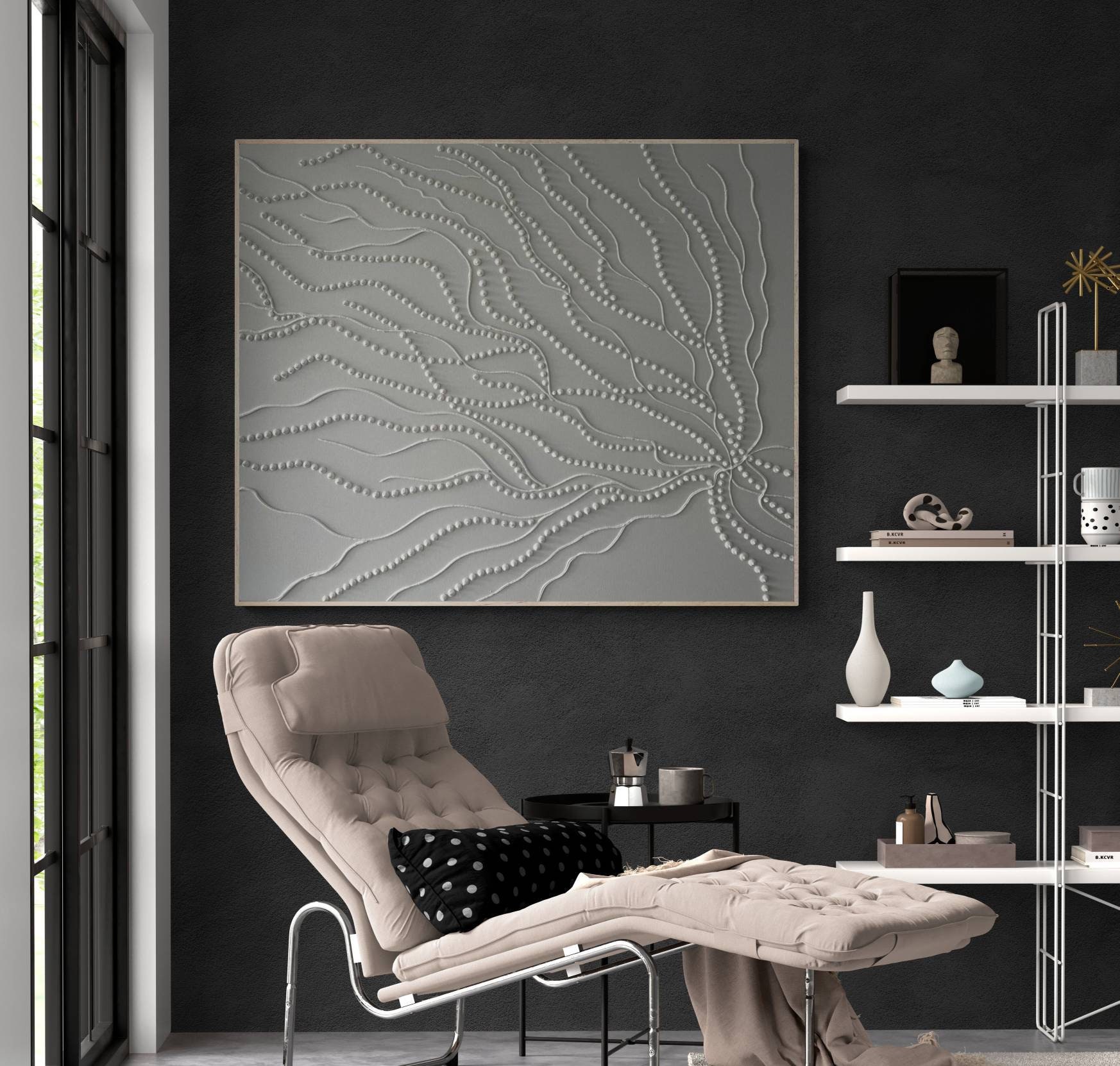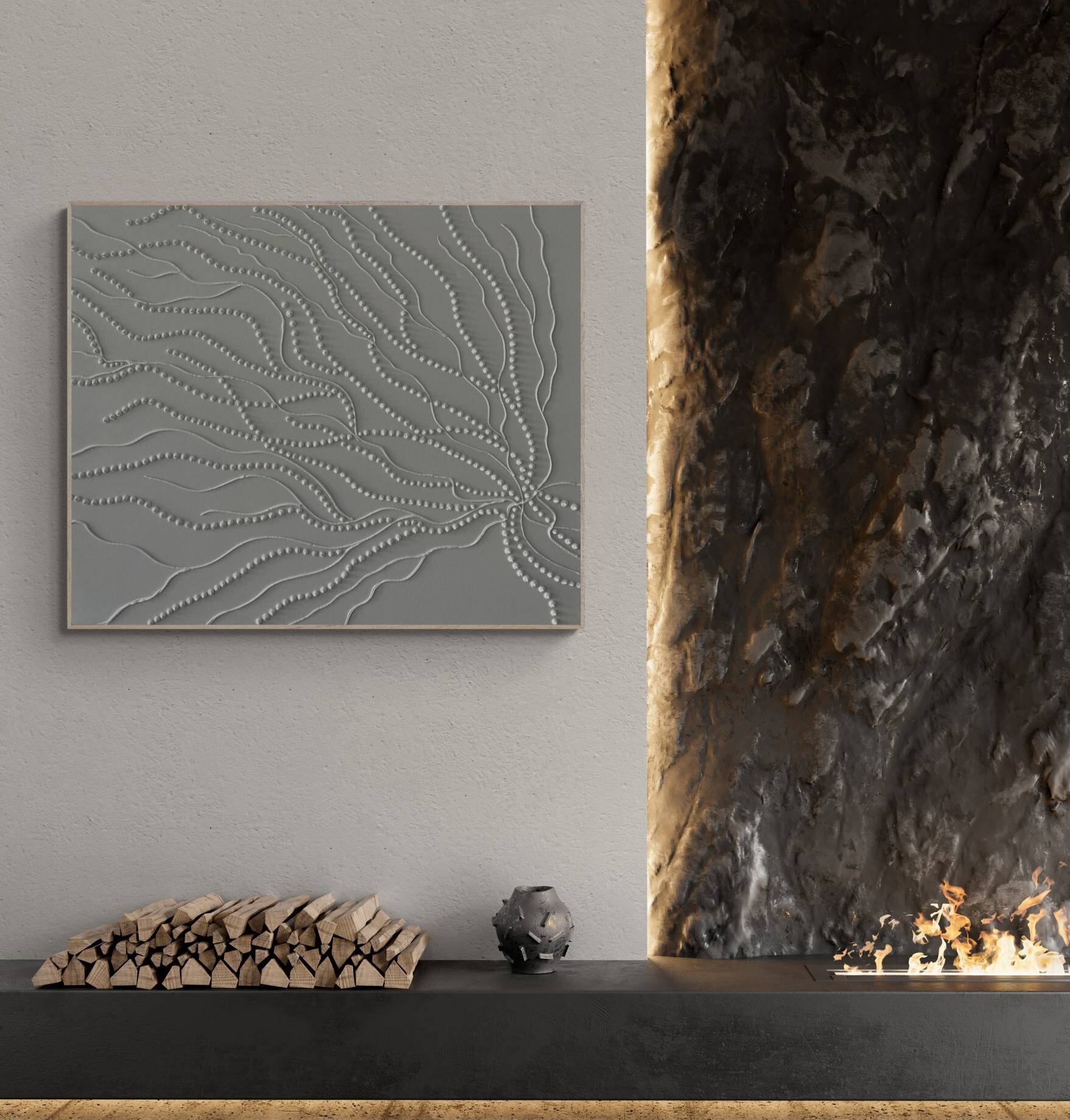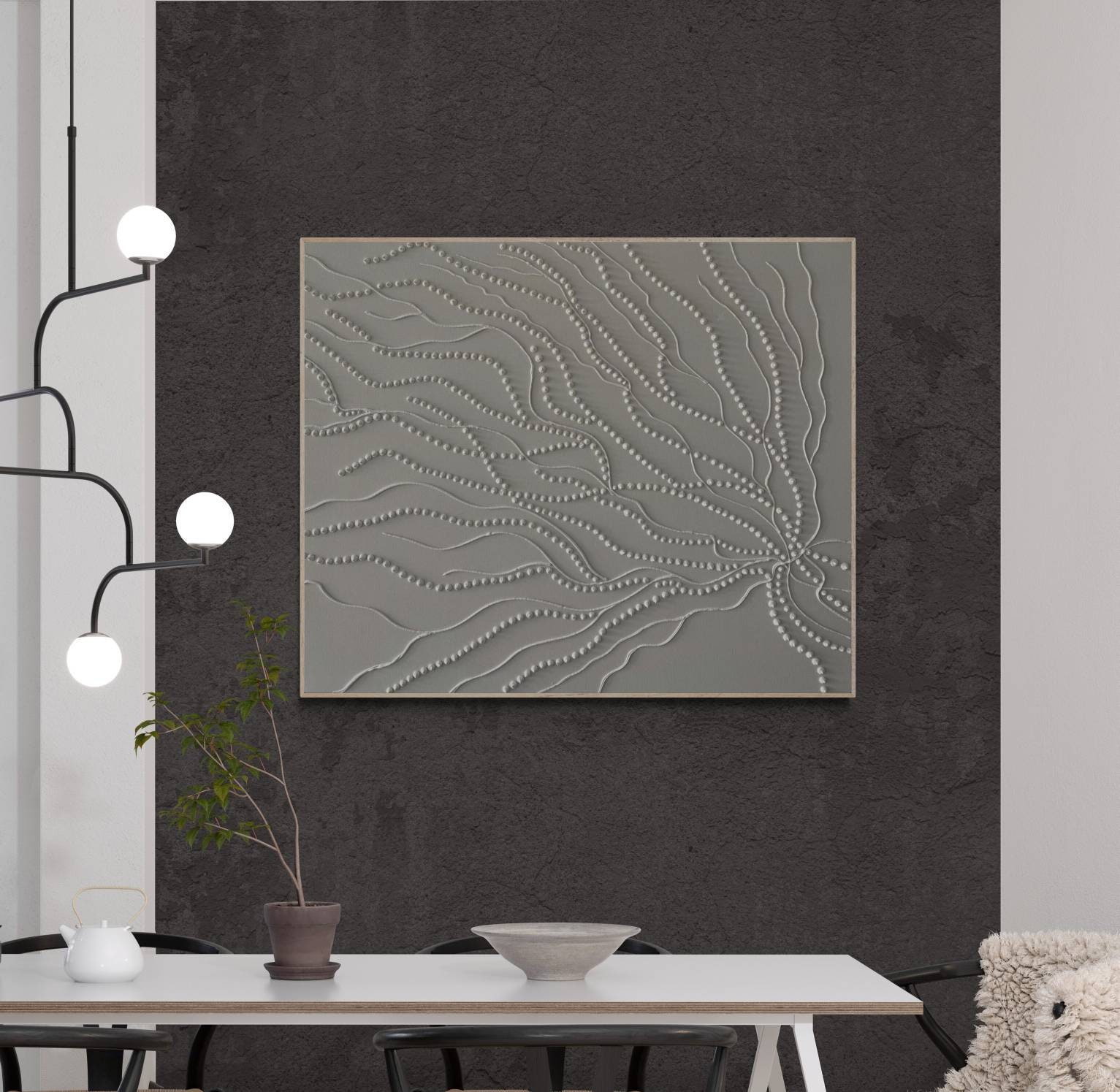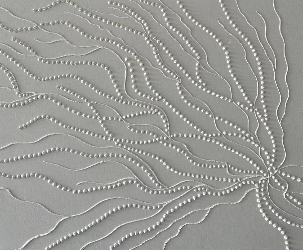 The surface is created with raised 3D dot texture and flowing relief lines, giving the artwork depth, movement, and a refined modern character.