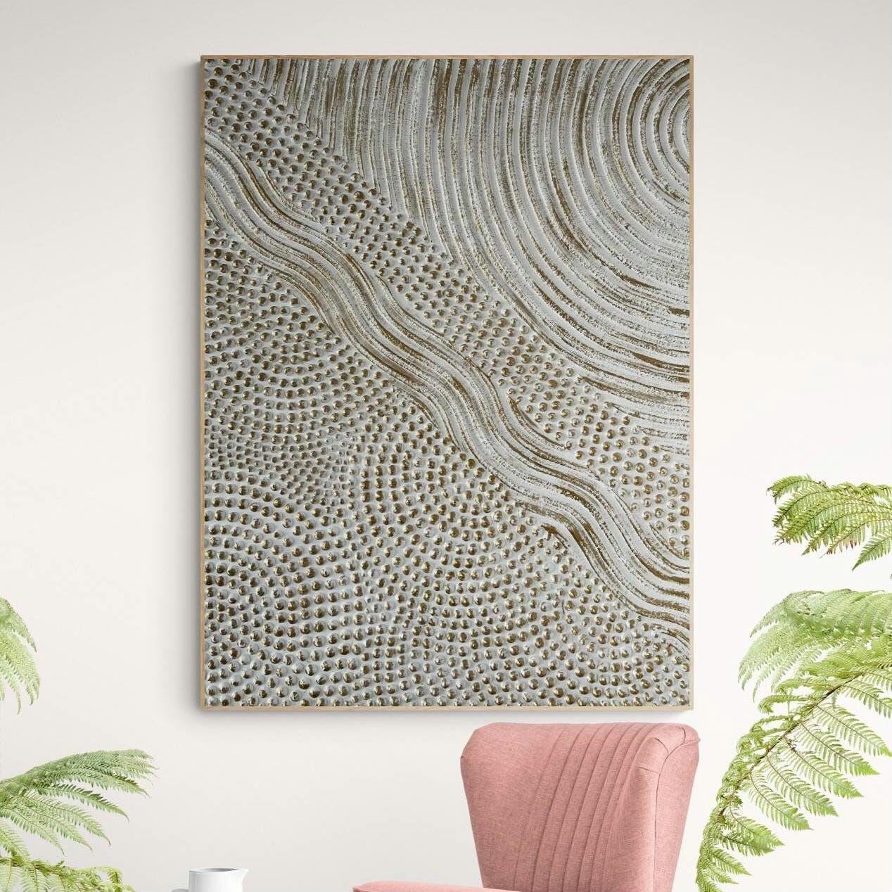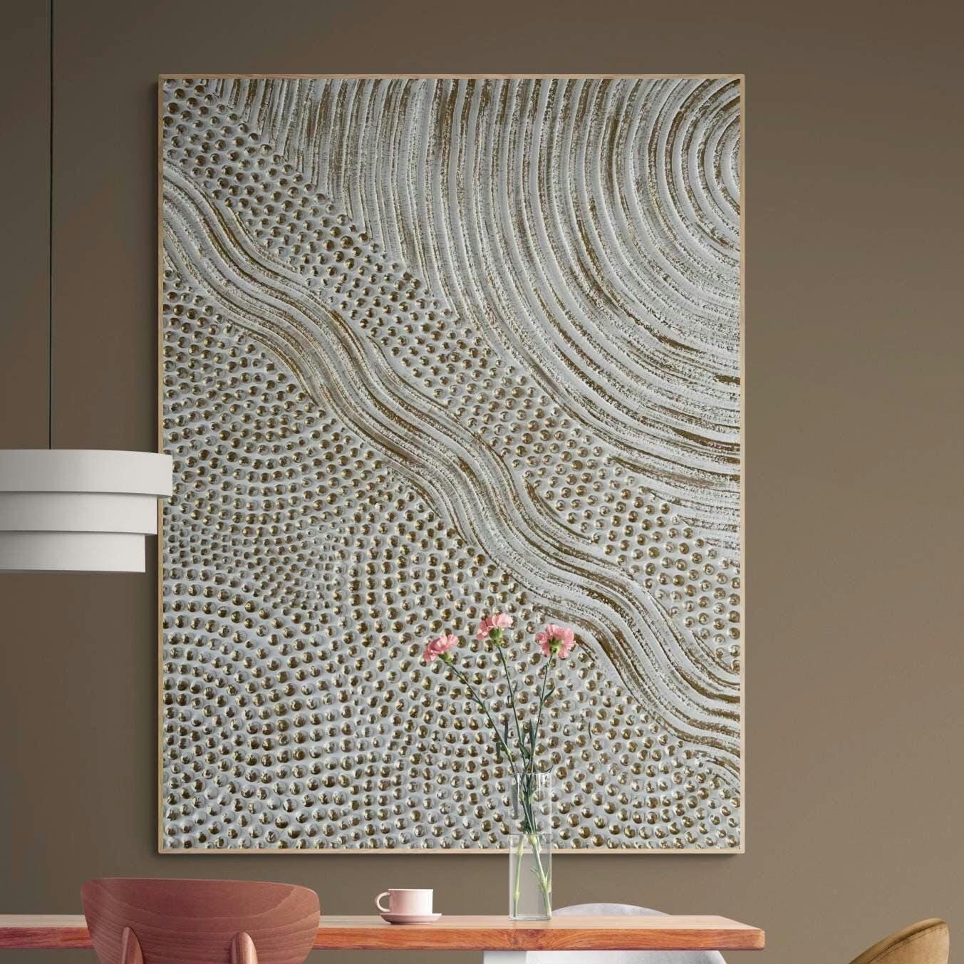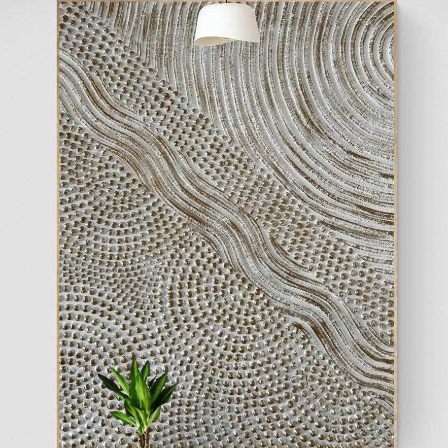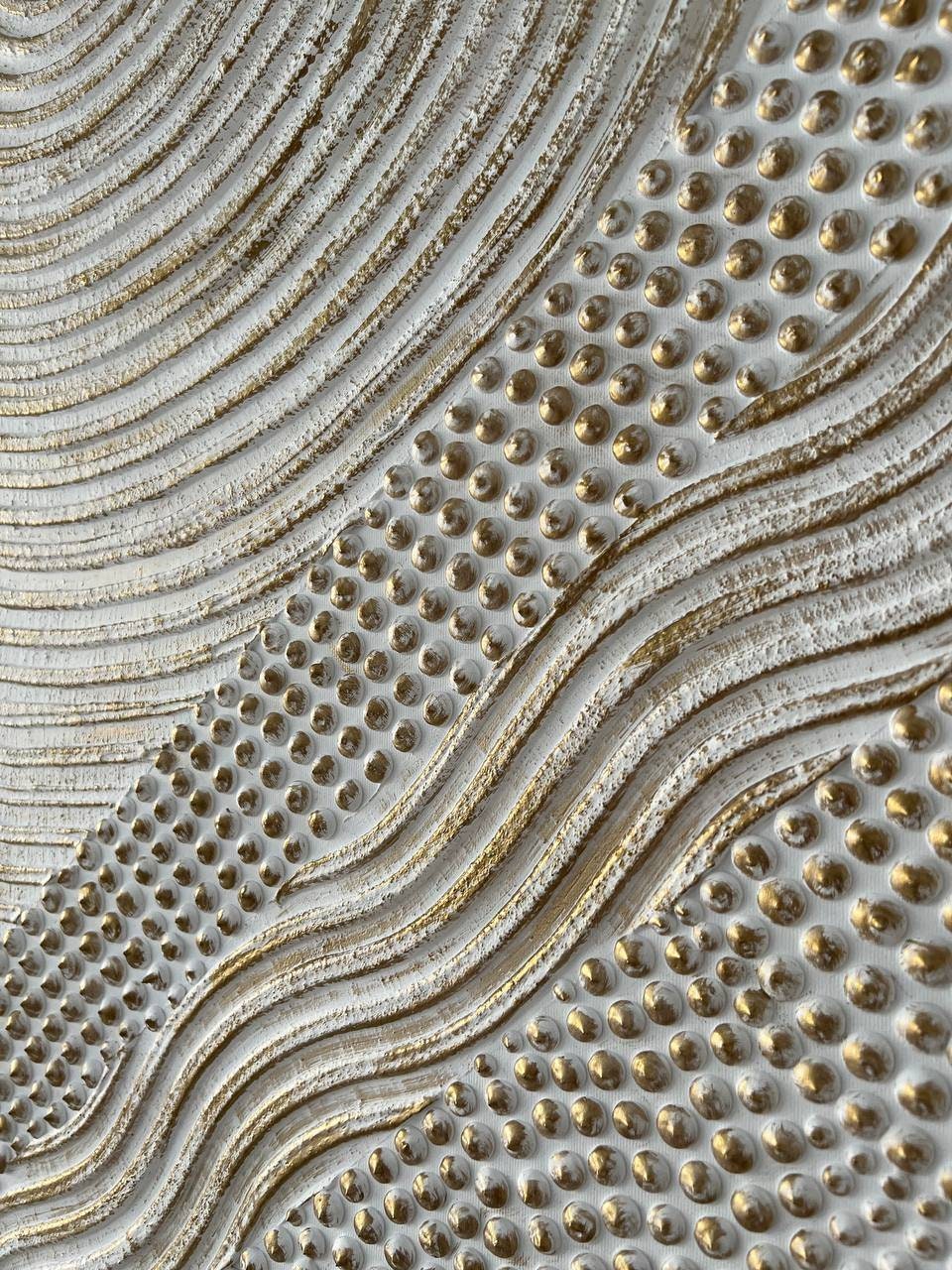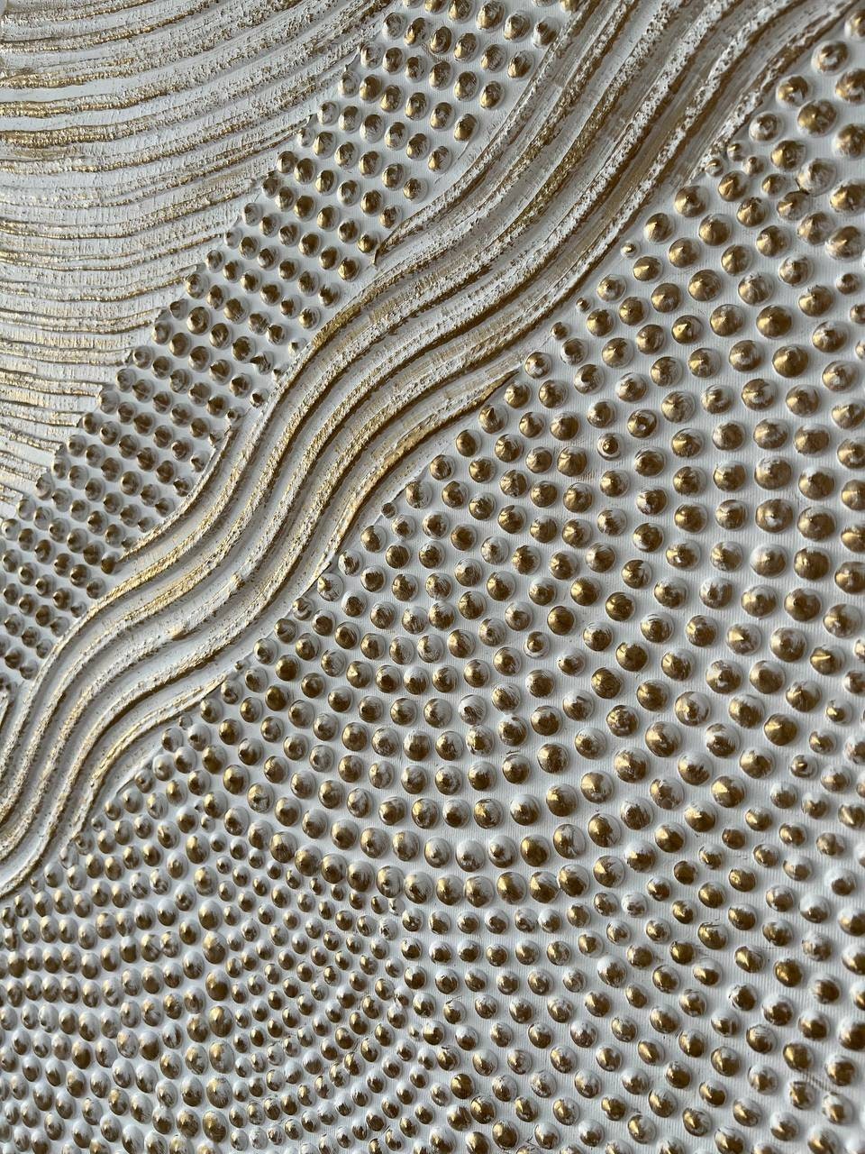 This original handmade artwork is a sculptural plaster painting featuring layered textures, rhythmic curves, and tactile dot patterns. The soft white and brass palette brings warmth, light, and balance, making the piece timeless and easy to integrate into refined interiors.