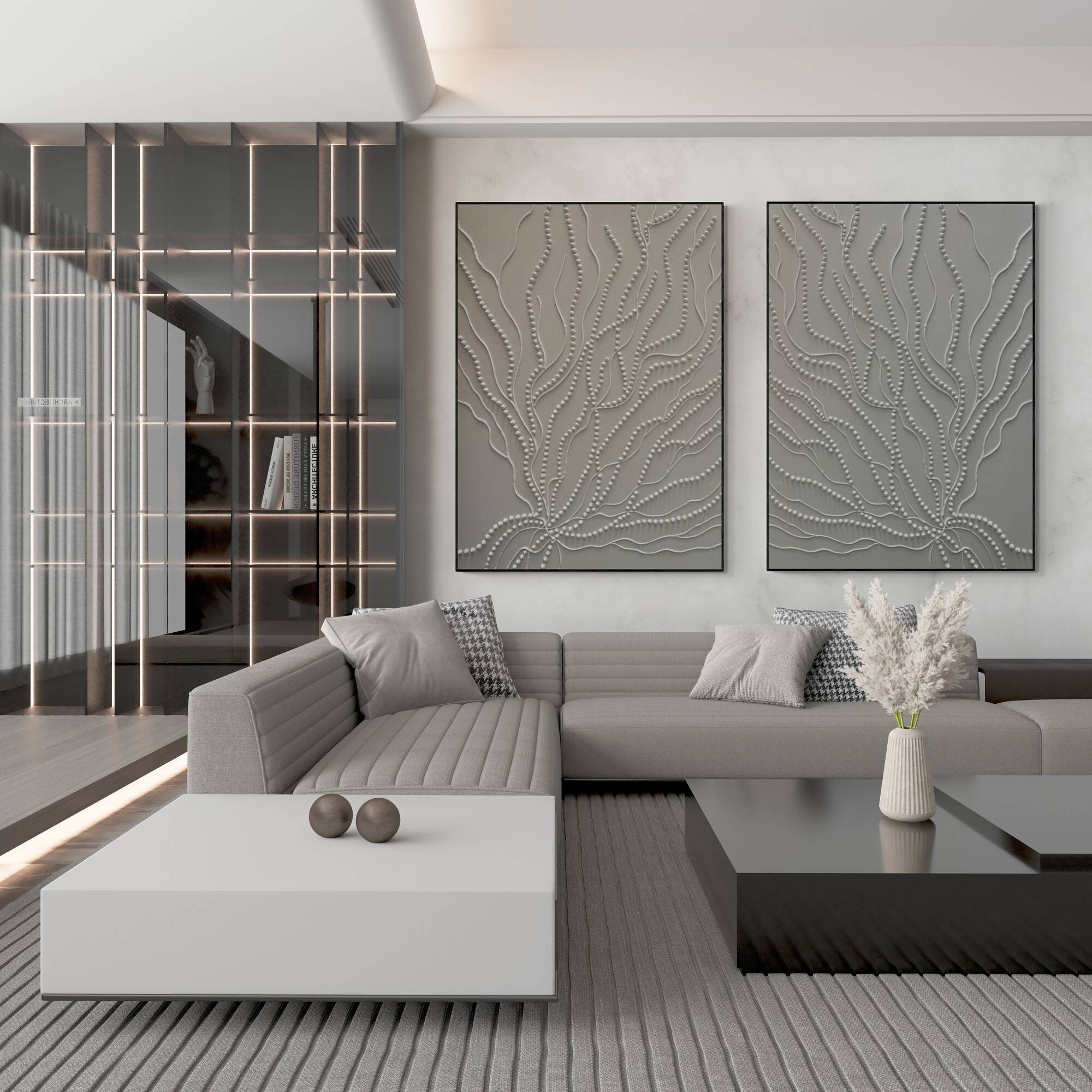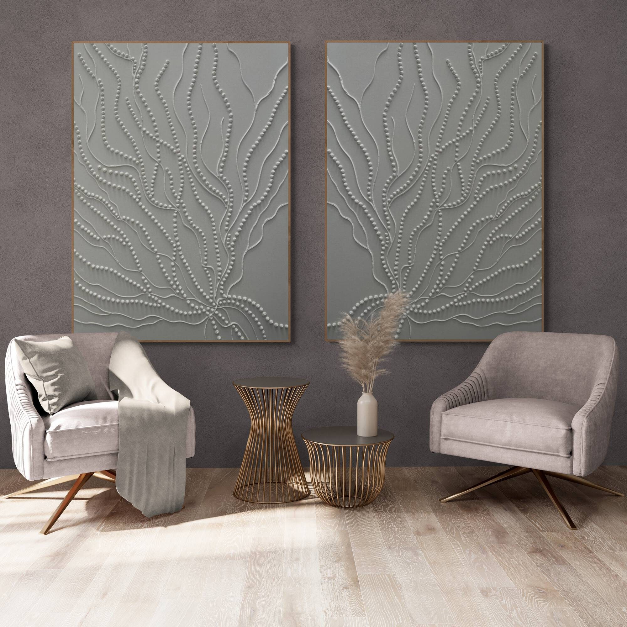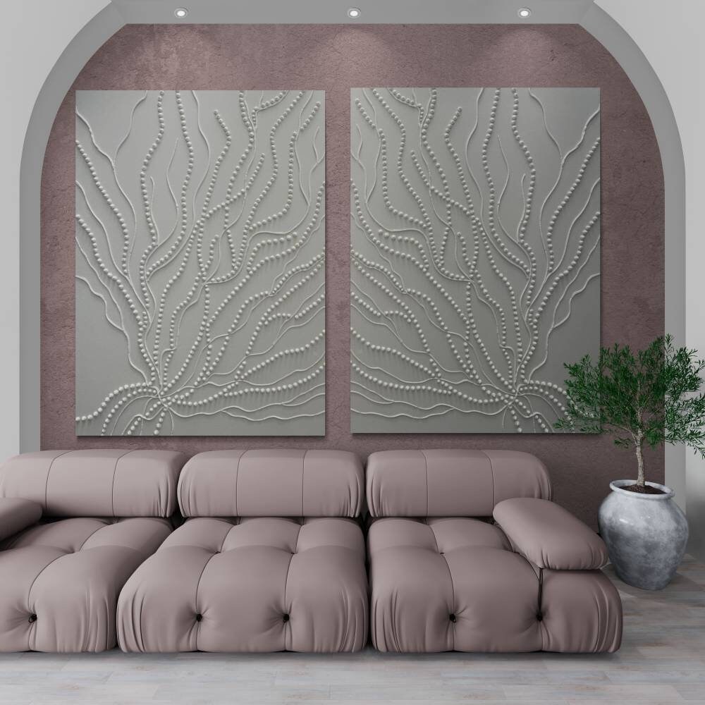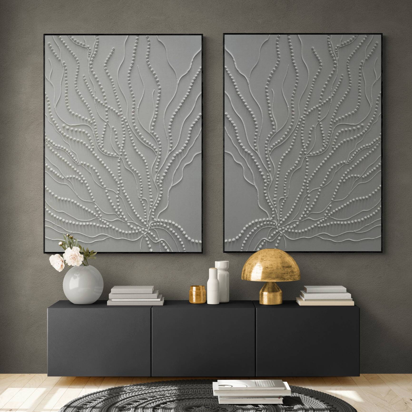 Extra large 3d white texture paintings, set of 2 abstract monochrome plaster wall art, original painting on canvas branch minimalism style