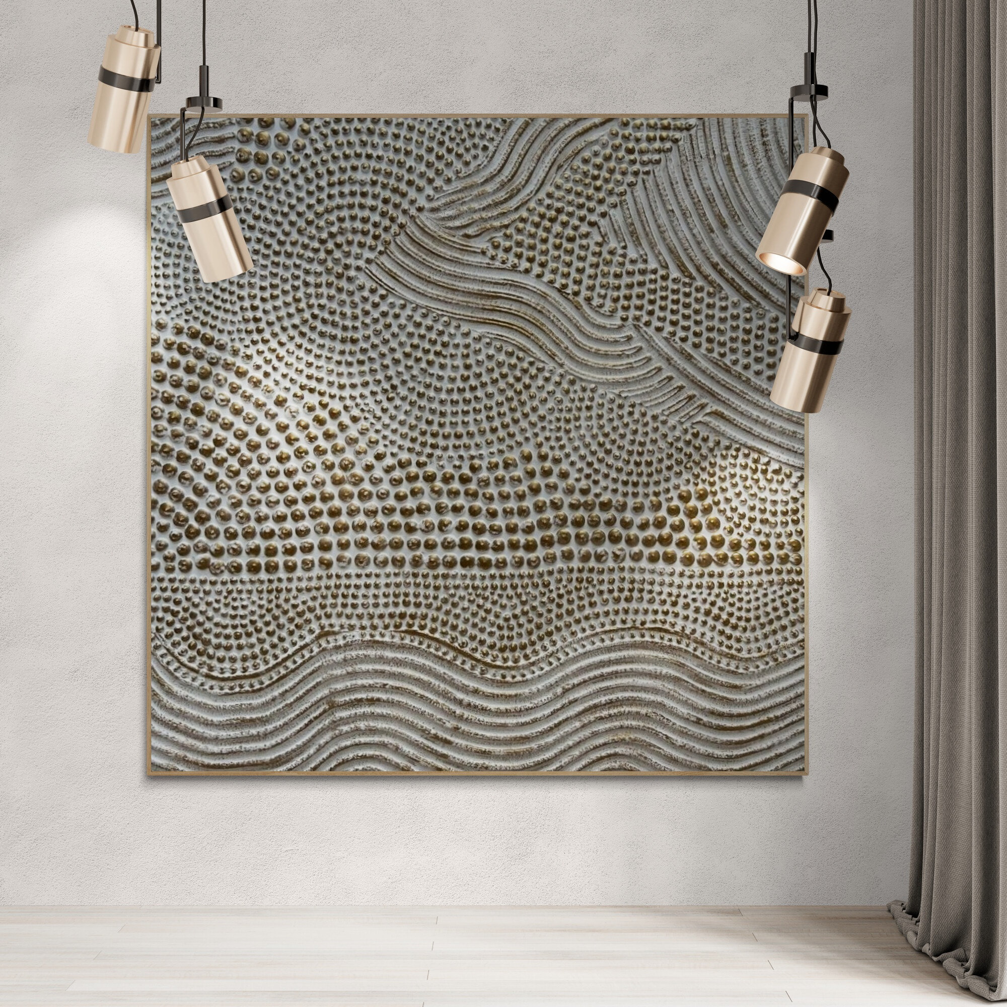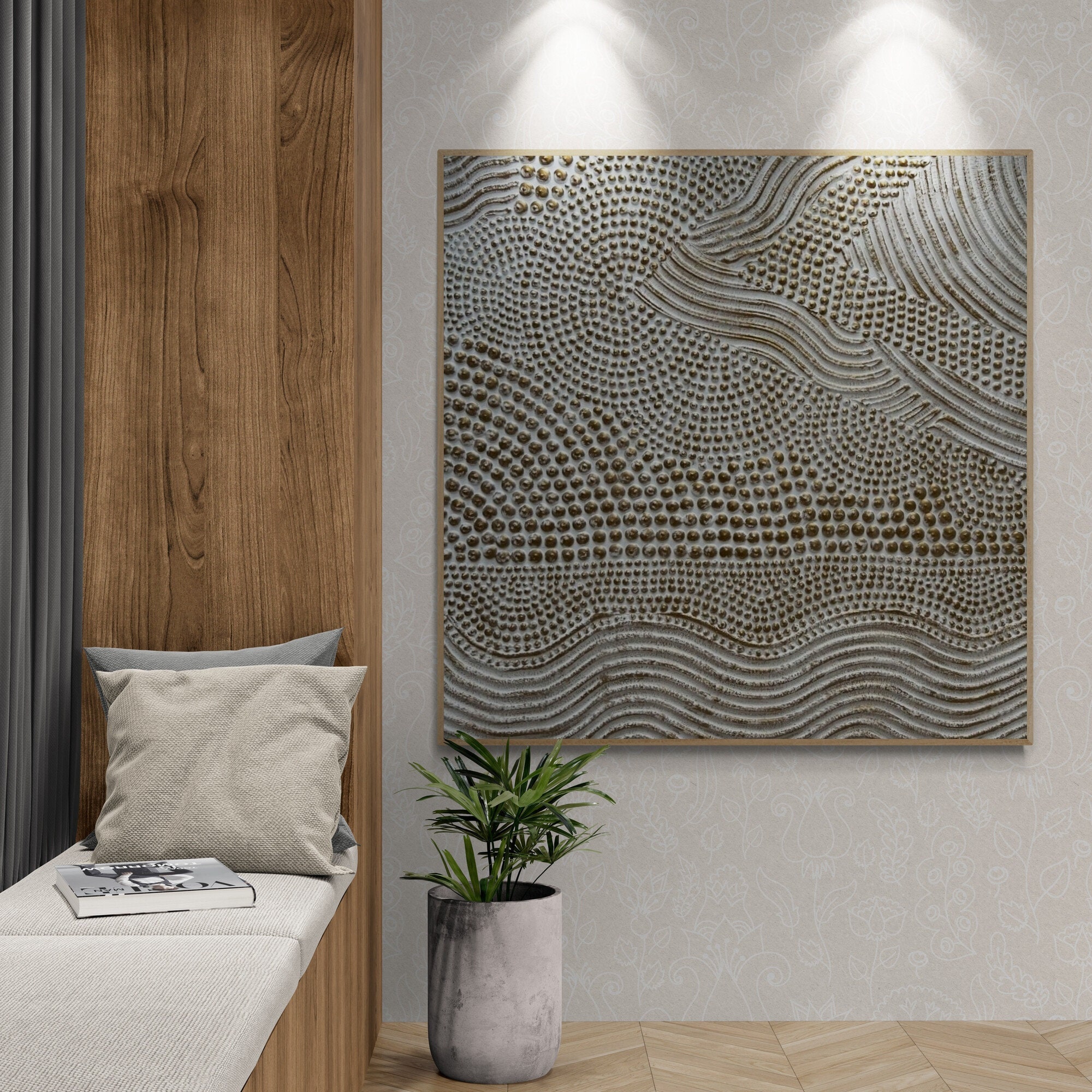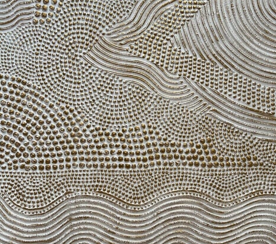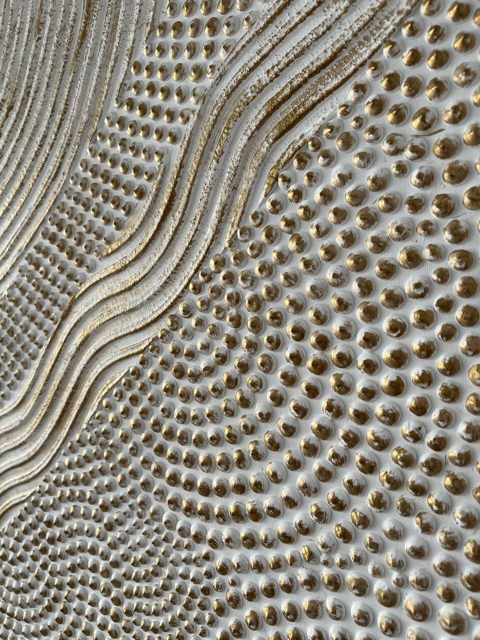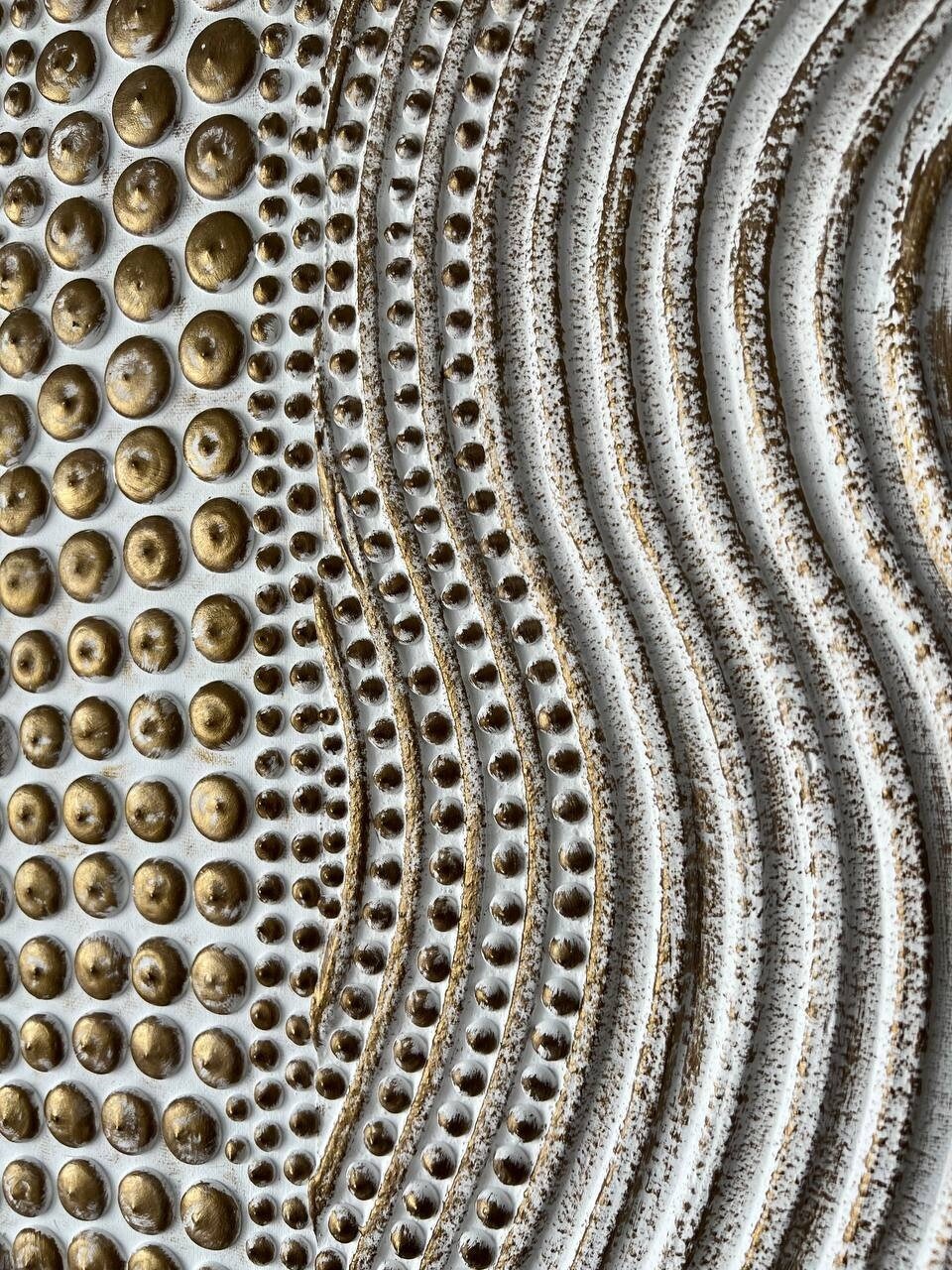This original handmade artwork is a sculptural plaster painting featuring layered textures, rhythmic curves, and tactile dot patterns. The soft white and brass palette brings warmth, light, and balance, making the piece timeless and easy to integrate into refined interiors.