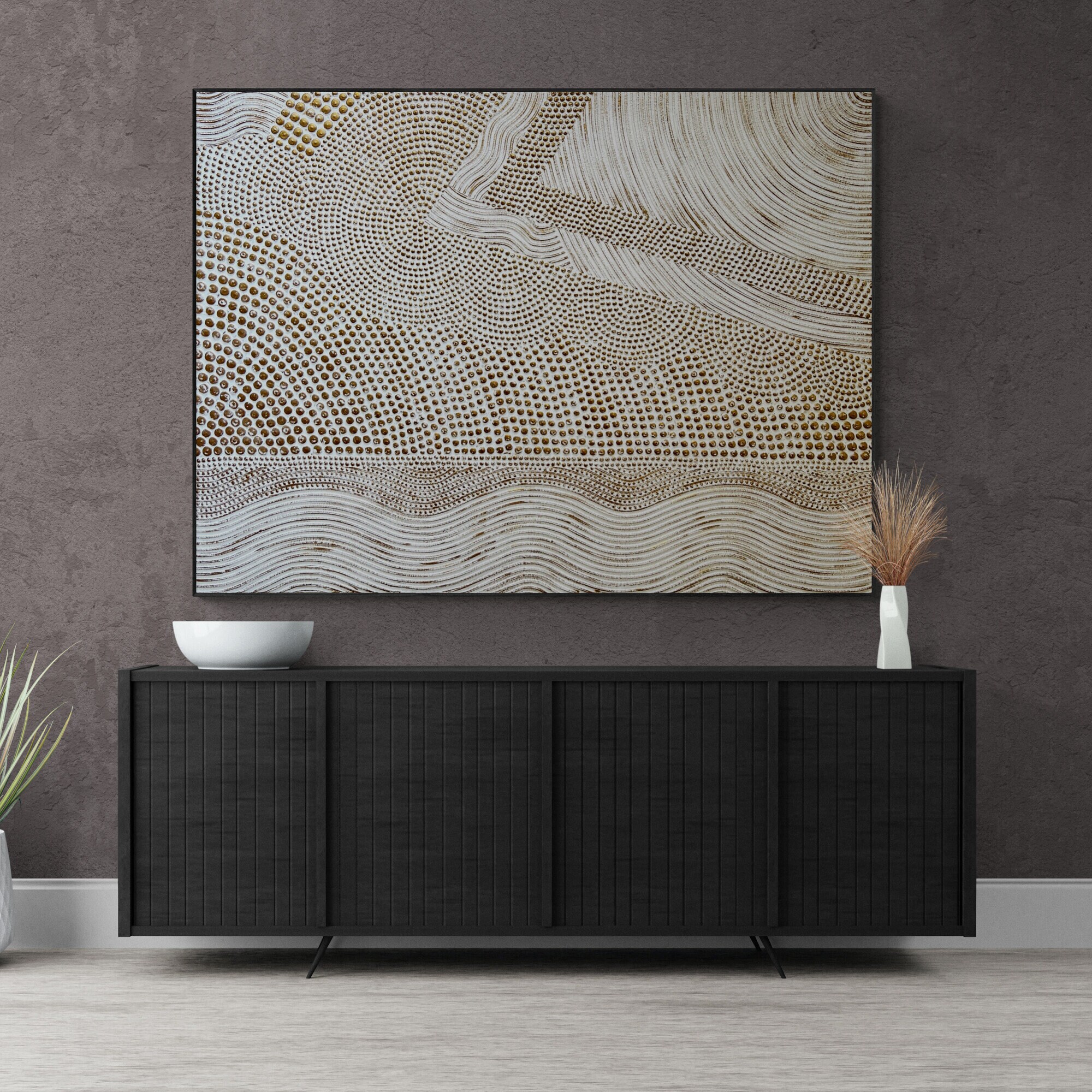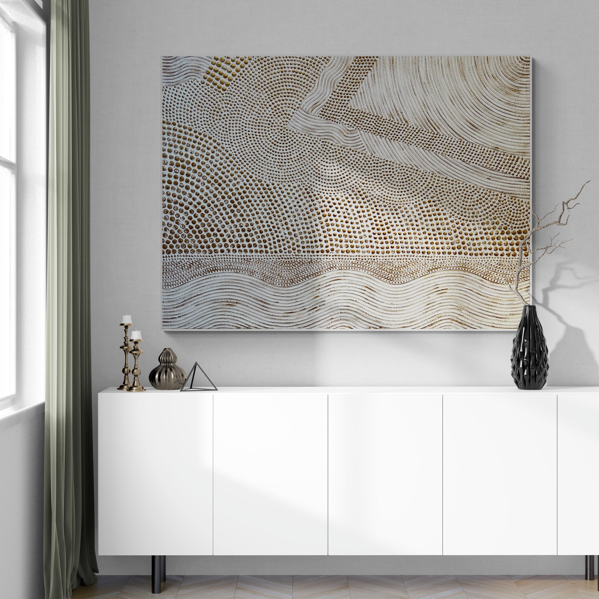The painting’s warm metallic tones and minimal geometric texture make it a perfect fit for modern, luxury, or neutral interiors — ideal for your living room, bedroom, hallway, or office.
