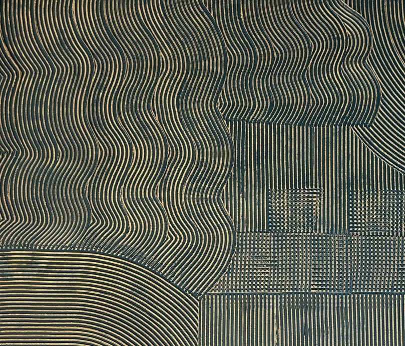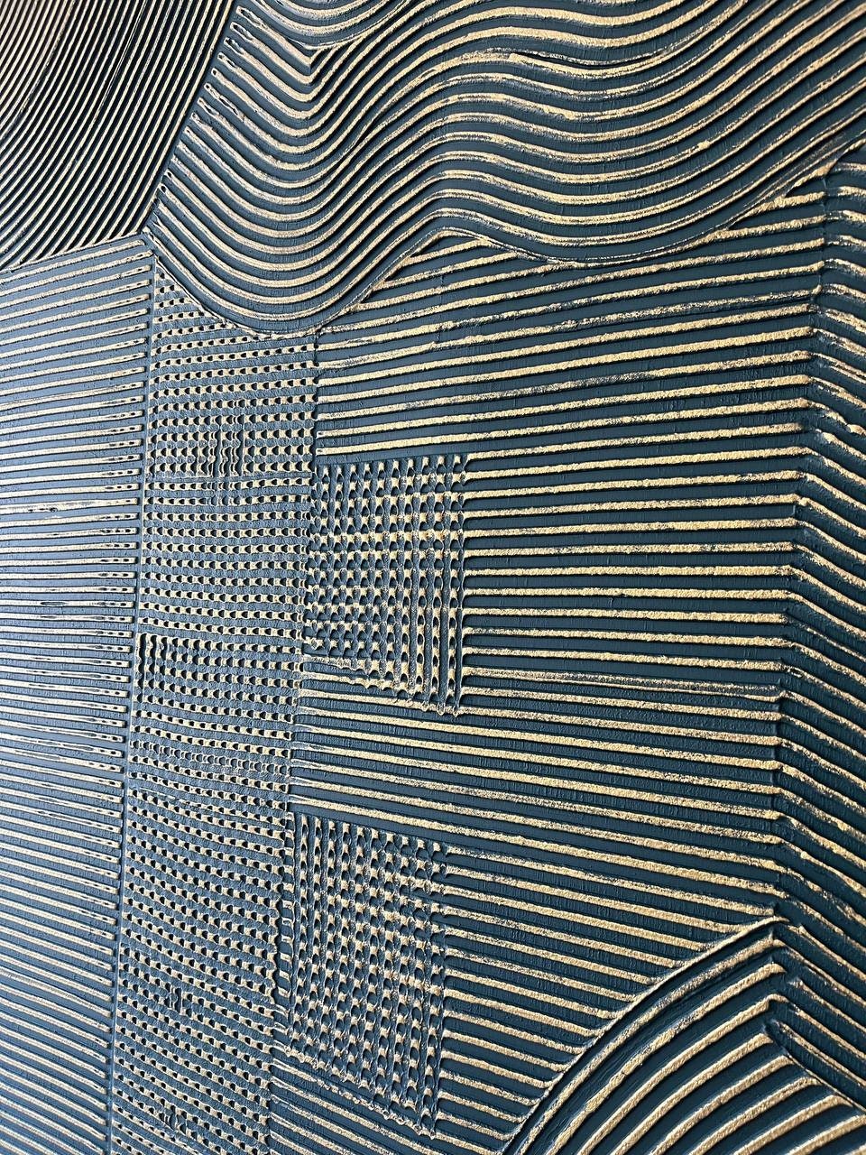 The surface features layered geometric and organic patterns black with brass metallic effect, creating depth and a soft reflective sheen depending on the light.
