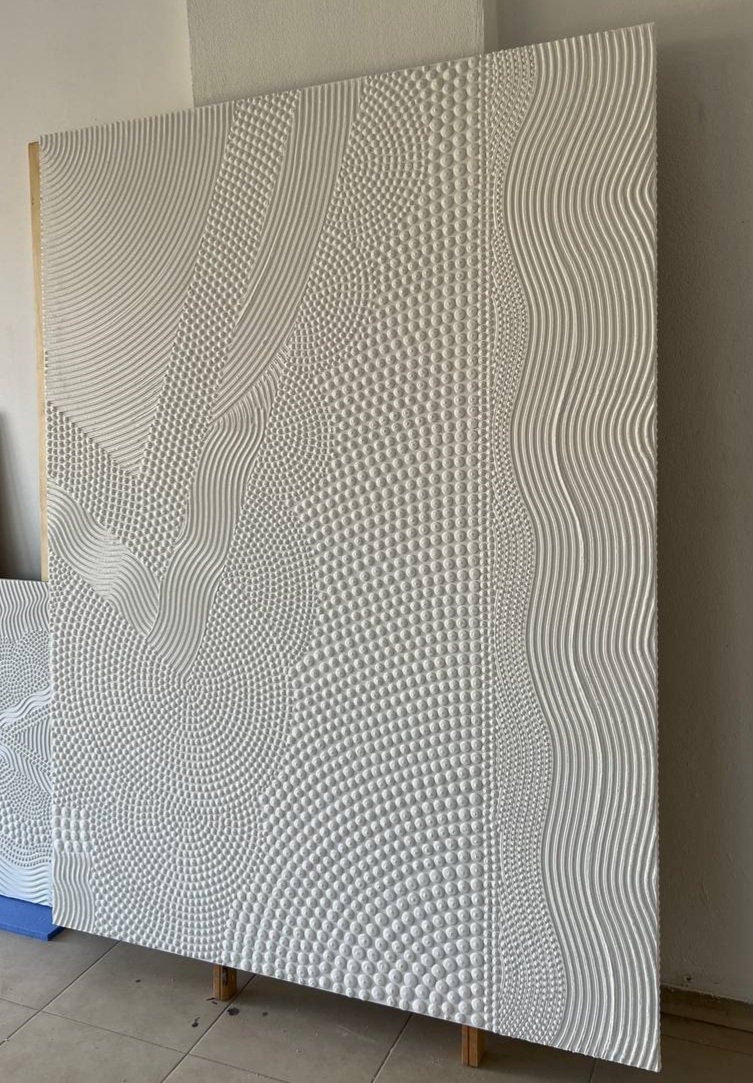 Transform your space with this hand-sculpted, neutral 3D textured wall art, created in calming organic waves and dotted geometric rhythm. Each raised dot and curved relief line is made fully by hand — no prints, no molds — resulting in a tactile, sculptural surface that feels both architectural and soft.