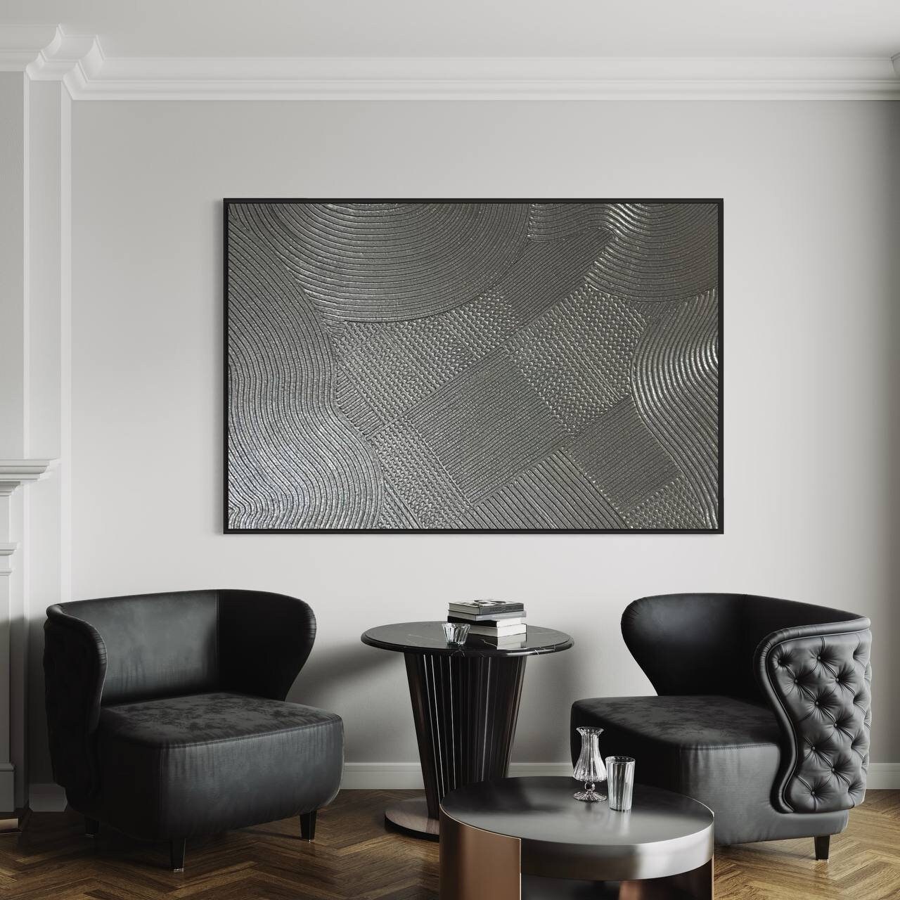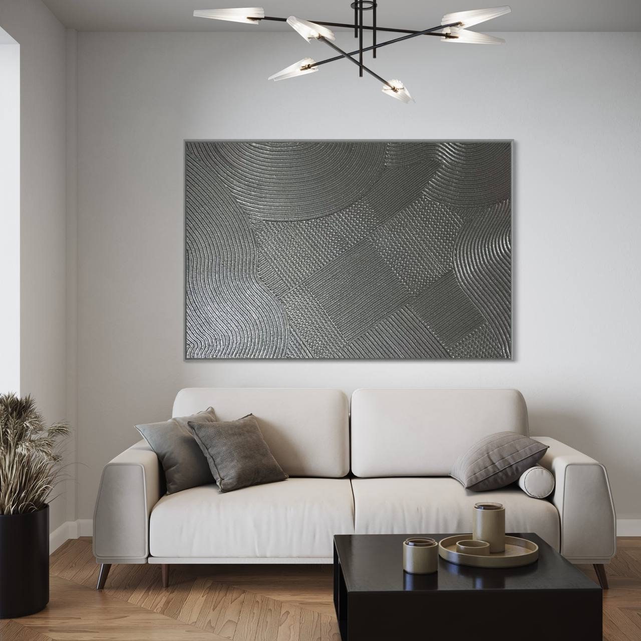 The painting’s silver metallic tones and minimal geometric texture make it a perfect fit for modern, luxury, japanese,boho, wabi-sabi or neutral interiors — ideal for your living room, bedroom, hallway, or office.