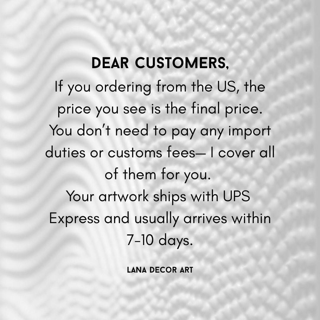 IMPORTANT: If you receive a damaged painting you must save the damaged box and damaged painting so I can immediately file a claim with the shipping company. They will need to see the box & painting to launch their investigation. All of my paintings are fully insured.