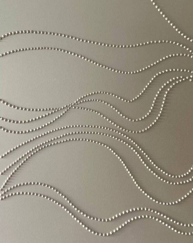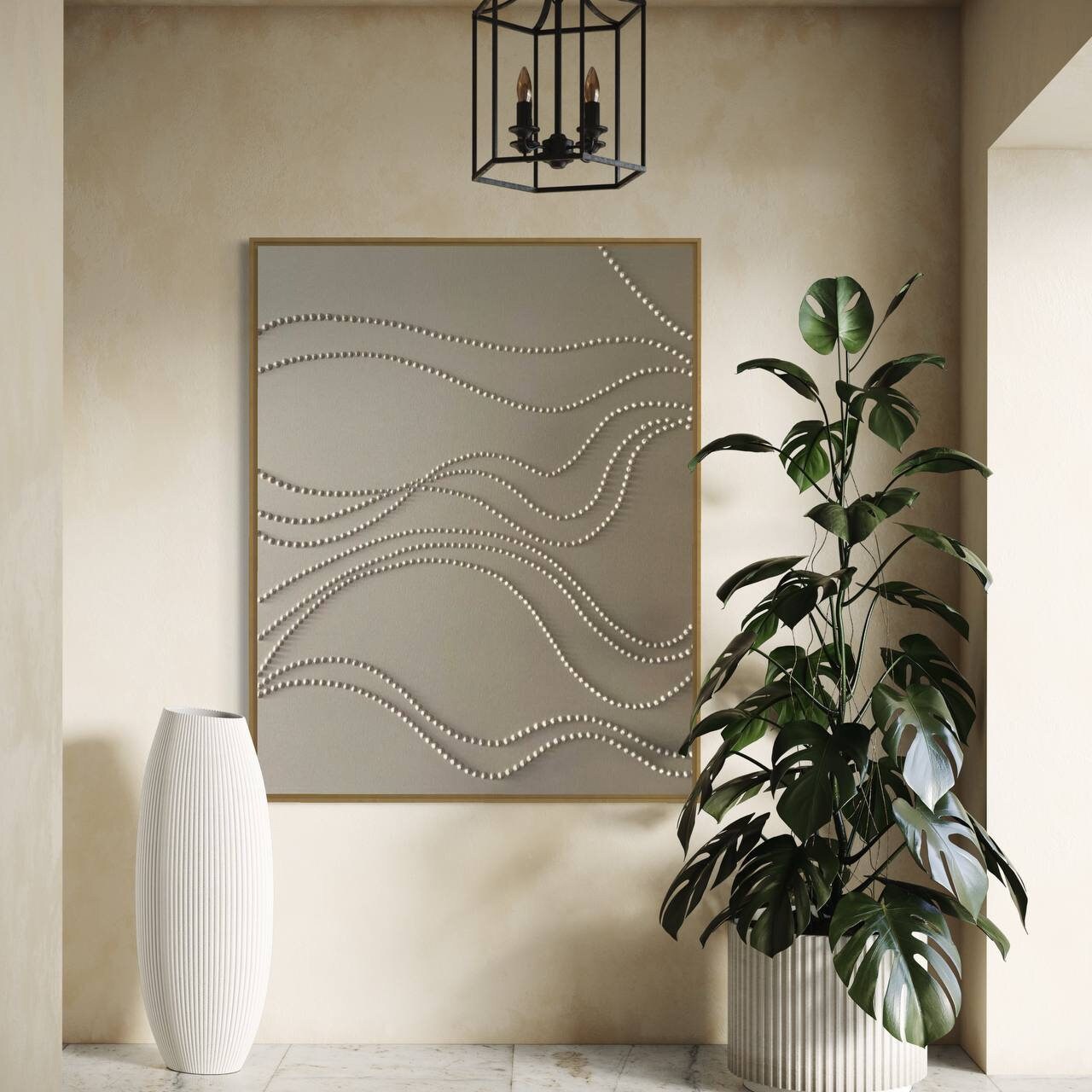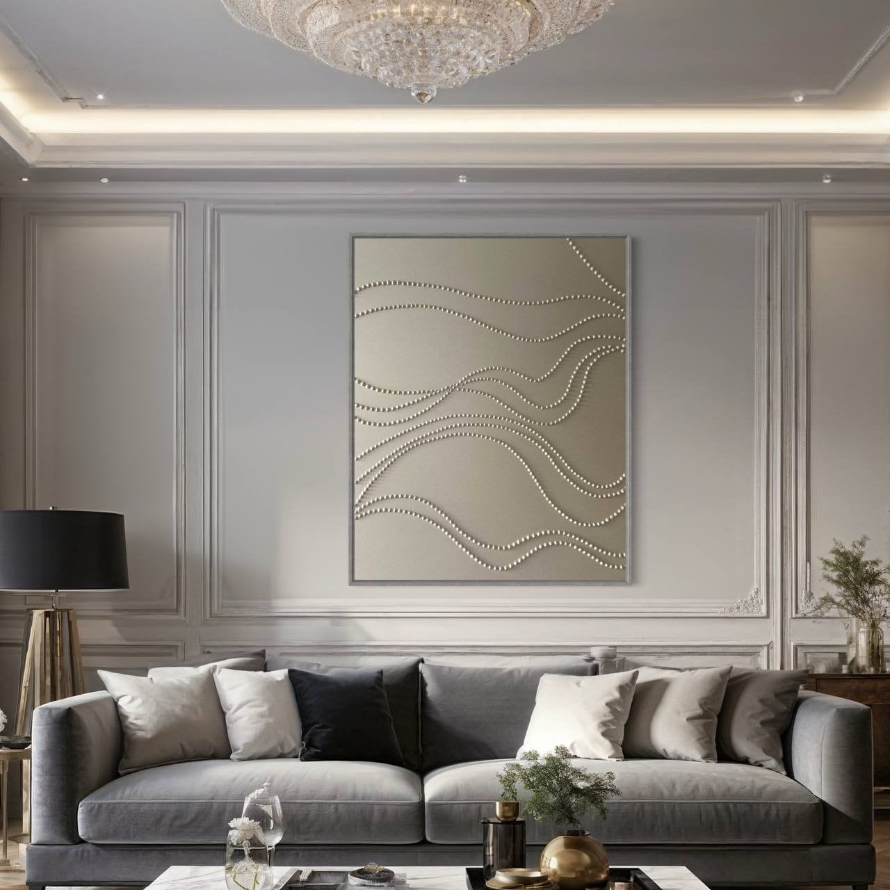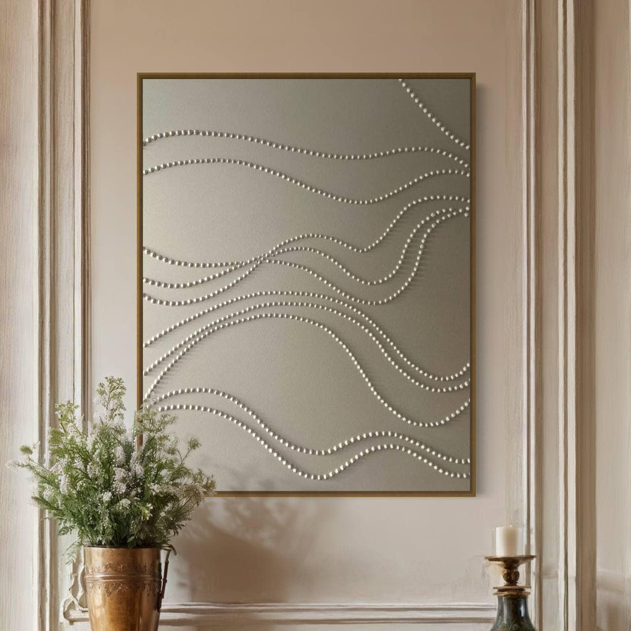 This original handmade artwork is a sculptural plaster painting featuring layered textures, rhythmic curves, and tactile dot patterns. The soft gold, golden pearl palette brings warmth, light, and balance, making the piece timeless and easy to integrate into refined interiors.