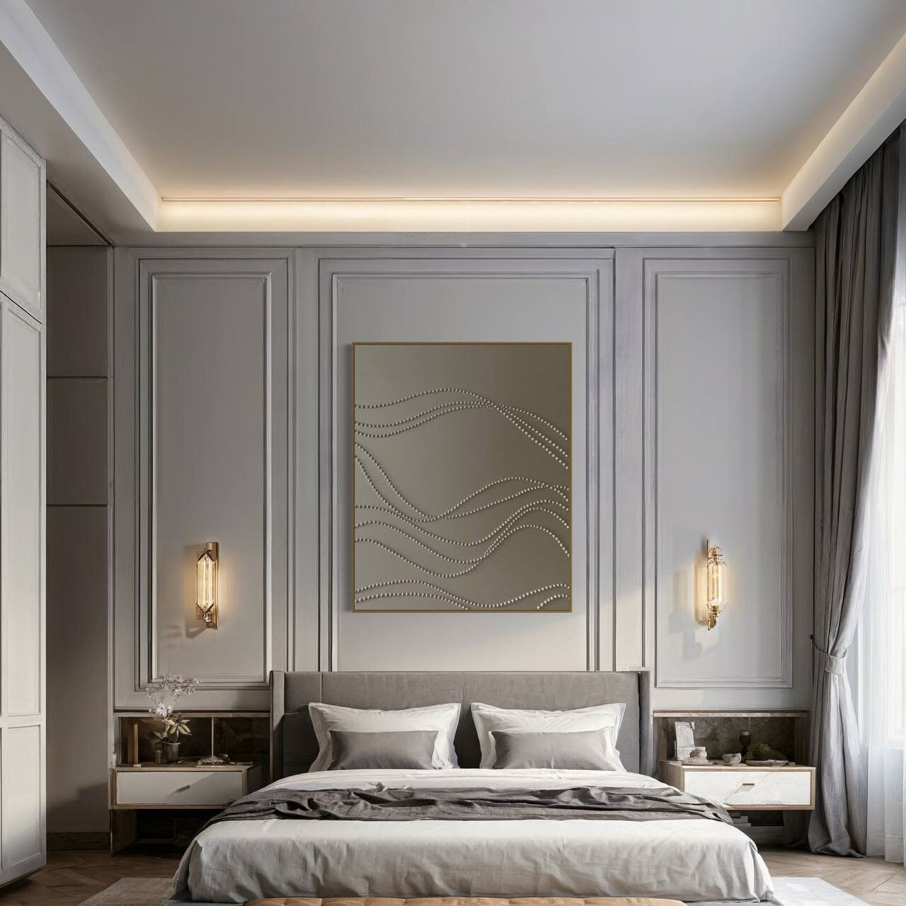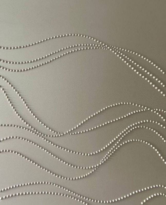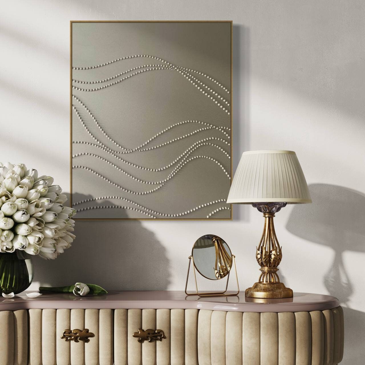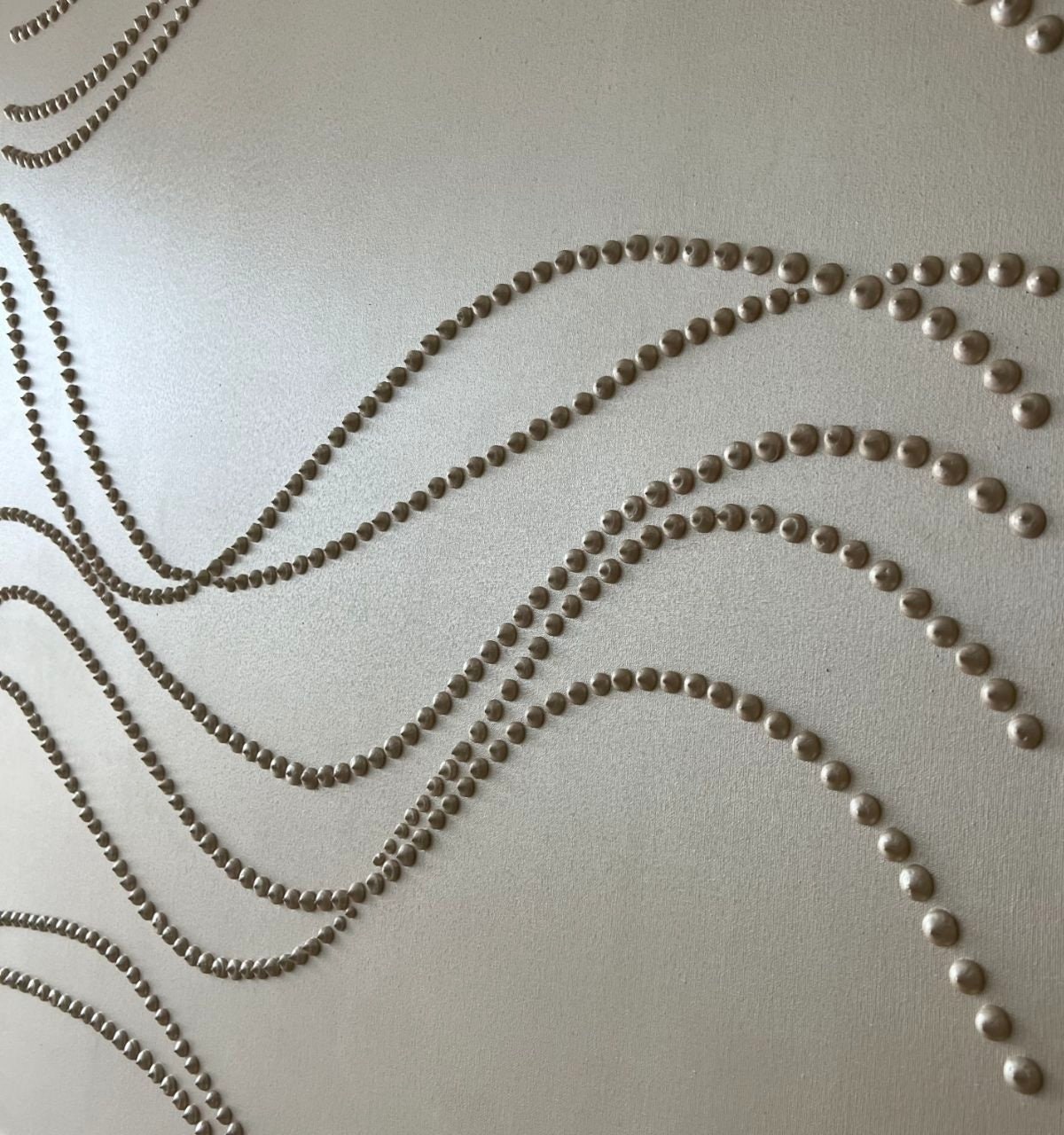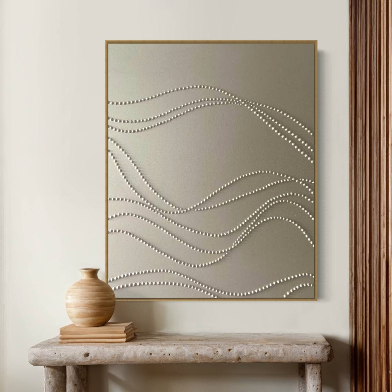 This original handmade artwork is a sculptural plaster painting featuring layered textures, rhythmic curves, and tactile dot patterns. The soft gold, golden pearl palette brings warmth, light, and balance, making the piece timeless and easy to integrate into refined interiors.