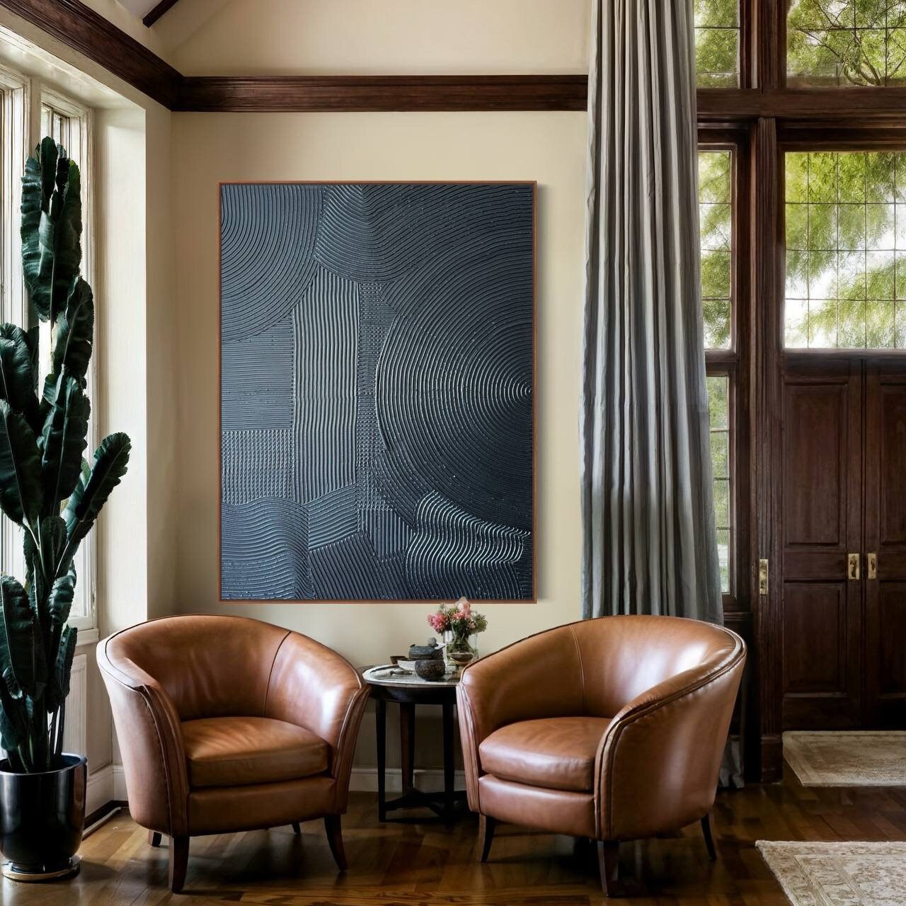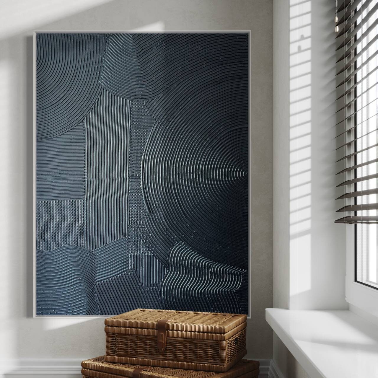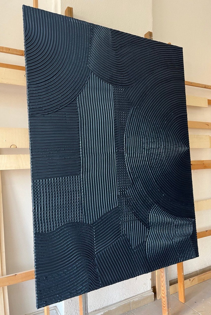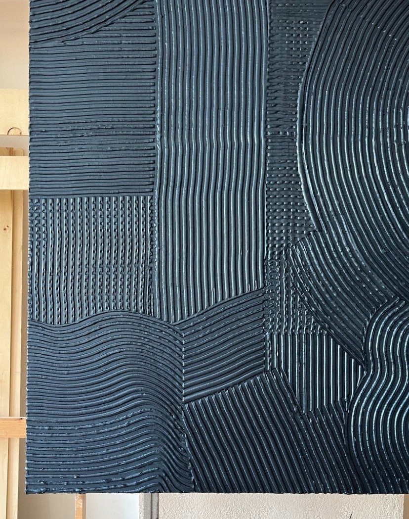 Extra large blue metallic 64" x 48" rich texture plaster 3d wall art, oversize dark blue painting, monochrome 3d volume handmade painting