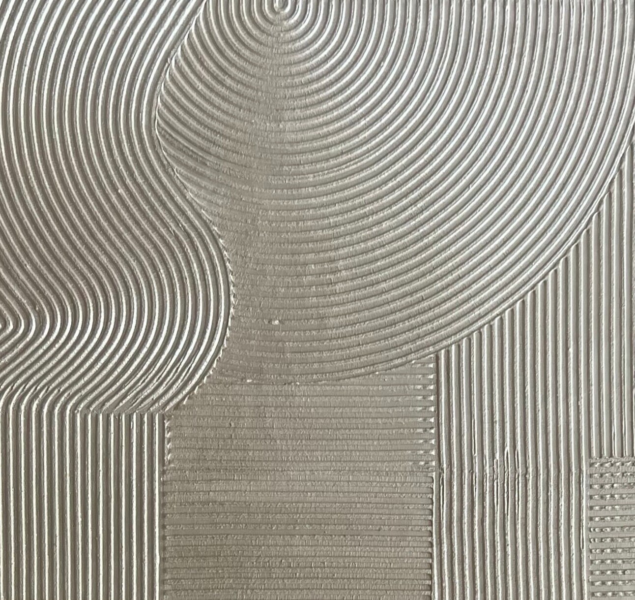 The surface features layered geometric and organic patterns with a white metallic / white pearl effect, creating depth and a soft reflective sheen depending on the light.