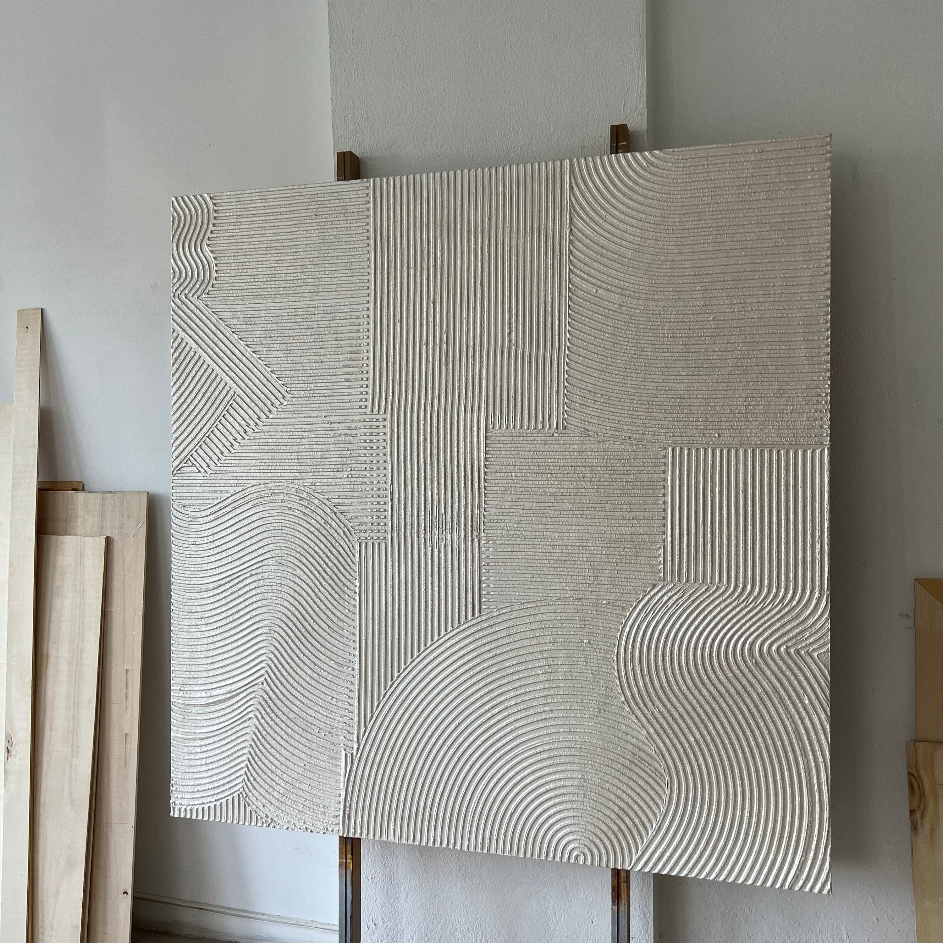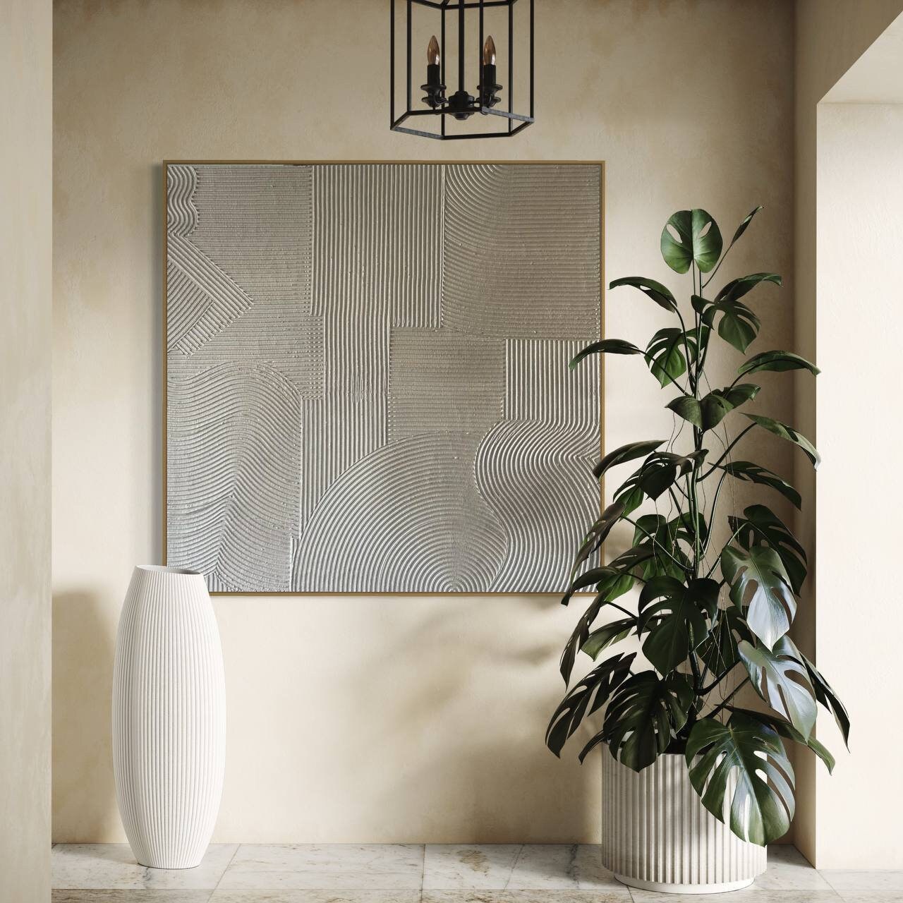 Large modern white metallic textured abstract painting with deep 3D relief and subtle mother-of-pearl finish.