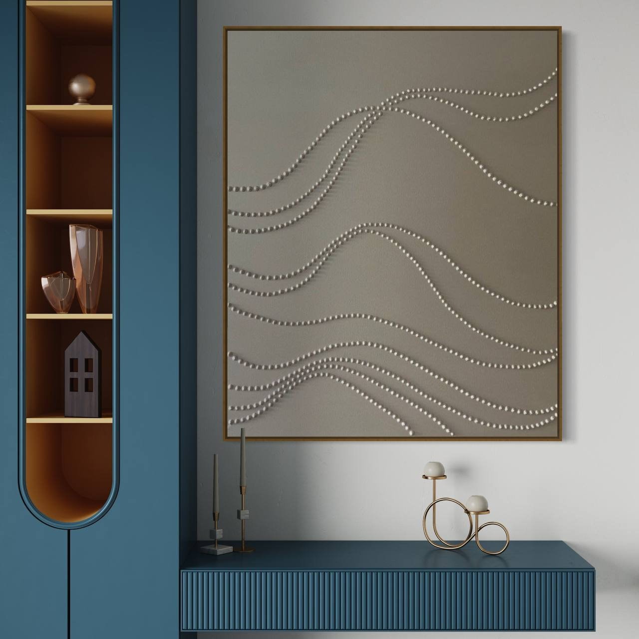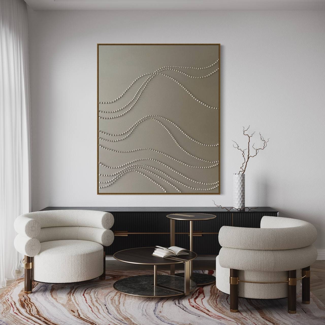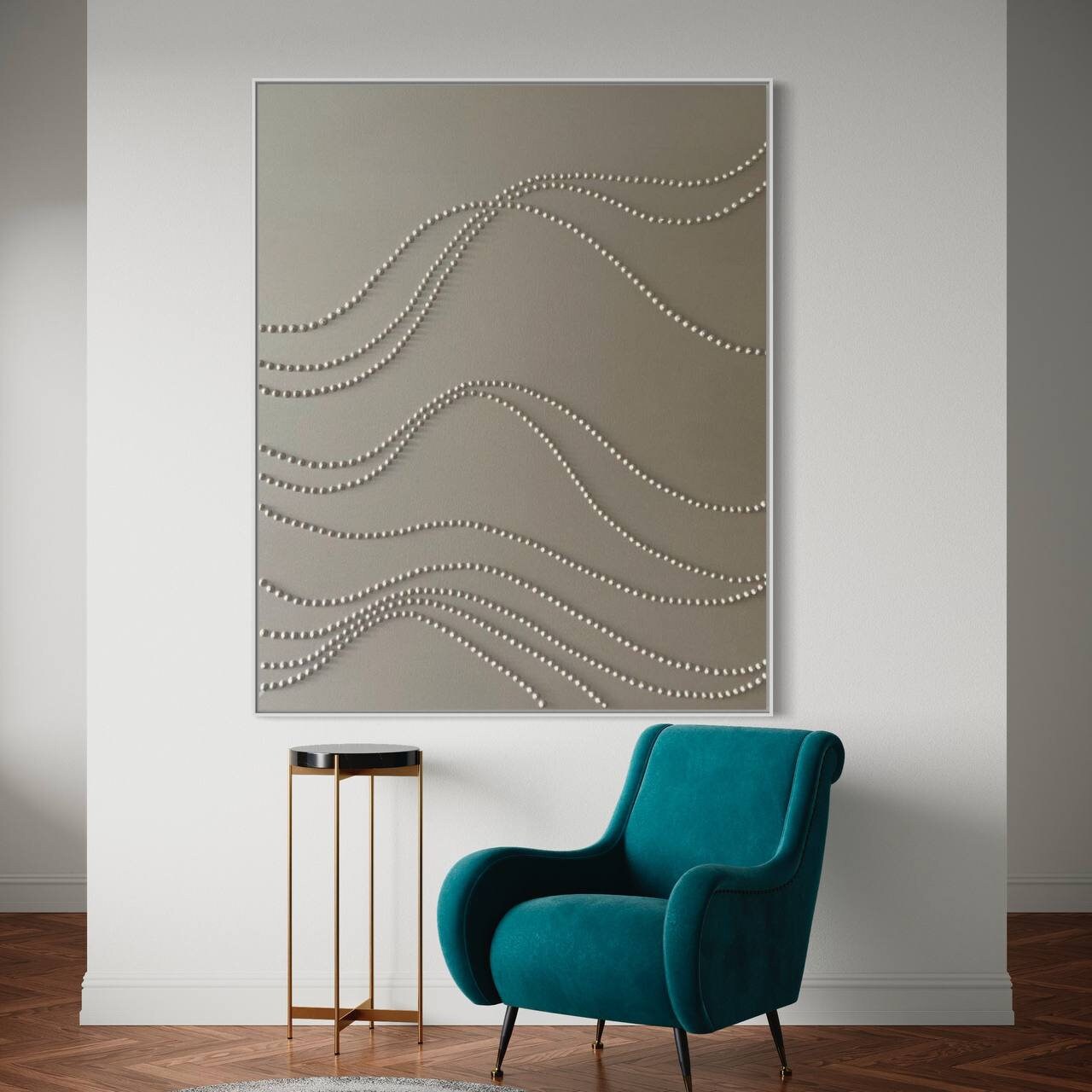 This original handmade artwork is a sculptural plaster painting featuring layered textures, rhythmic curves, and tactile dot patterns. The soft gold, golden pearl palette brings warmth, light, and balance, making the piece timeless and easy to integrate into refined interiors.