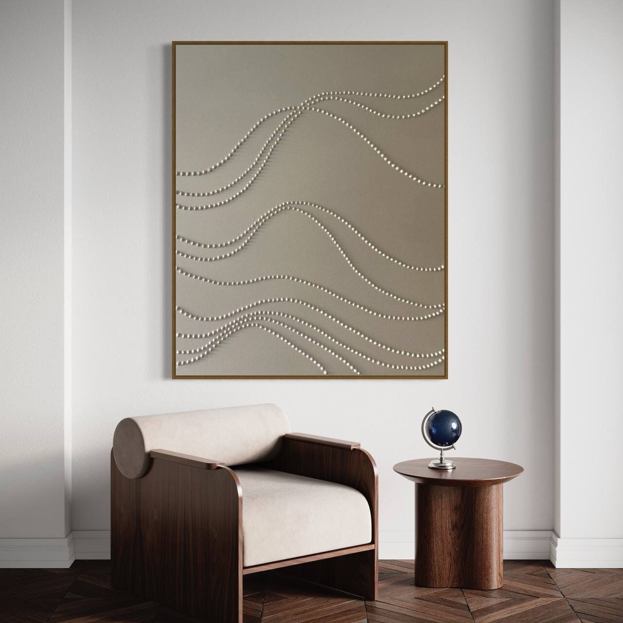 Modern neutral artwork with flowing geometric relief and calming organic movement.