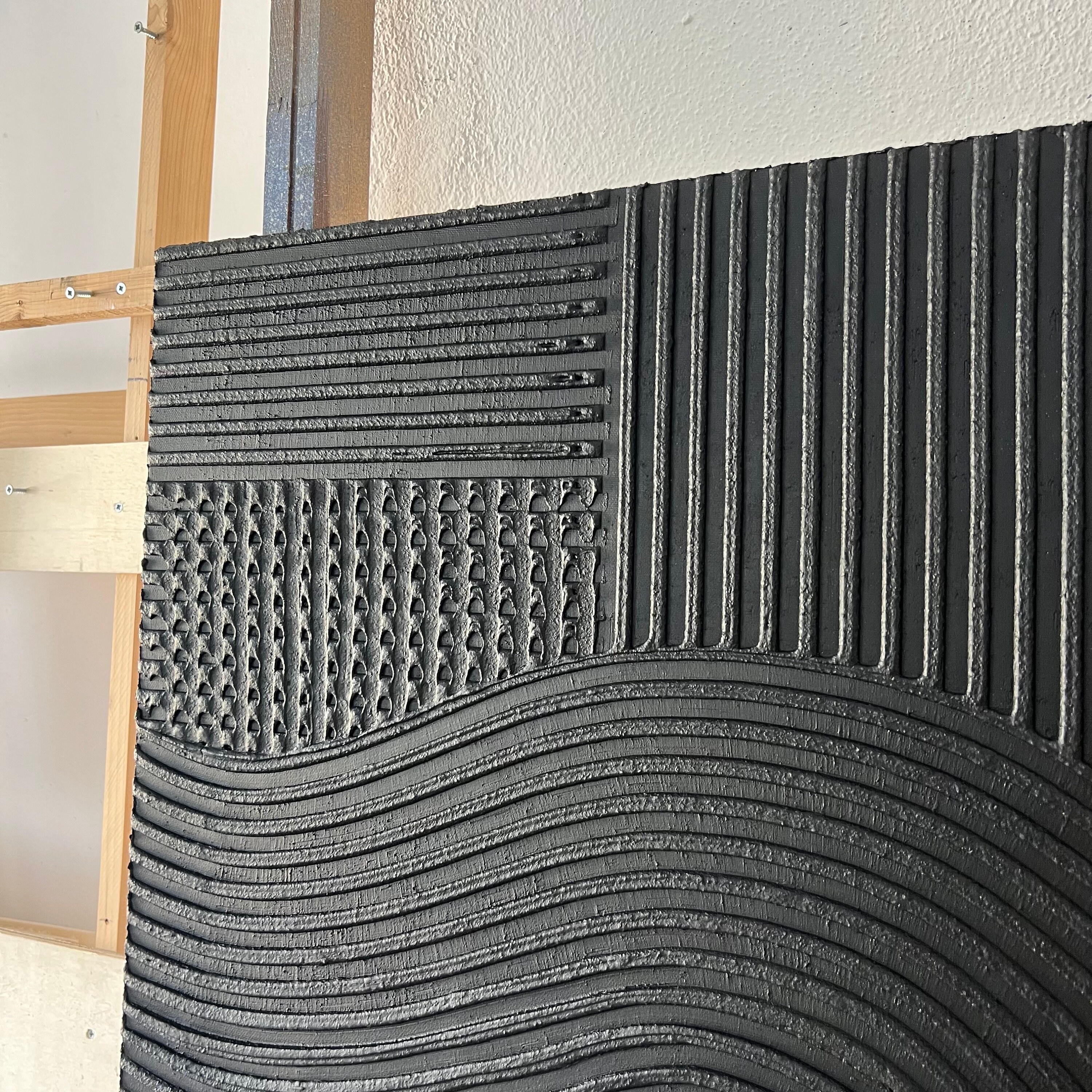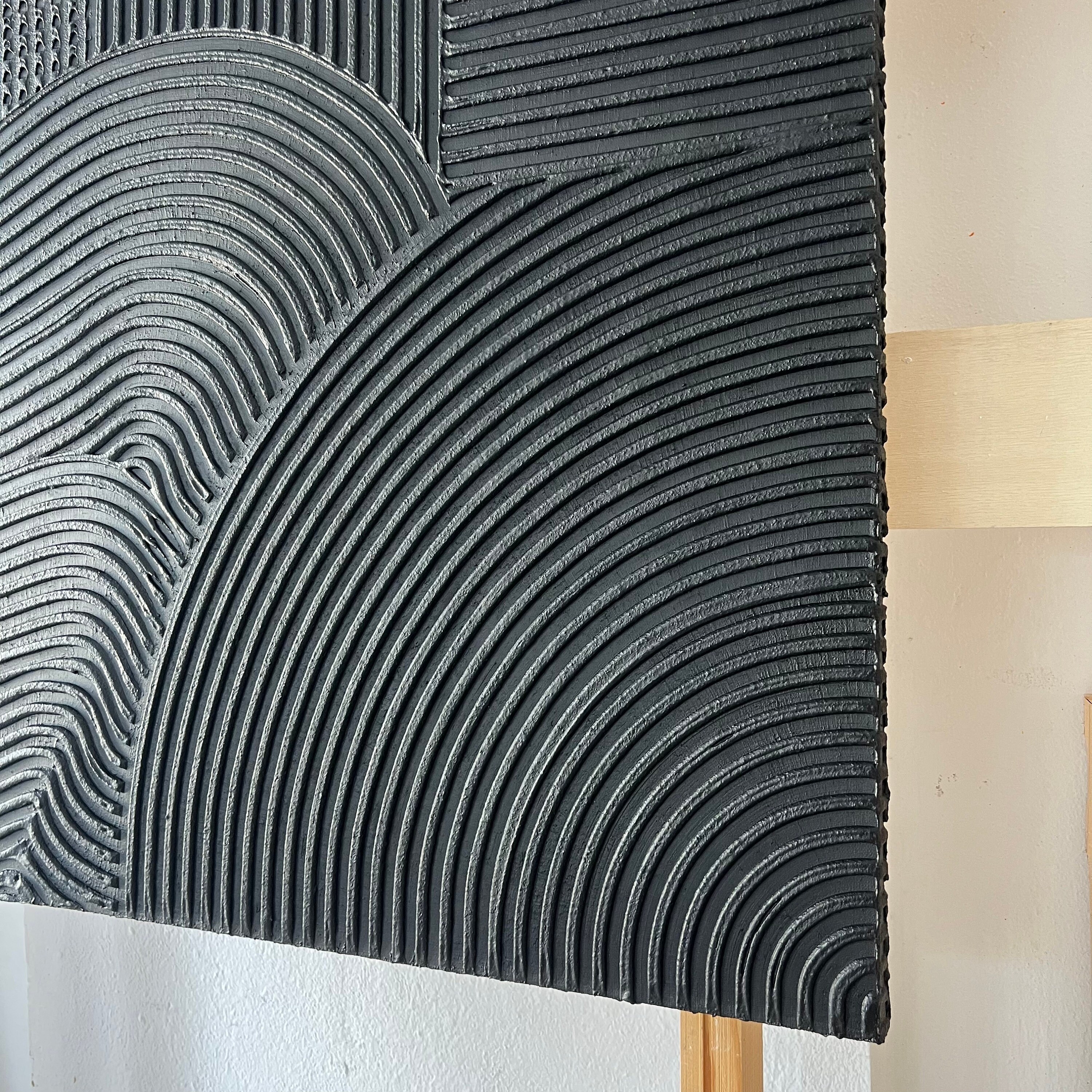 Large Black 3D Texture Painting: Abstract Geometric Plaster Canvas Wall Art