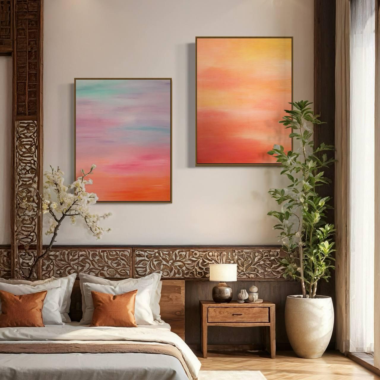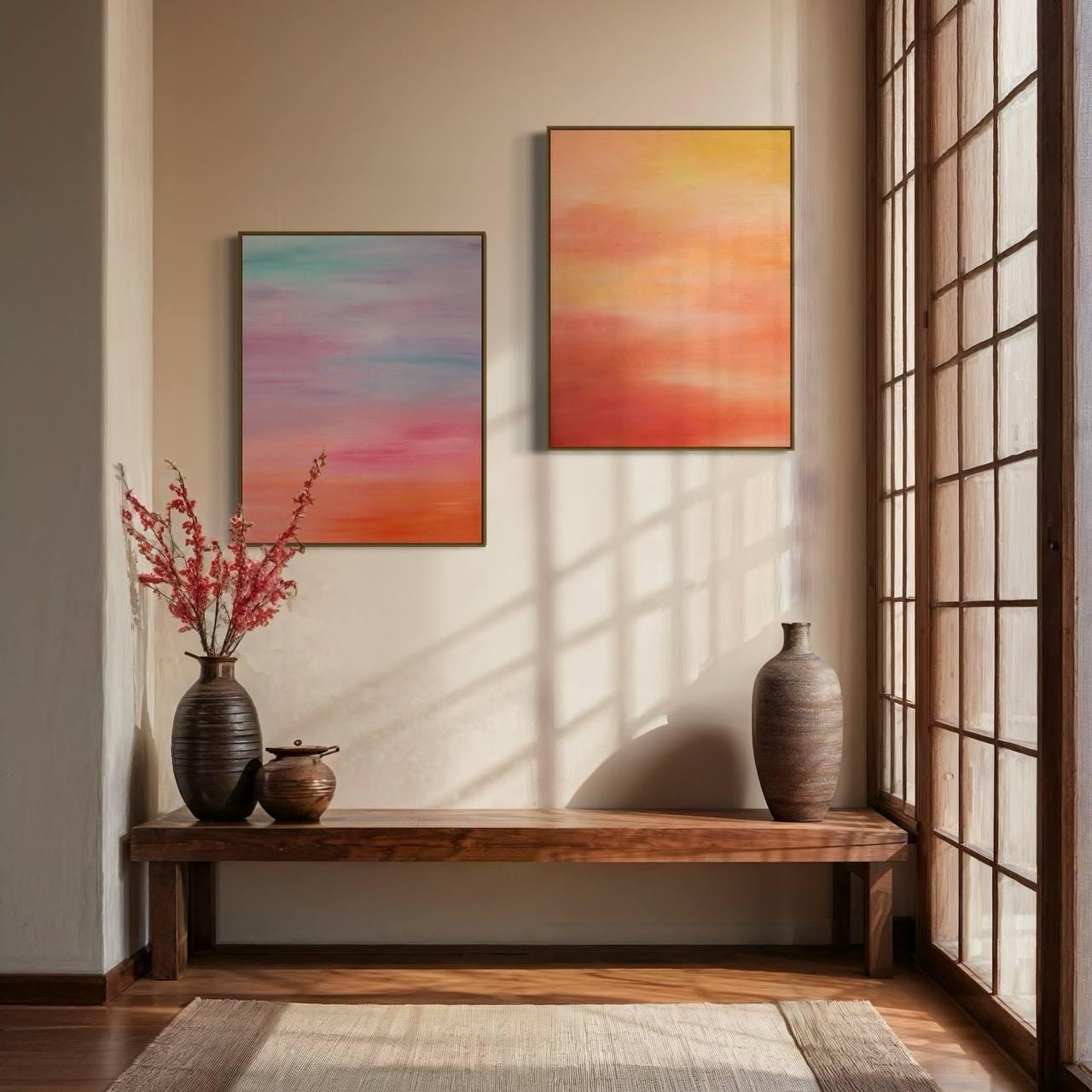Large Painting, Oversize Set of 2 Abstract Wall Art Living Room Modern Landscape,Seascape Canvas Original Painting, Contemporary Sunset Art
