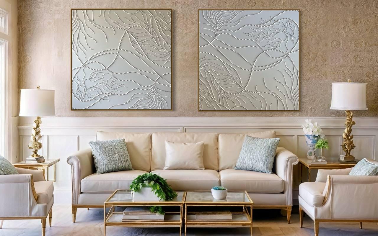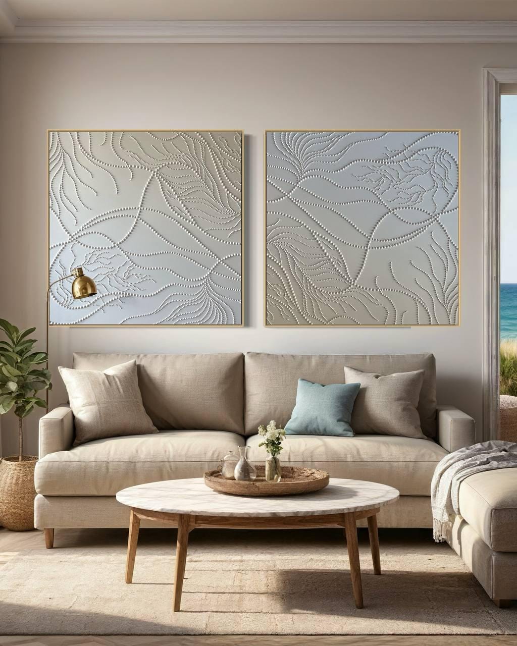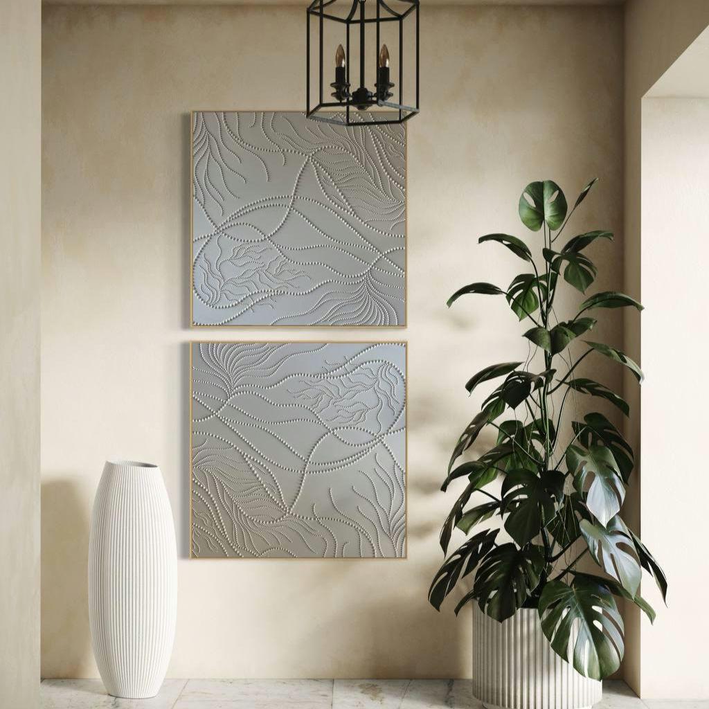 Large set of 2 white 3d points volume plaster wall art, calm texture painting, monochrome white original abstract branch, leaves wall