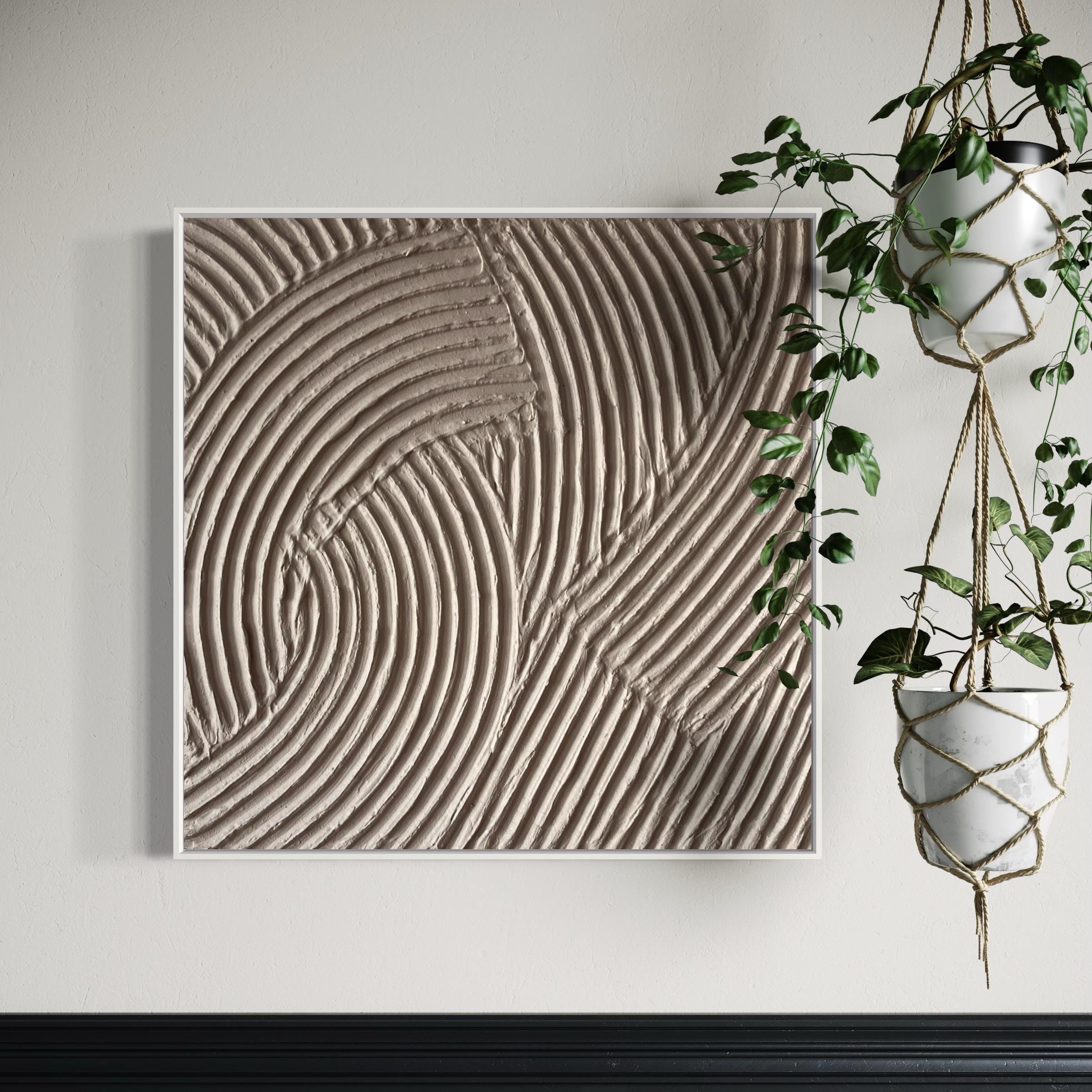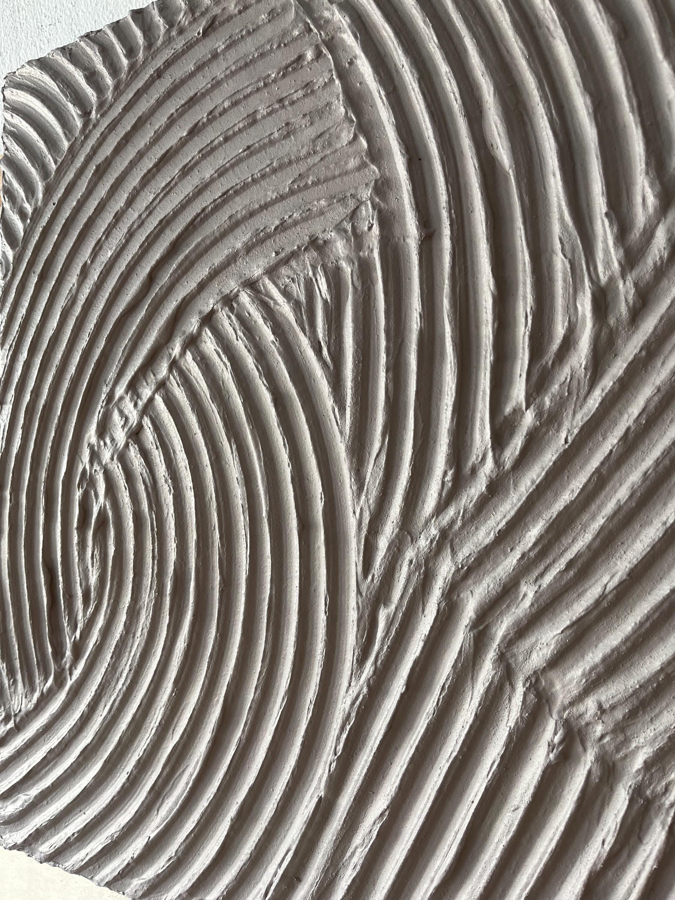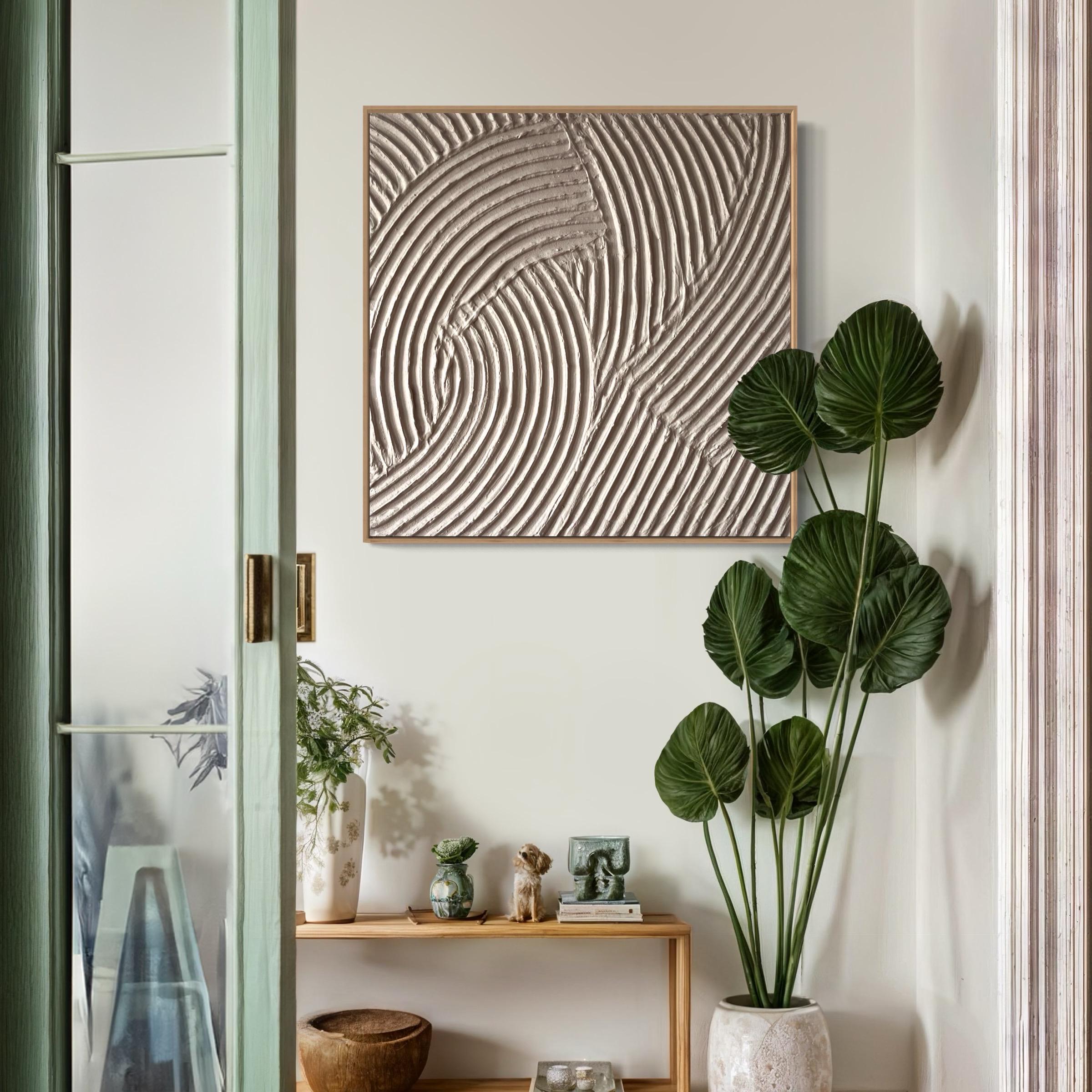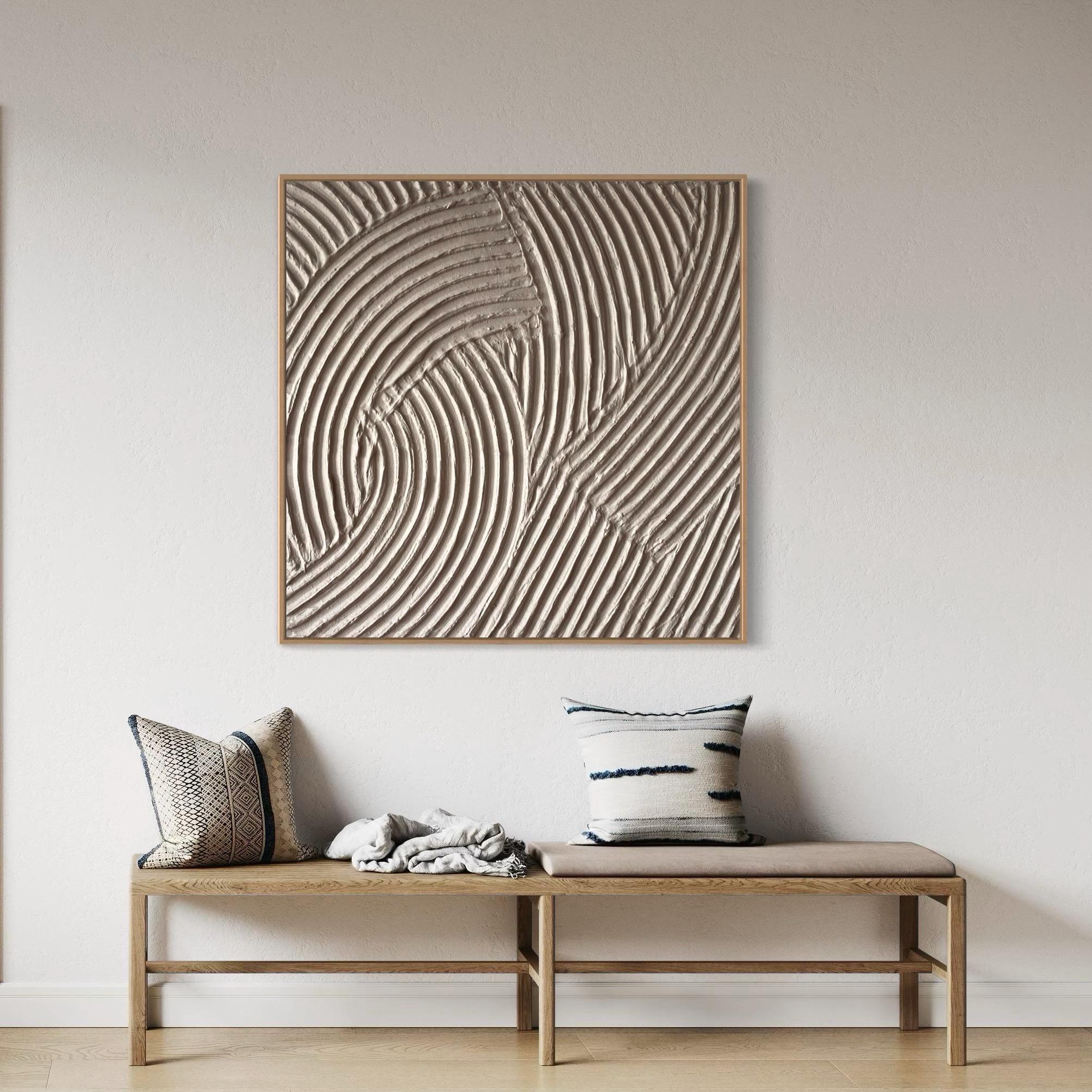 This large minimalist textured painting is completely handmade using sculptural plaster techniques, creating a striking 3D relief surface that plays beautifully with light and shadow.