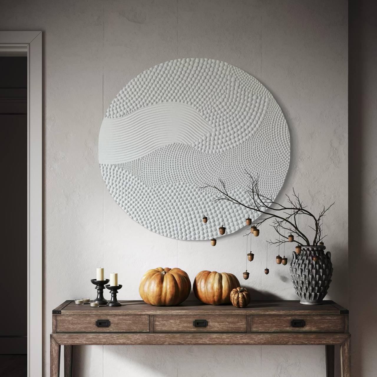 Round textured wall art, minimalist abstract canvas, neutral sculptural painting for modern boho interiors