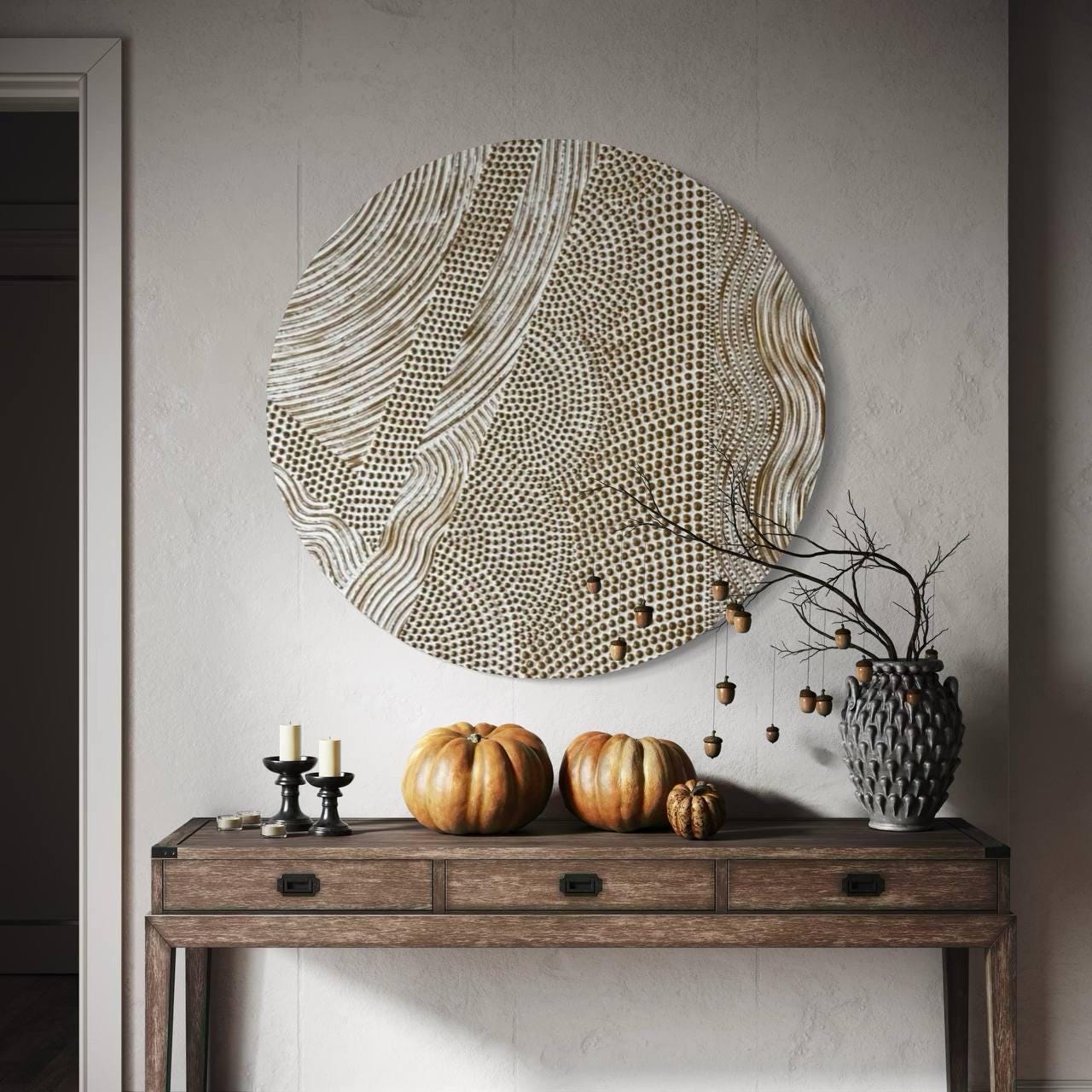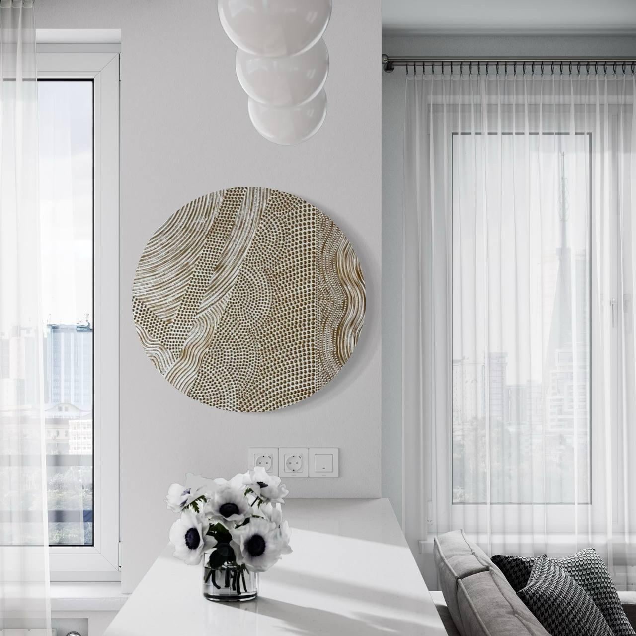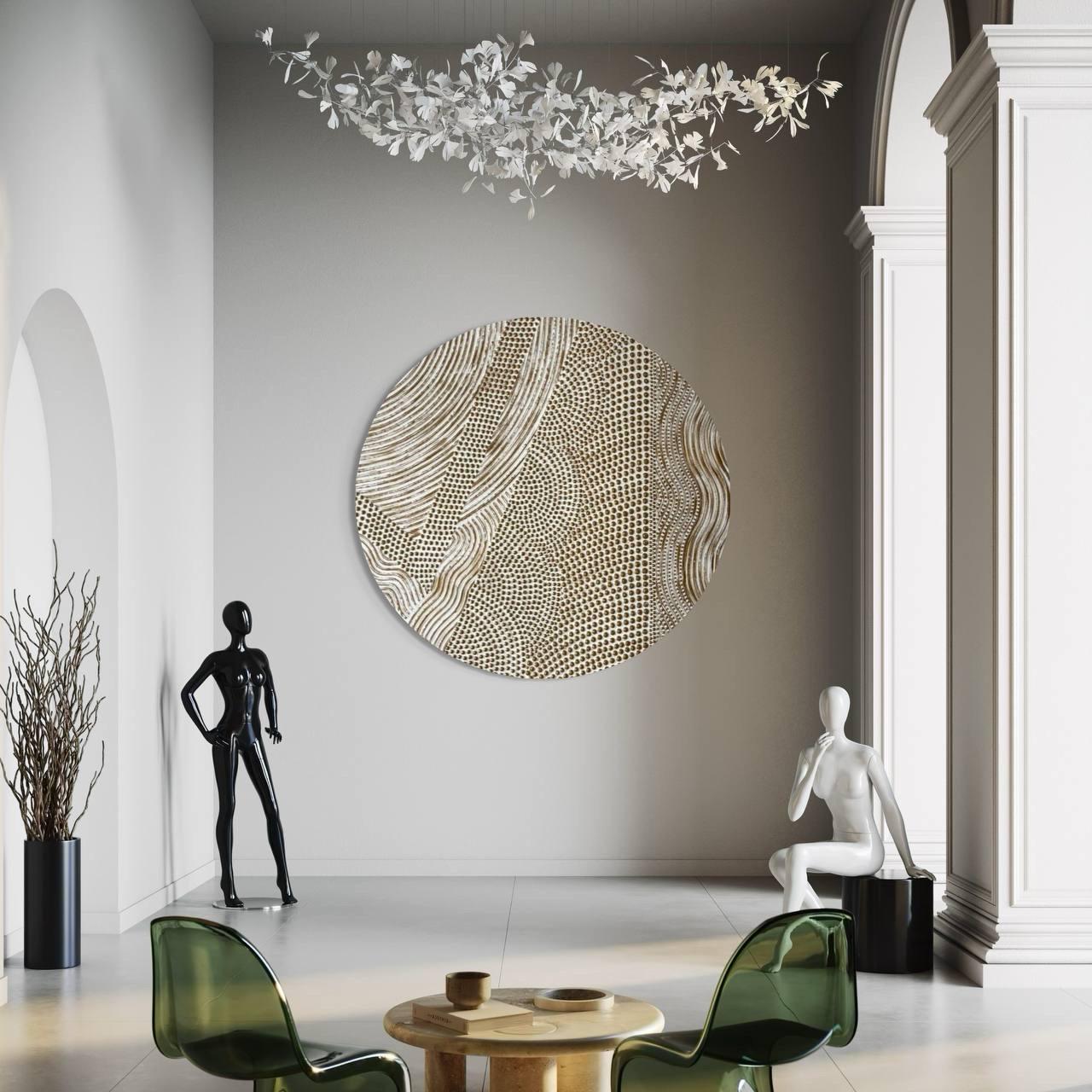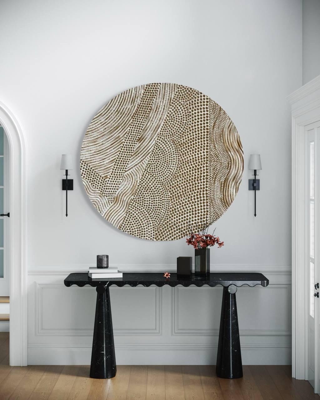 Designed as a statement artwork, this round wall decor works beautifully in contemporary, minimalist, and architectural spaces.