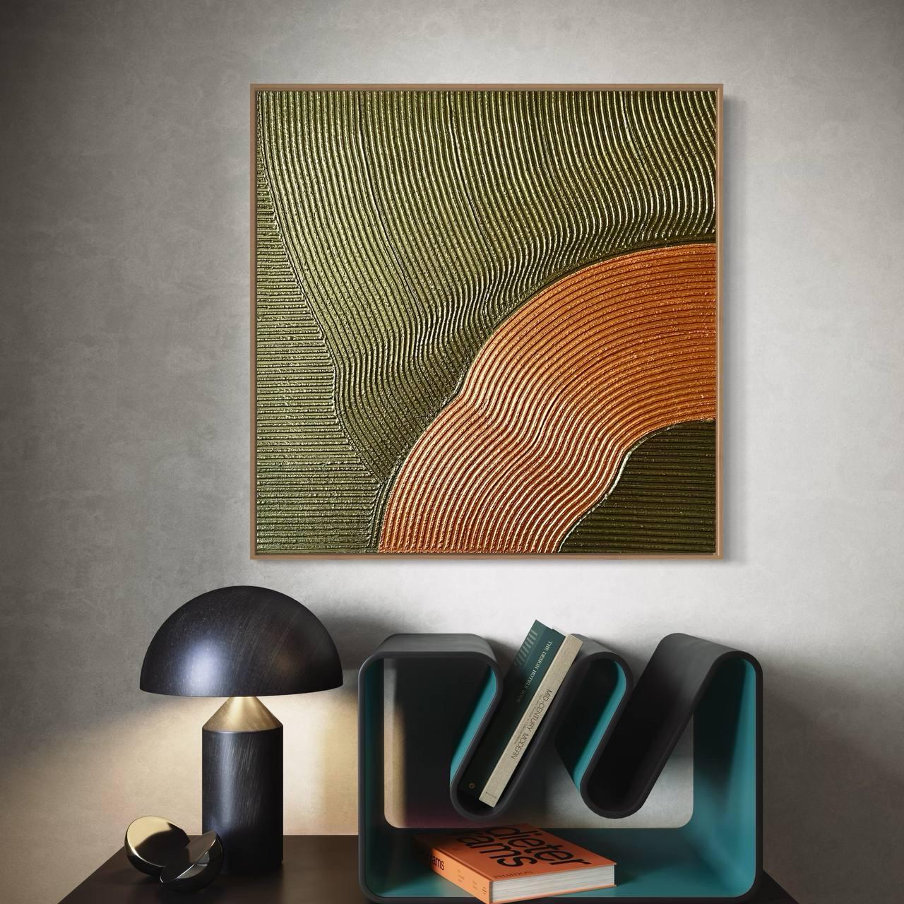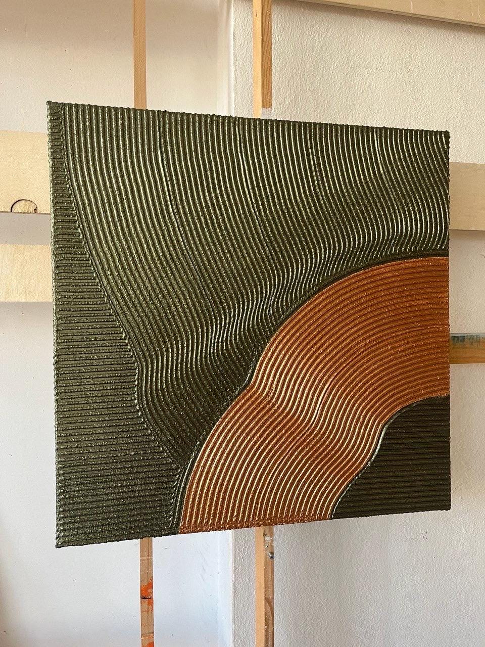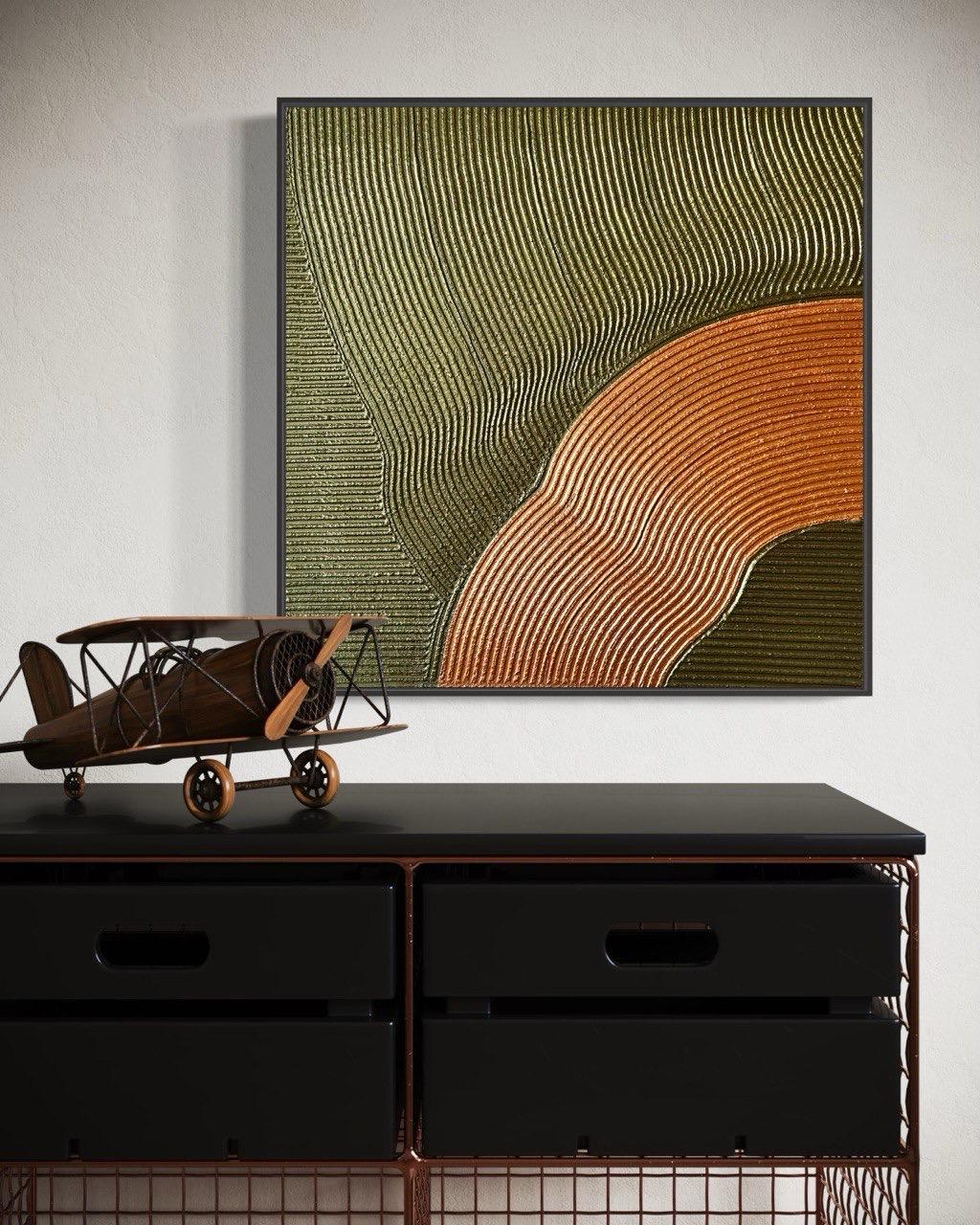 Green metallic 22”x22”/ 56cmx56cm cooper accent 3d plaster textured abstract painting ready to ship oversize volume wall art shine picture for hallway