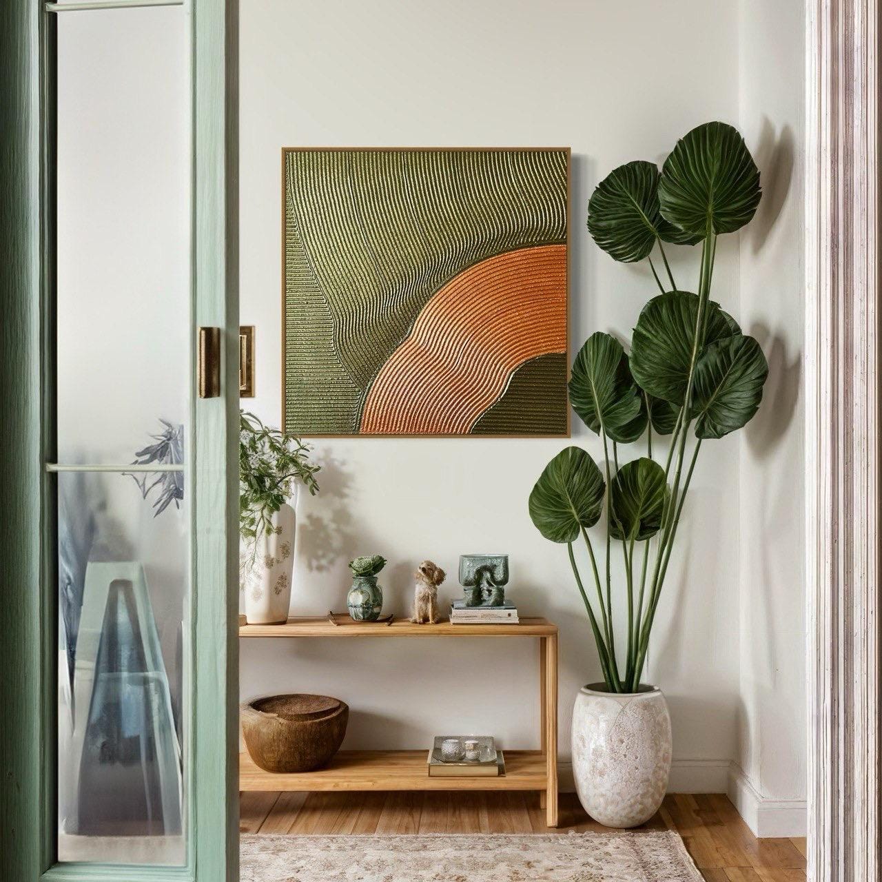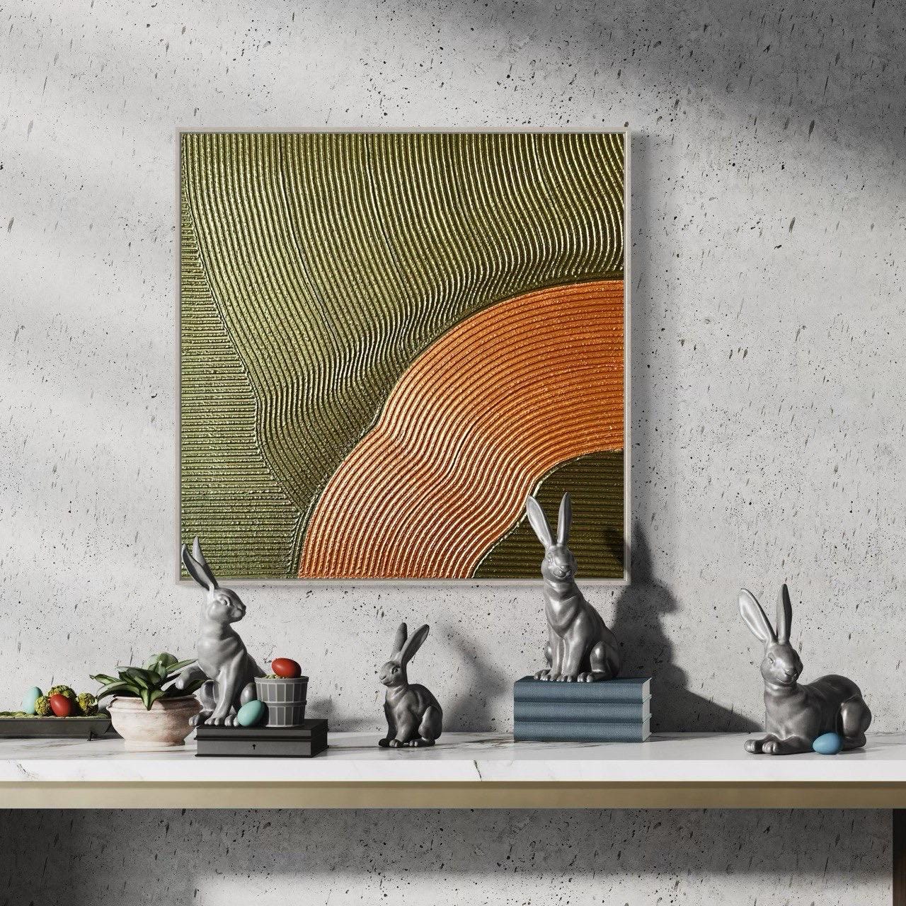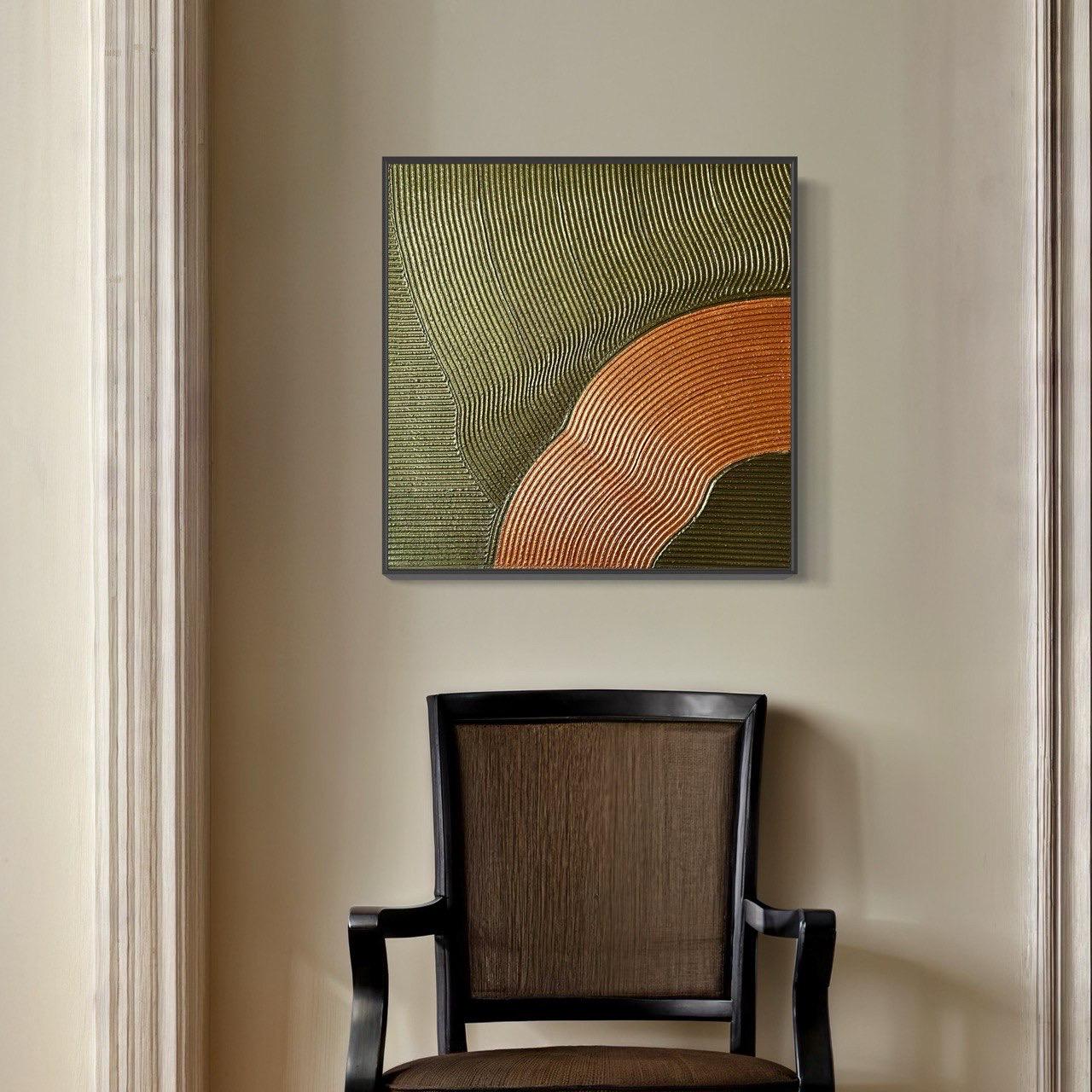 Green metallic 22”x22”/ 56cmx56cm cooper accent 3d plaster textured abstract painting ready to ship oversize volume wall art shine picture for hallway