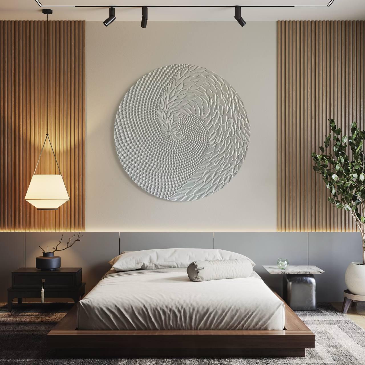 Its sculptural surface interacts beautifully with natural light, creating subtle shadows and a calming organic feel.